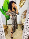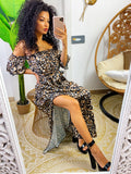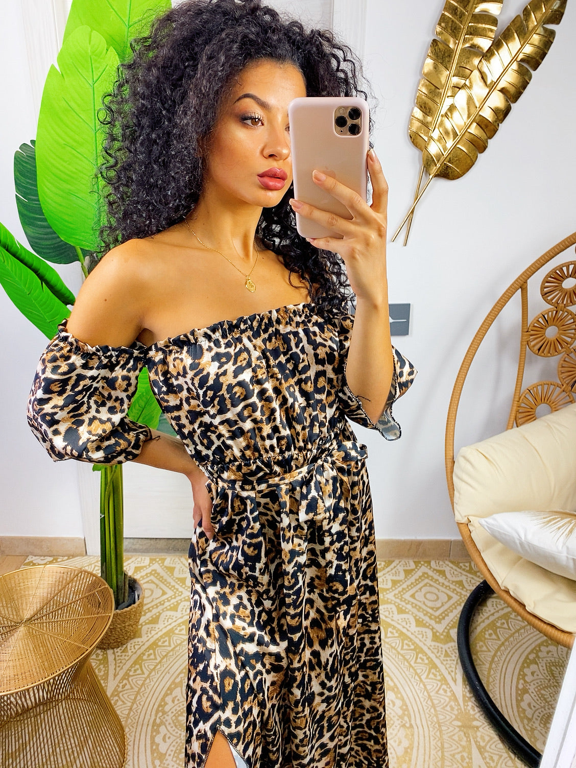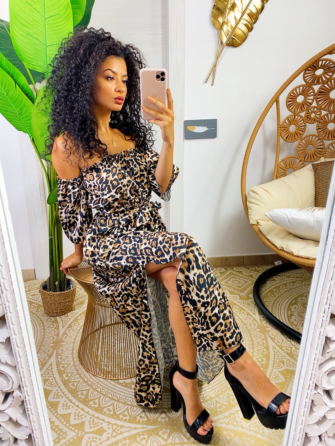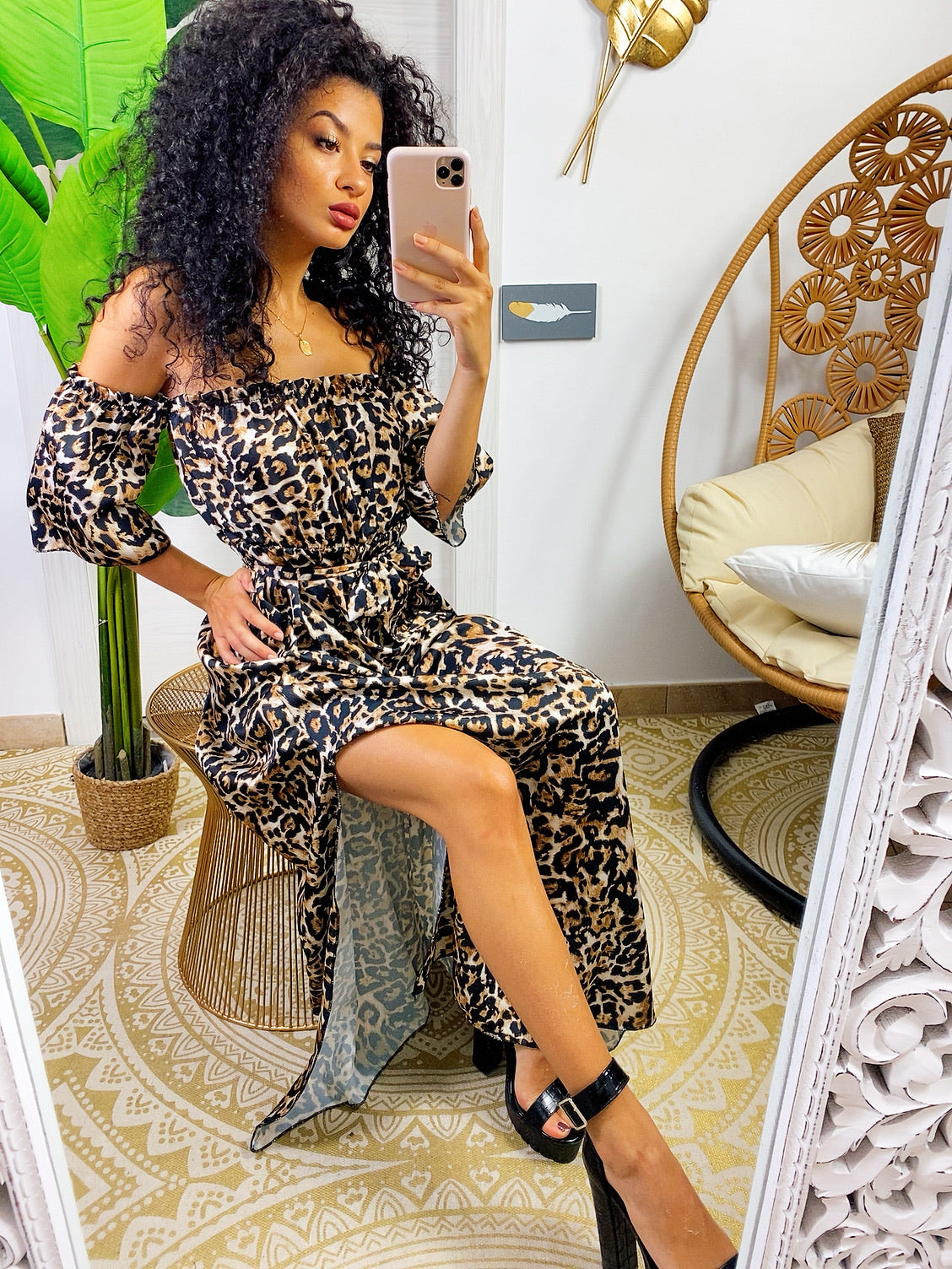 Abito A fantasia maculato, Con manica attaccata e spacco sopra al ginocchio media lunghezza.