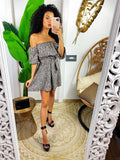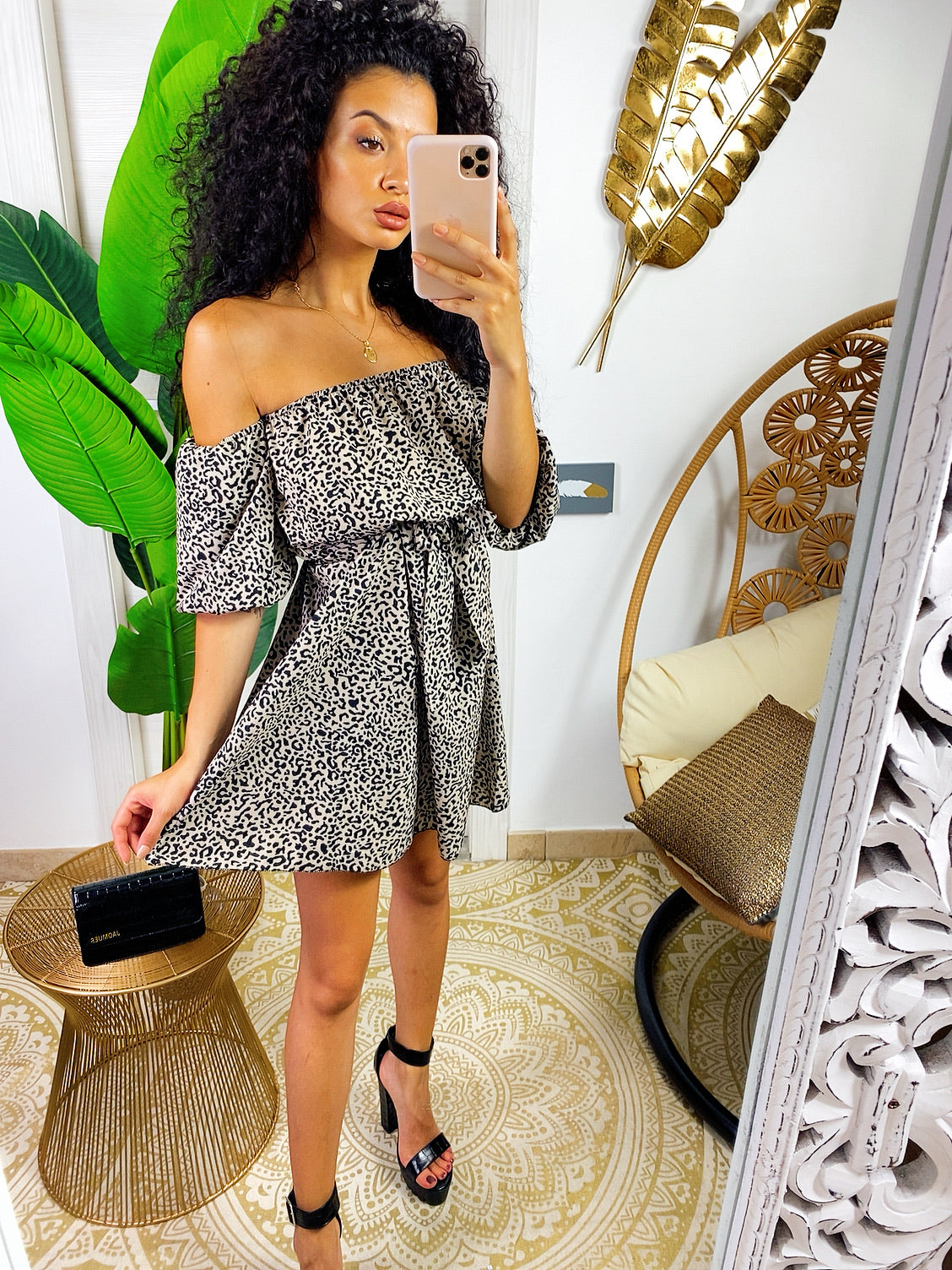 Abito maculato con trama piccola con scollo a barchetta. Manichina e fusciacca in vita.