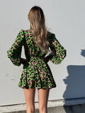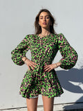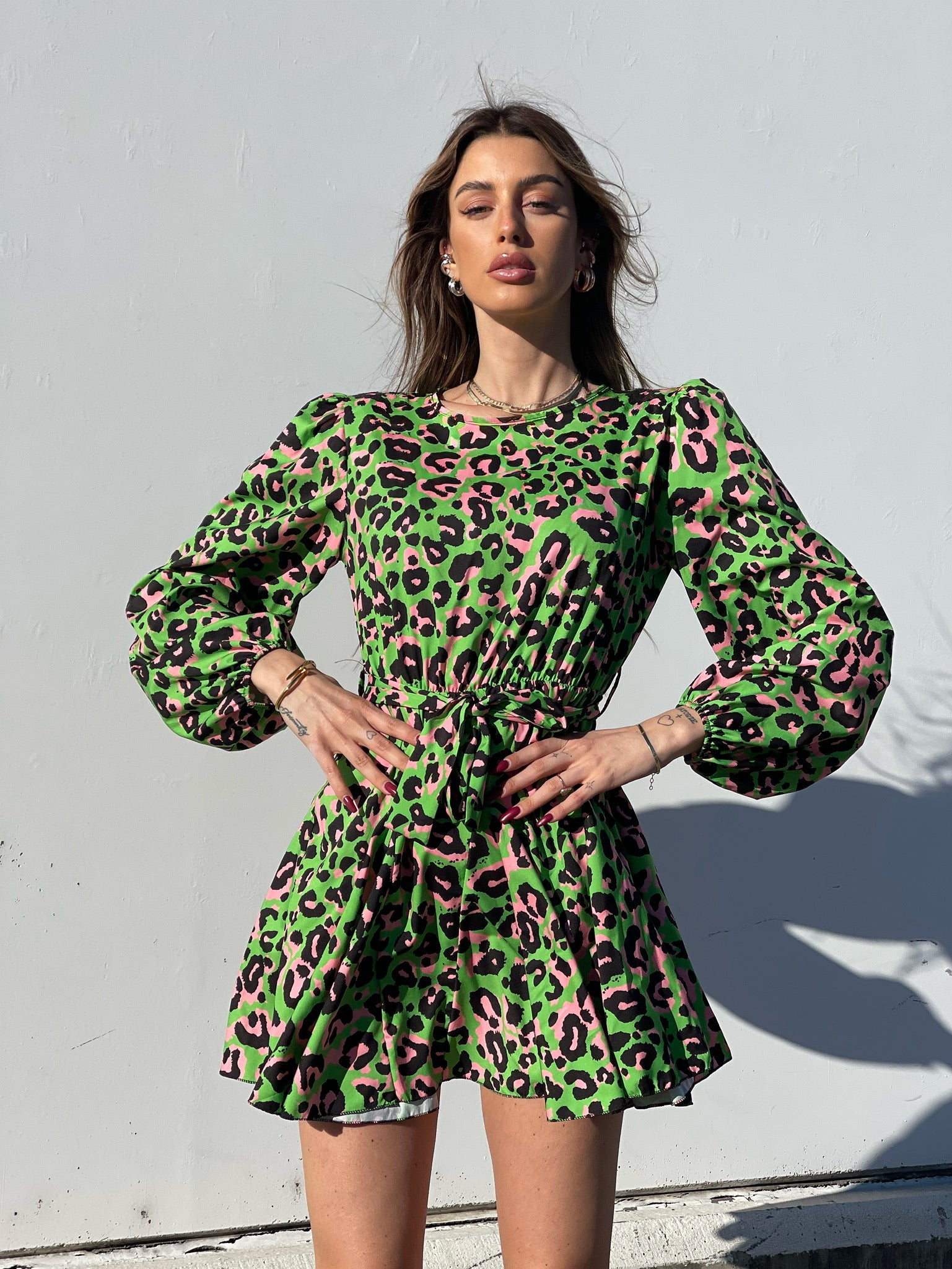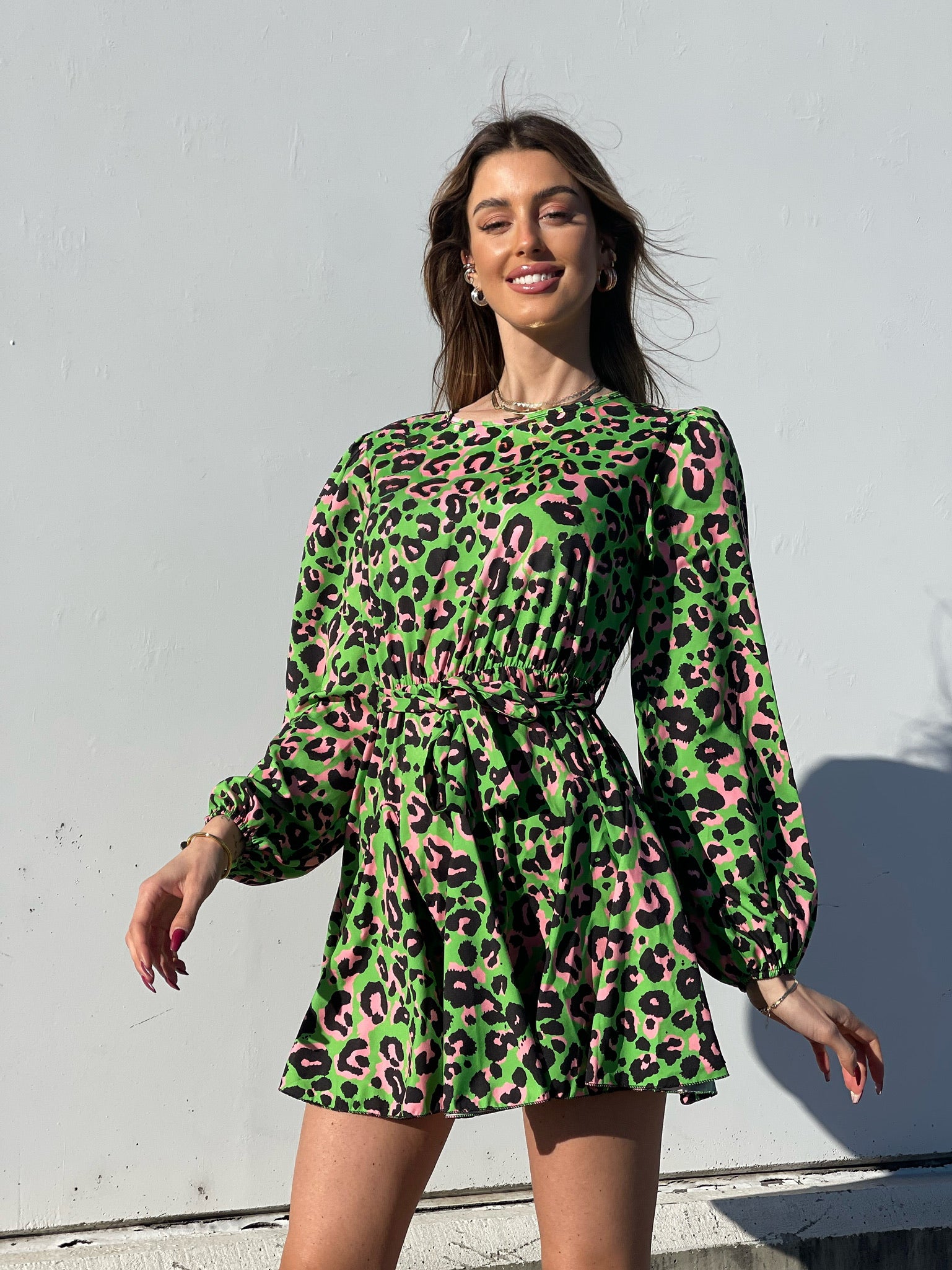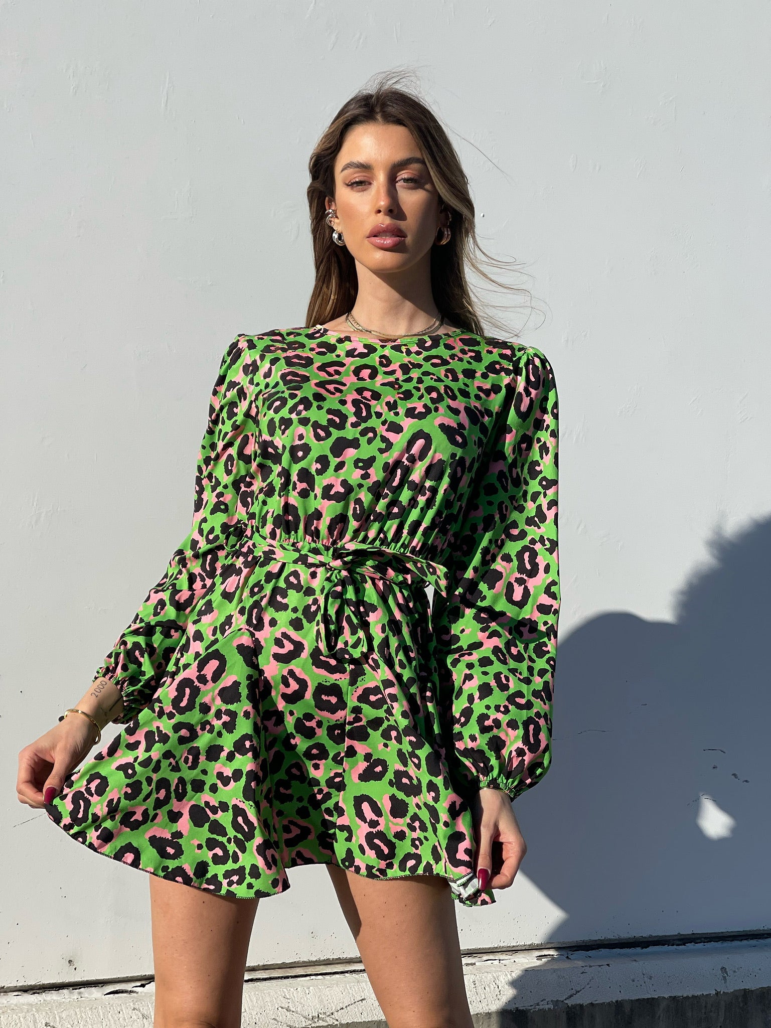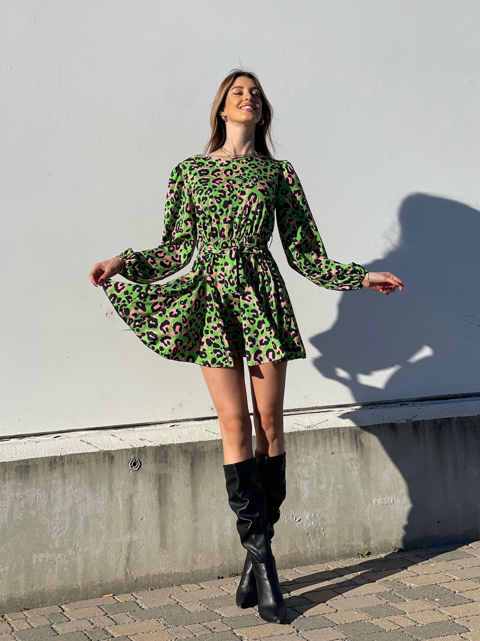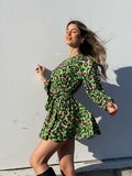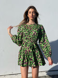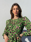 Abito in fantasia maculata con gonna a ruota ampia. Cintura in vita tono su tono.