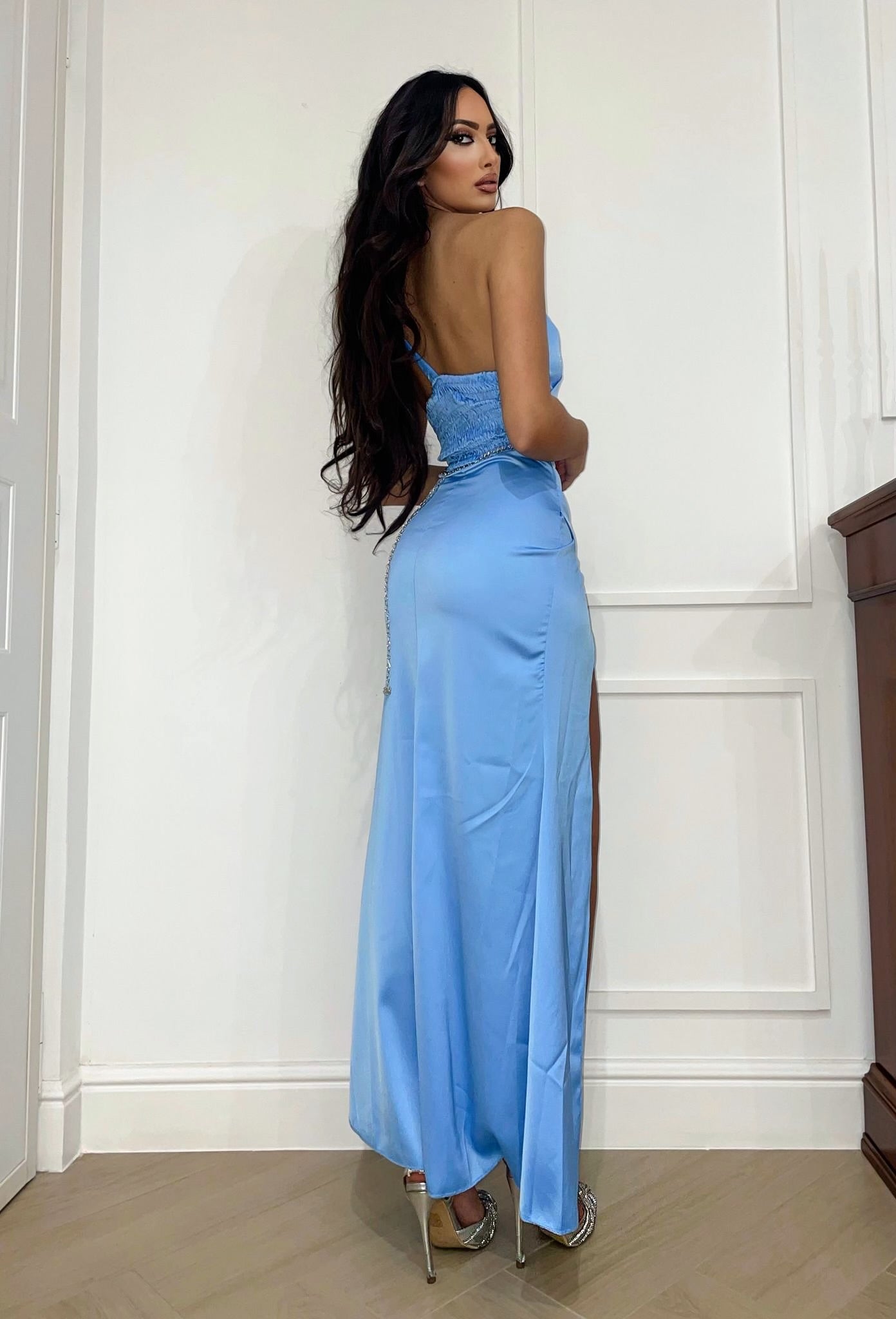 Abito monospalla in raso con maxi spacco e coppe