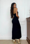 Abito nero con doppio modo di utilizzarlo. Aderente e elasticizzato con spacchetto. Con coppe e zip