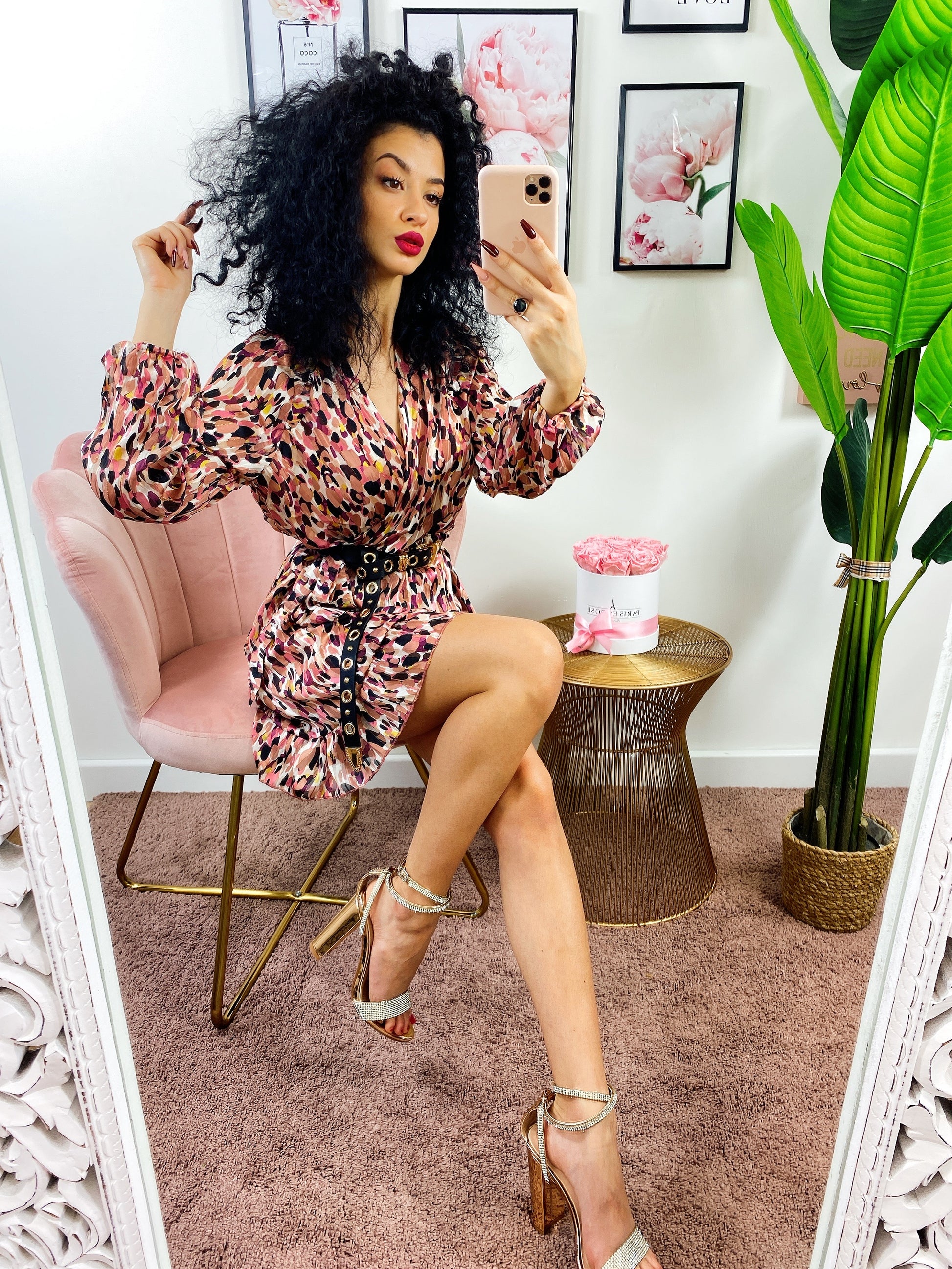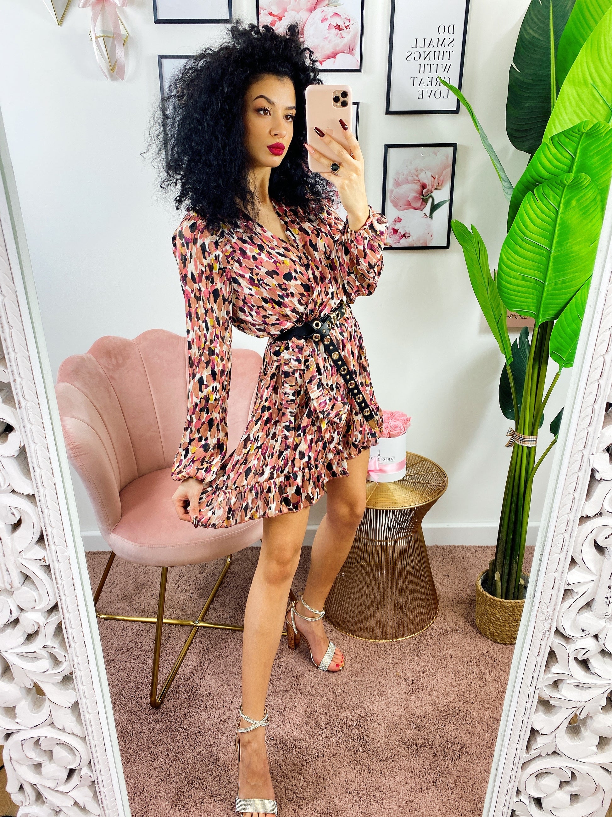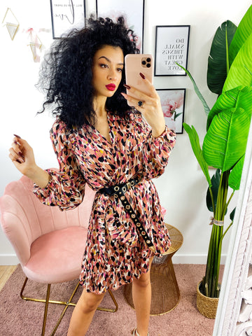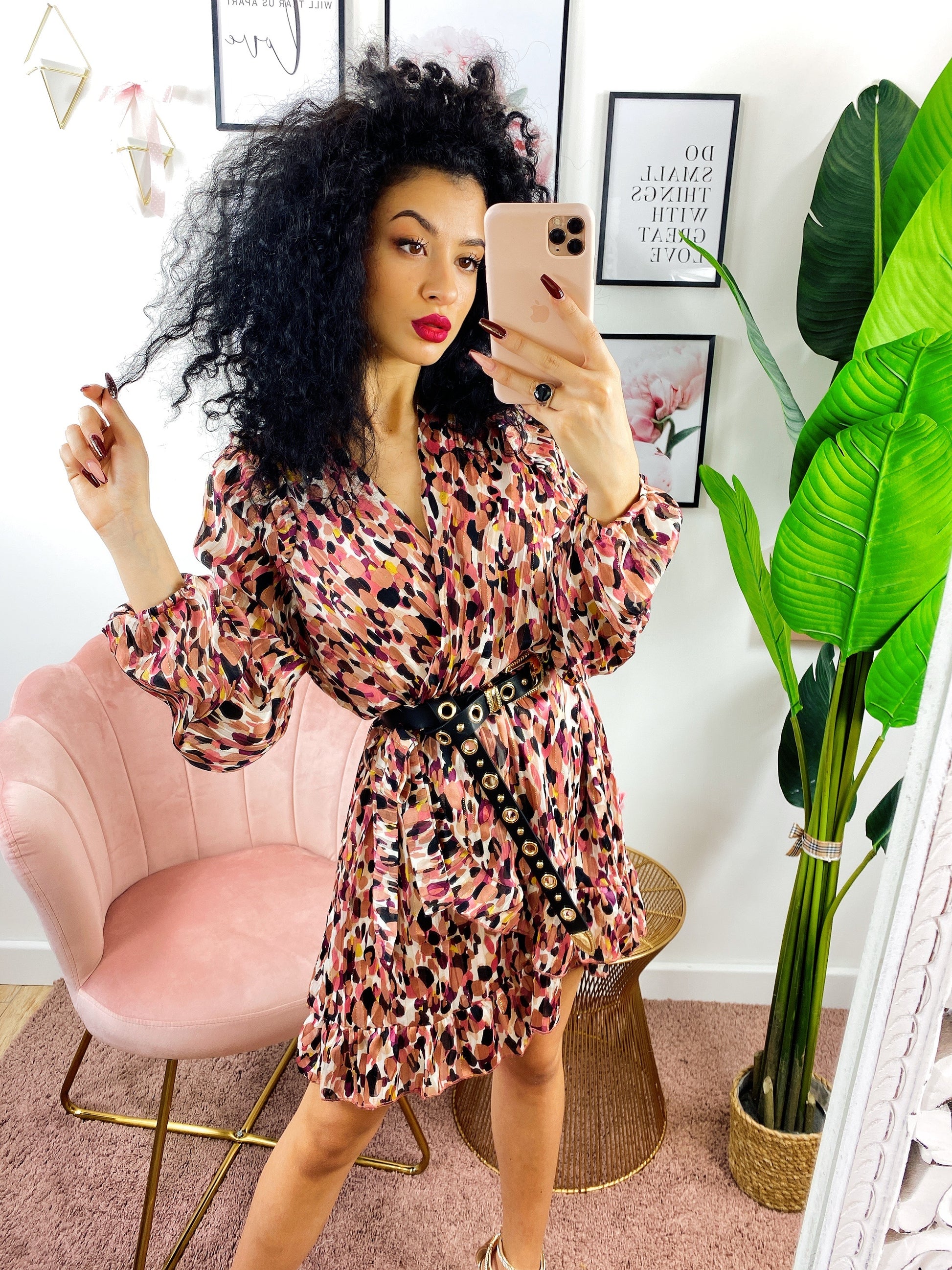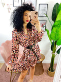 Abito maculato Rosso con inserti Glitter, elasticizzato in vita dotato di fiocco con scollo a V e fodera interna ottima qualità.