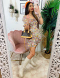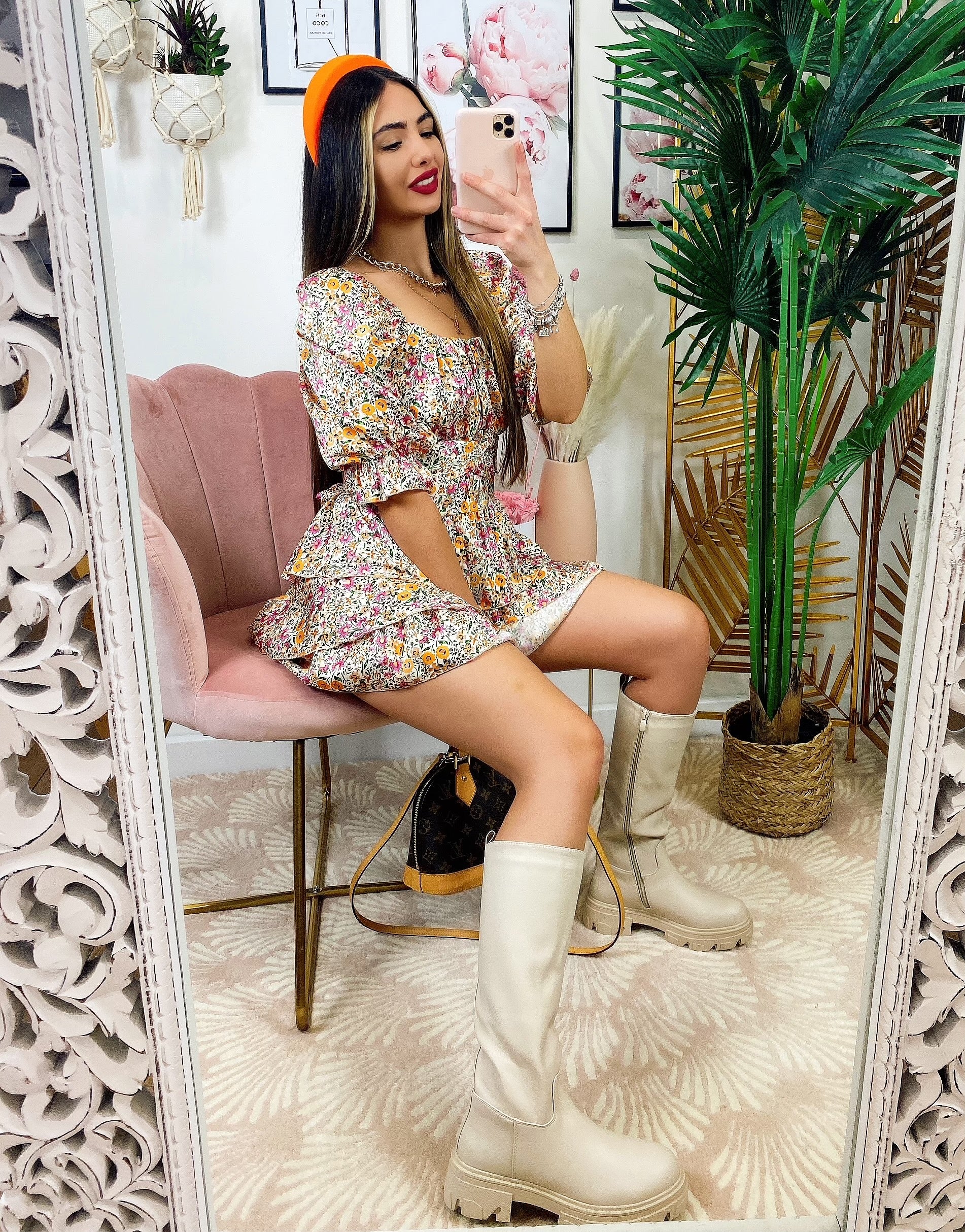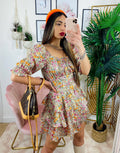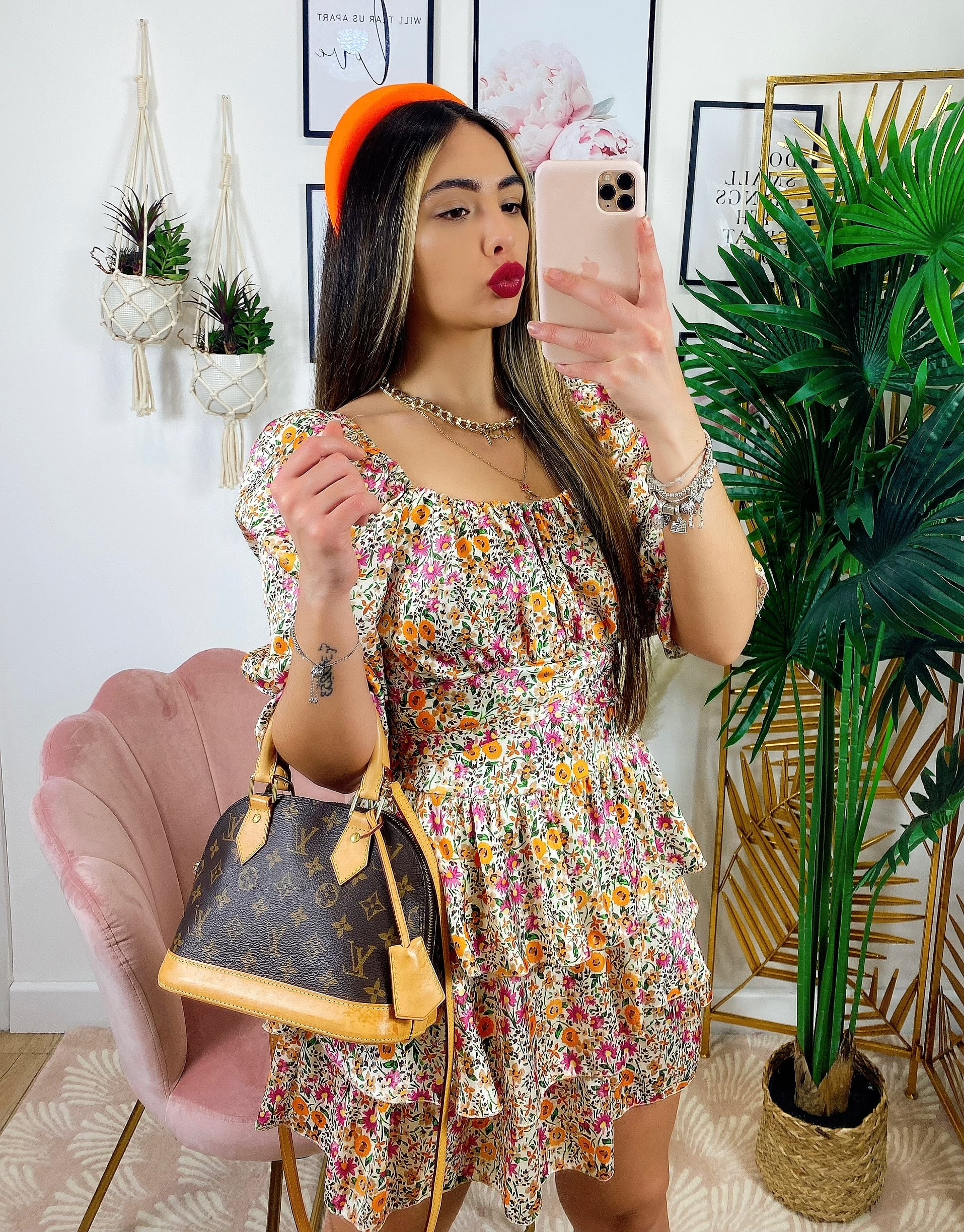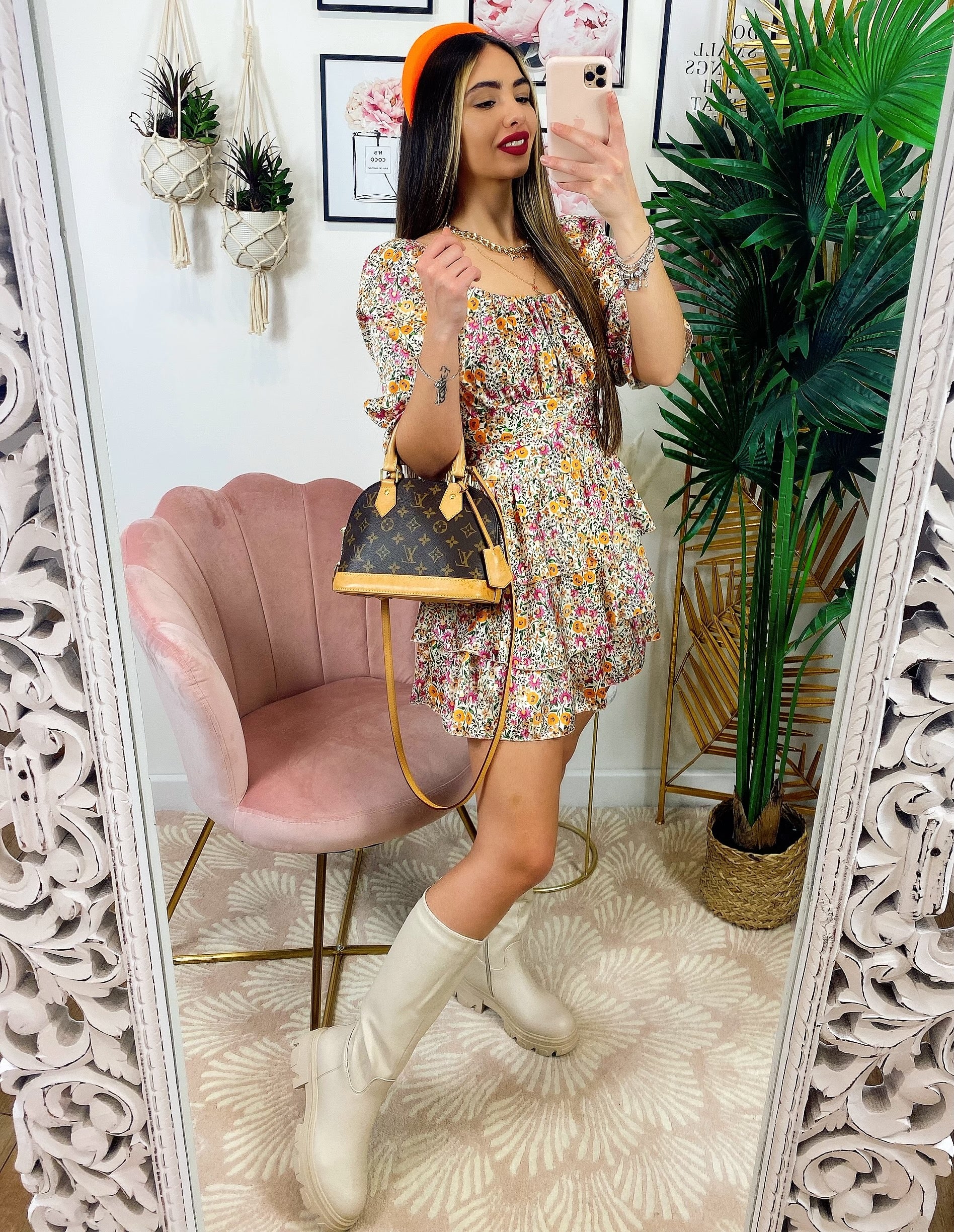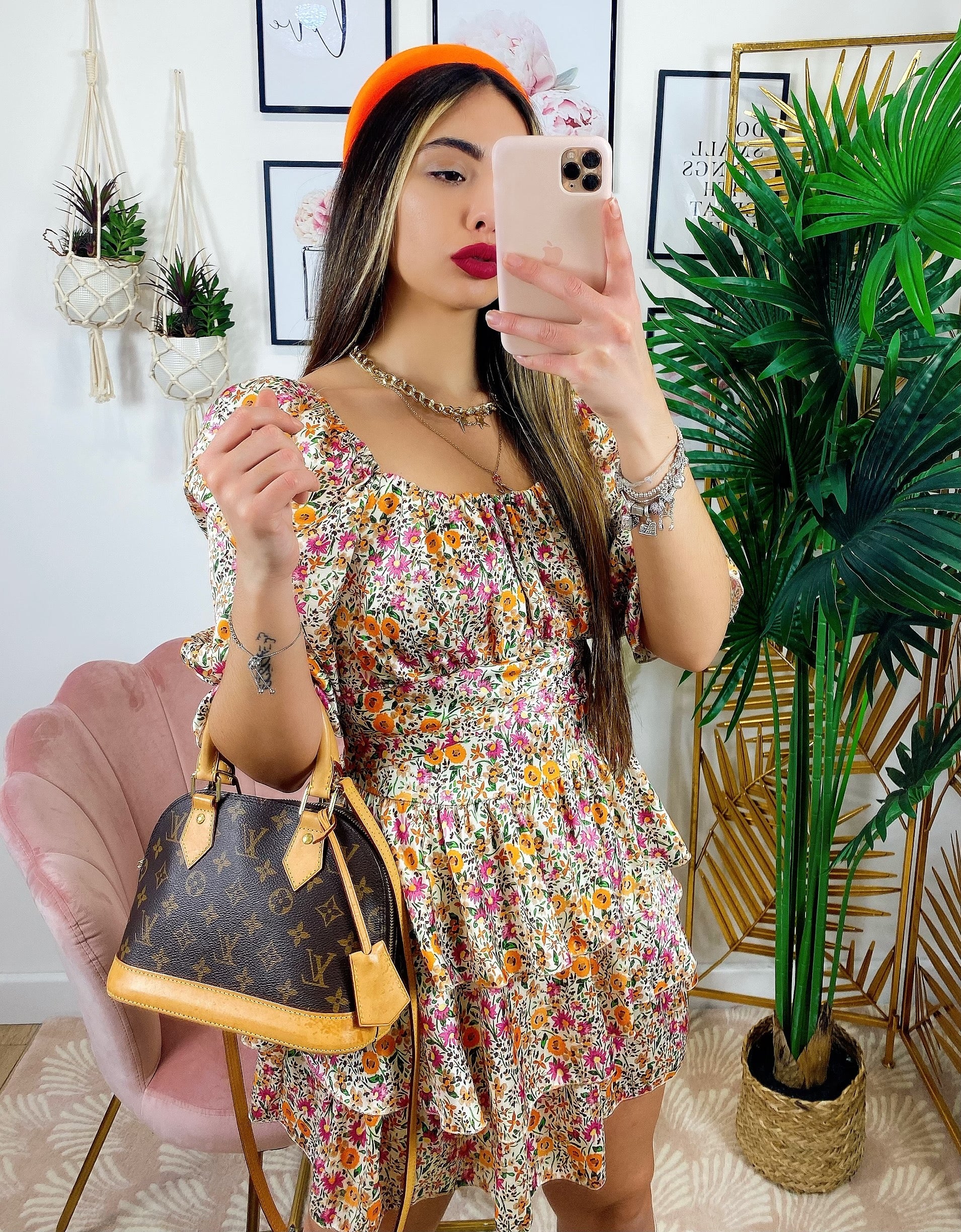Abito scollo a barchetta fiorì arancio E cintura compresa, elasticizzato in vita e comodo.