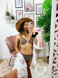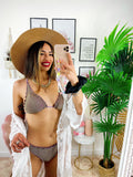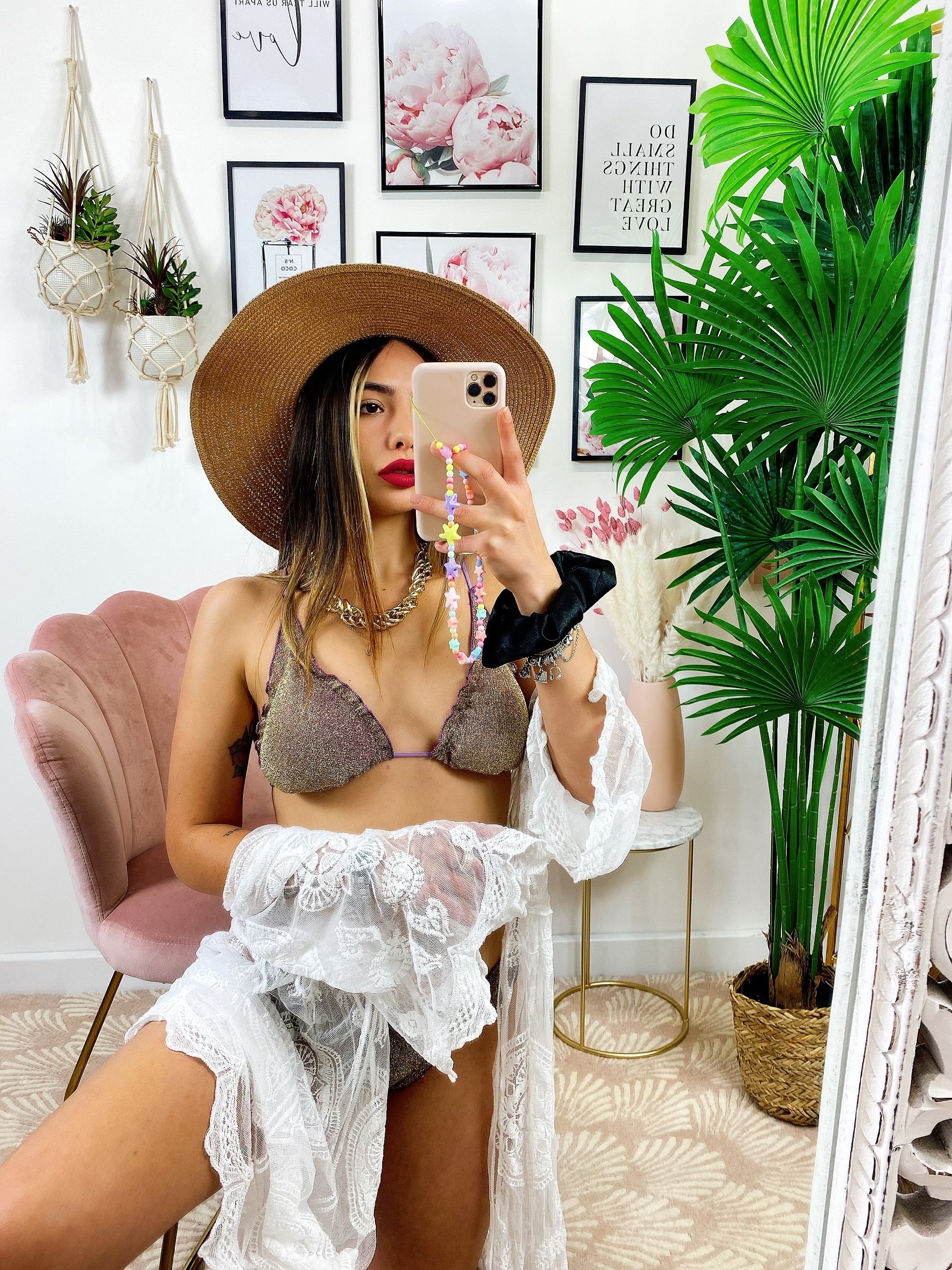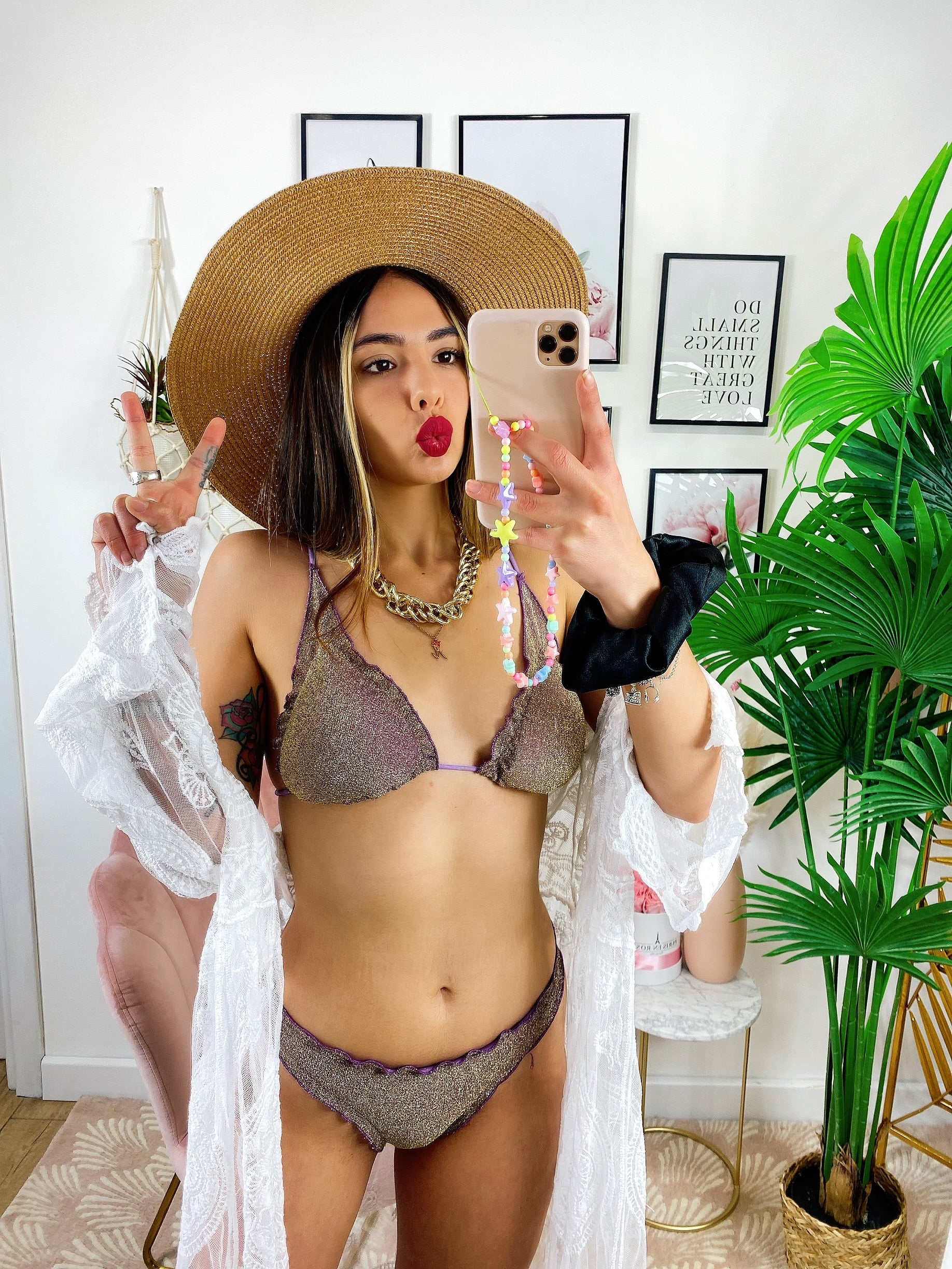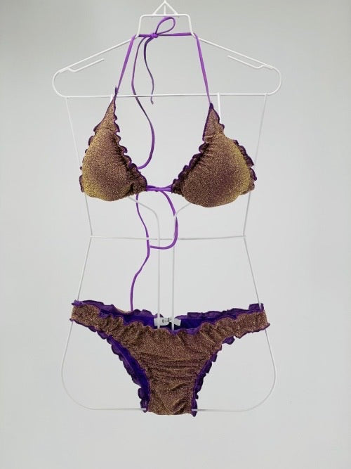 Bikini due pezzi con arricciature lilla, va bene da xs a M.