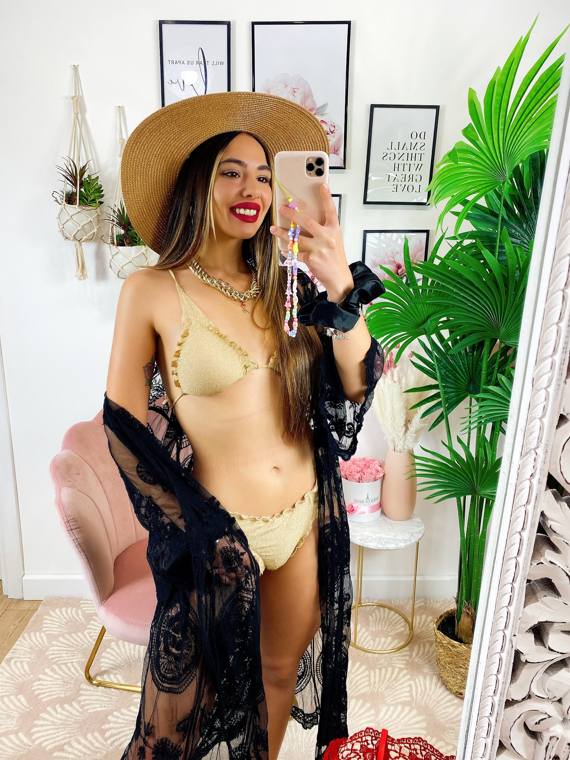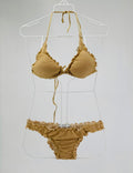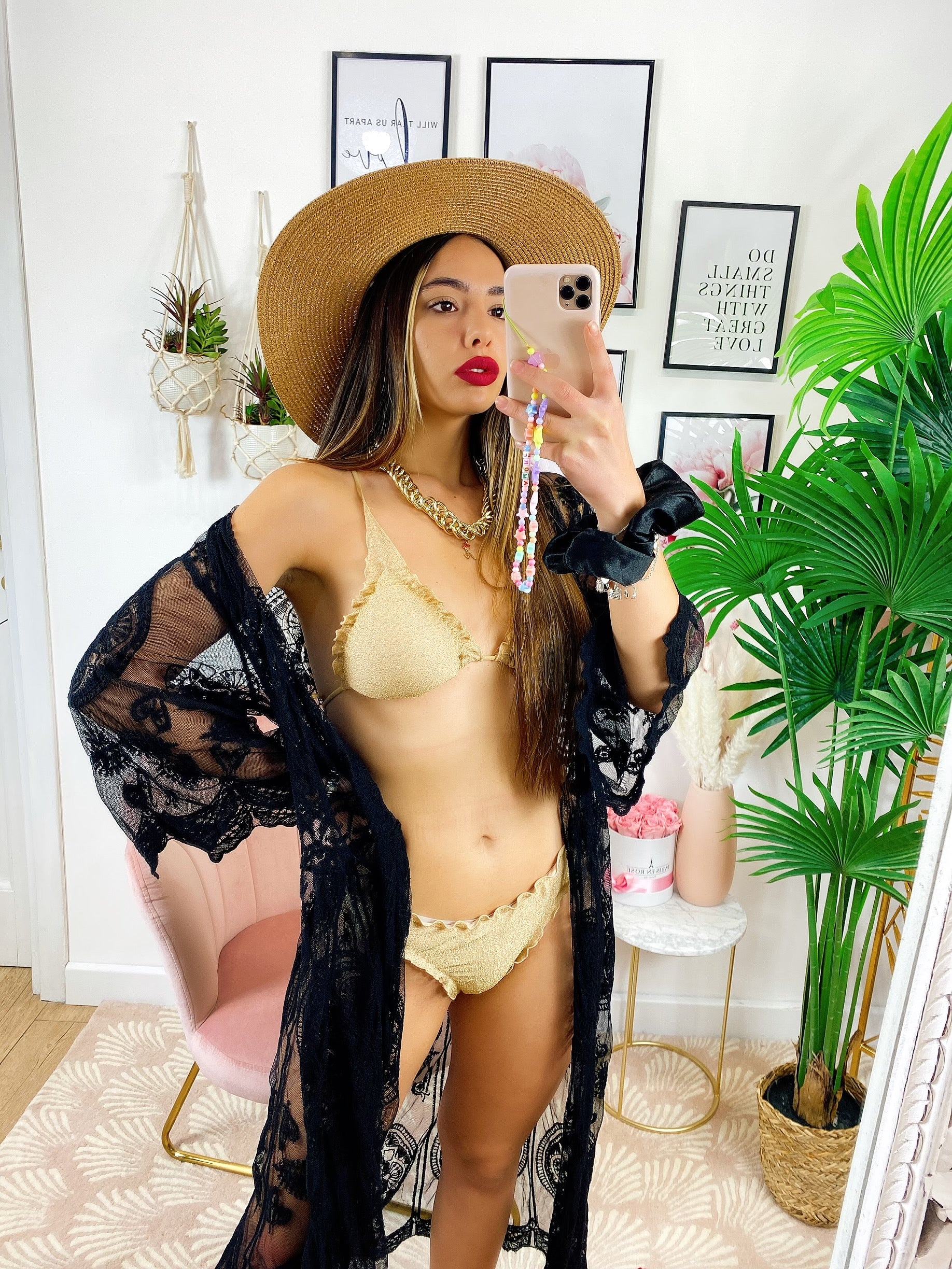 Bikini due pezzi con arricciature oro, va bene da xs a M.