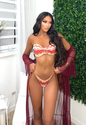 Bikini tre pezzi con pareo e mutanda leggermente sgambata.