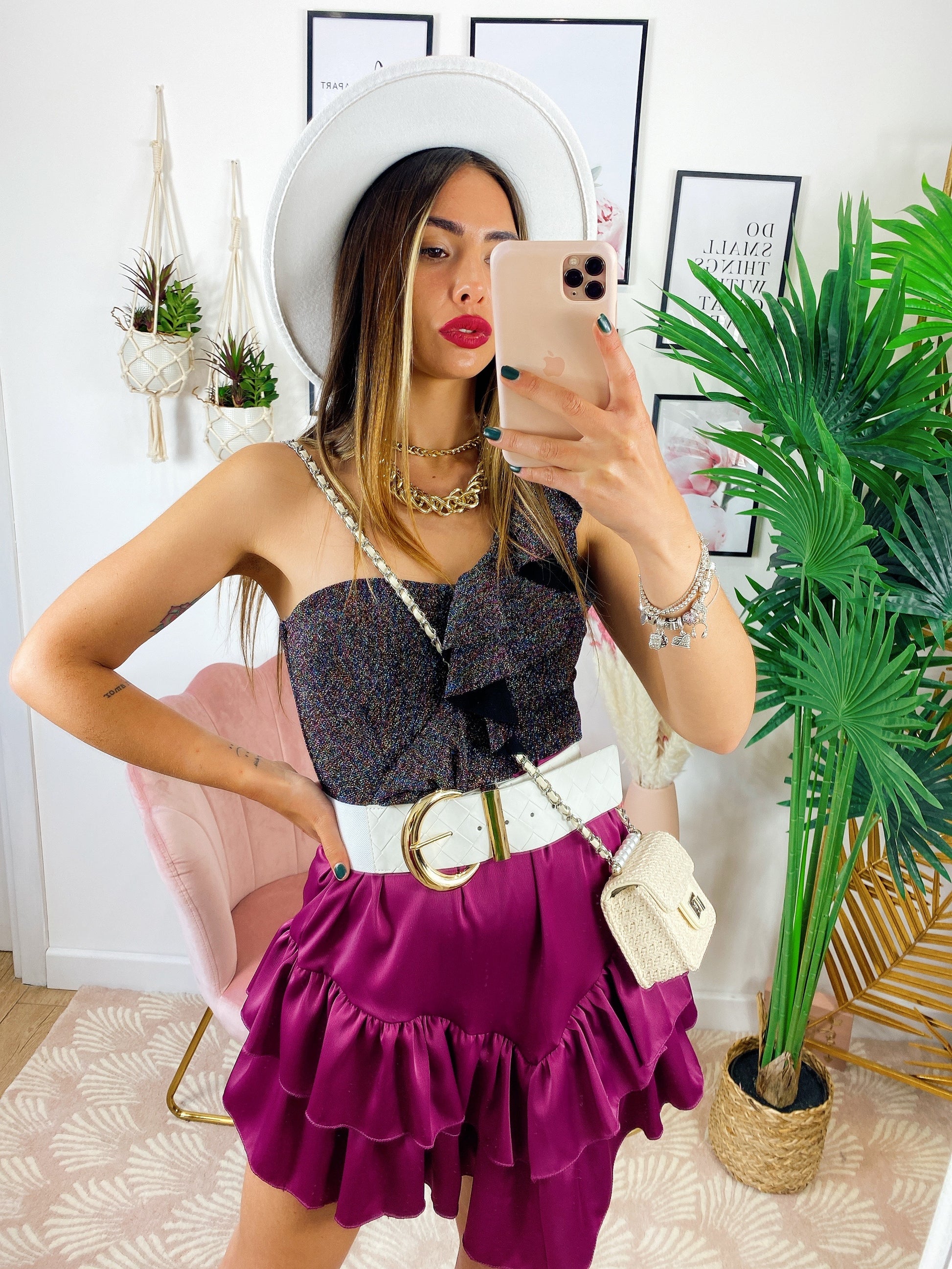 Body o costume in tessuto glitterato foderato. Lacci sul dietro regolabili. Bellissimo e alla moda.