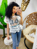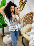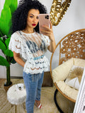 Camicetta in delicatissimo pizzo smanicata. Elastico in vita e rouche. Perfetta per i caldi estivi