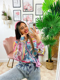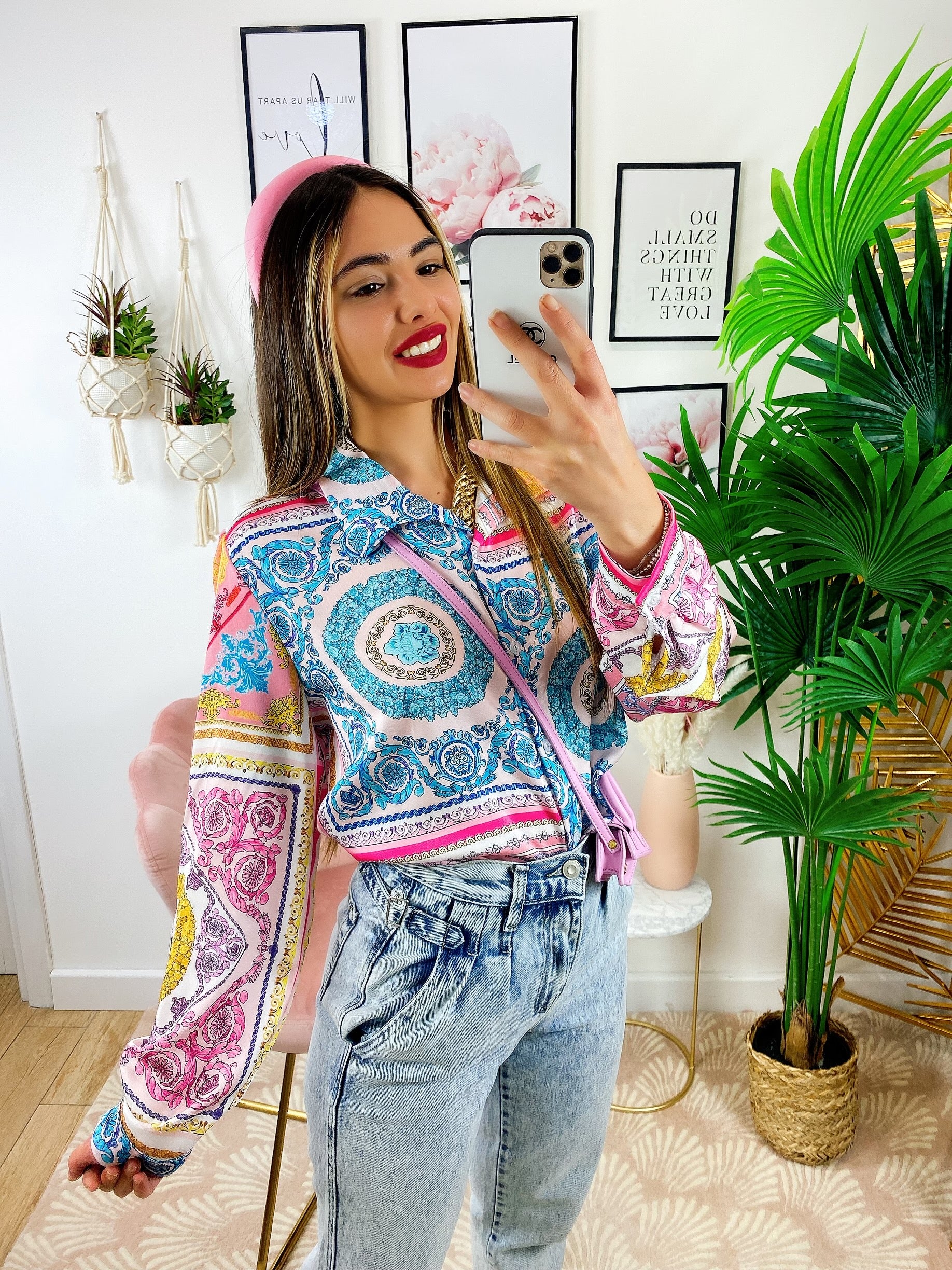 Camicia etnica sfumature Rosa e celesti, tessuto ottimo, manica leggermente larga e chiusura a polsino.