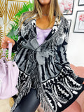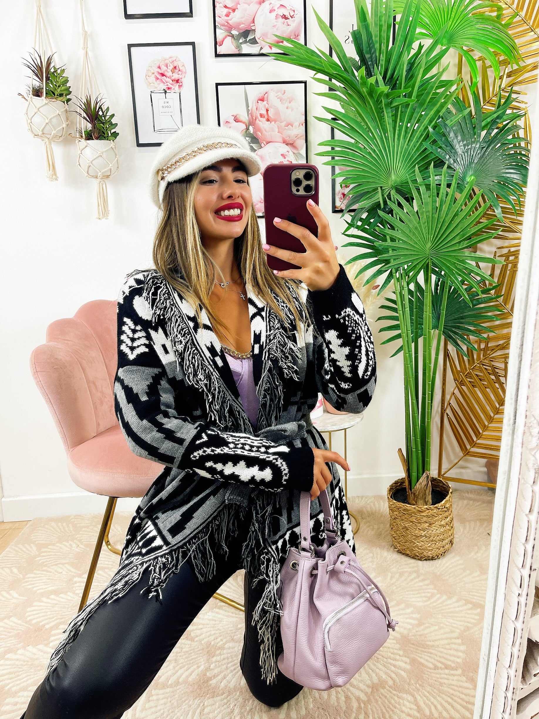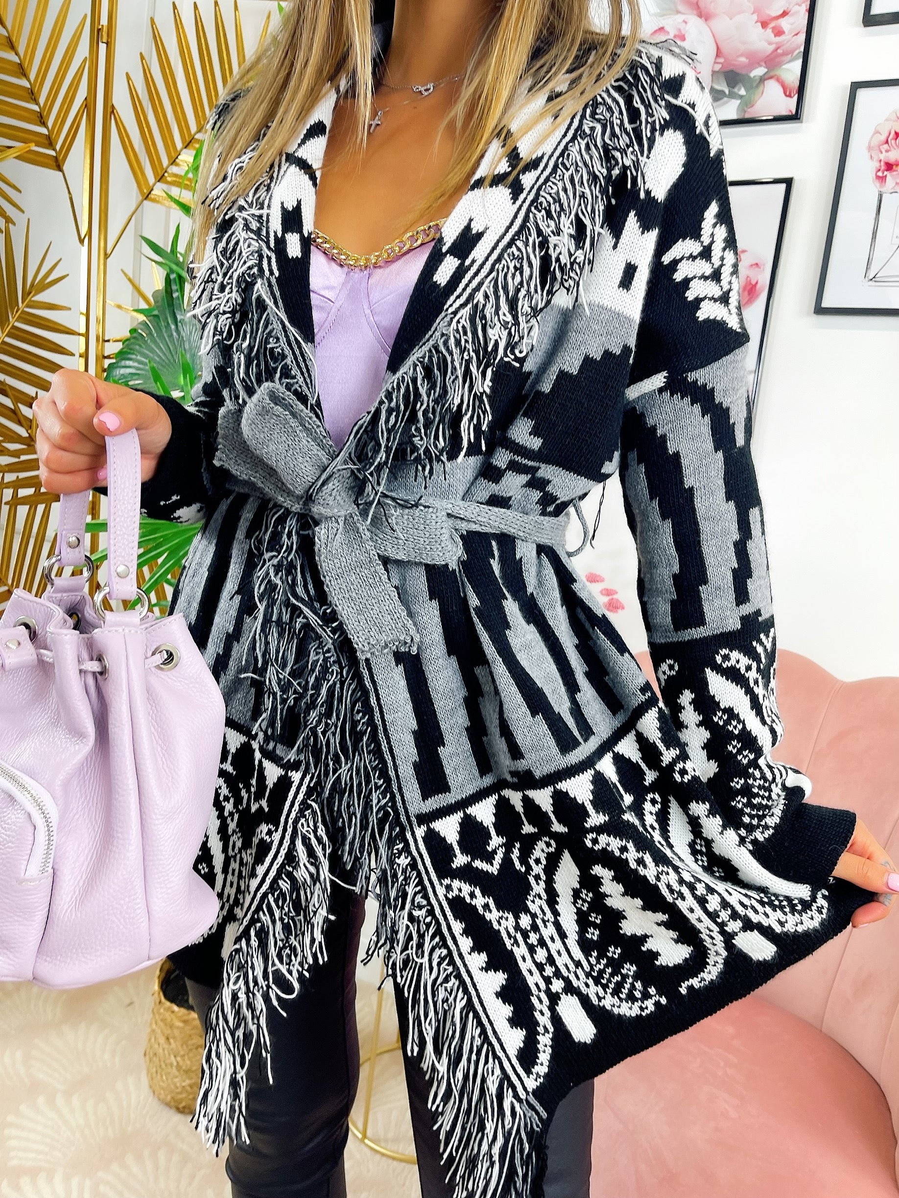 Cardigan in tessuto medio pesante con frange e cintura in vita.