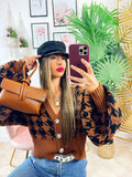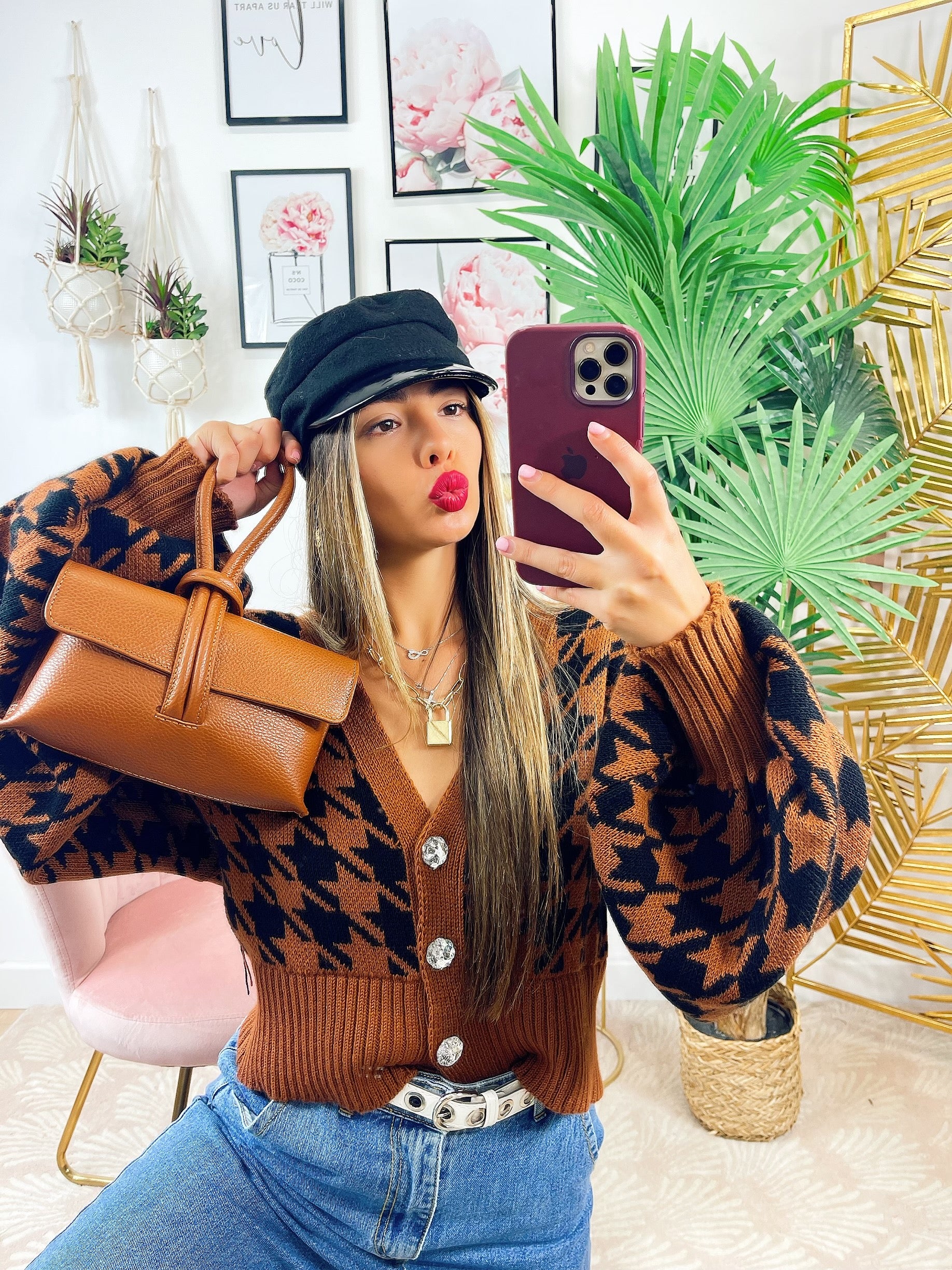 Cardigan con gioiello a trama Camel nero E polsino chiuso.