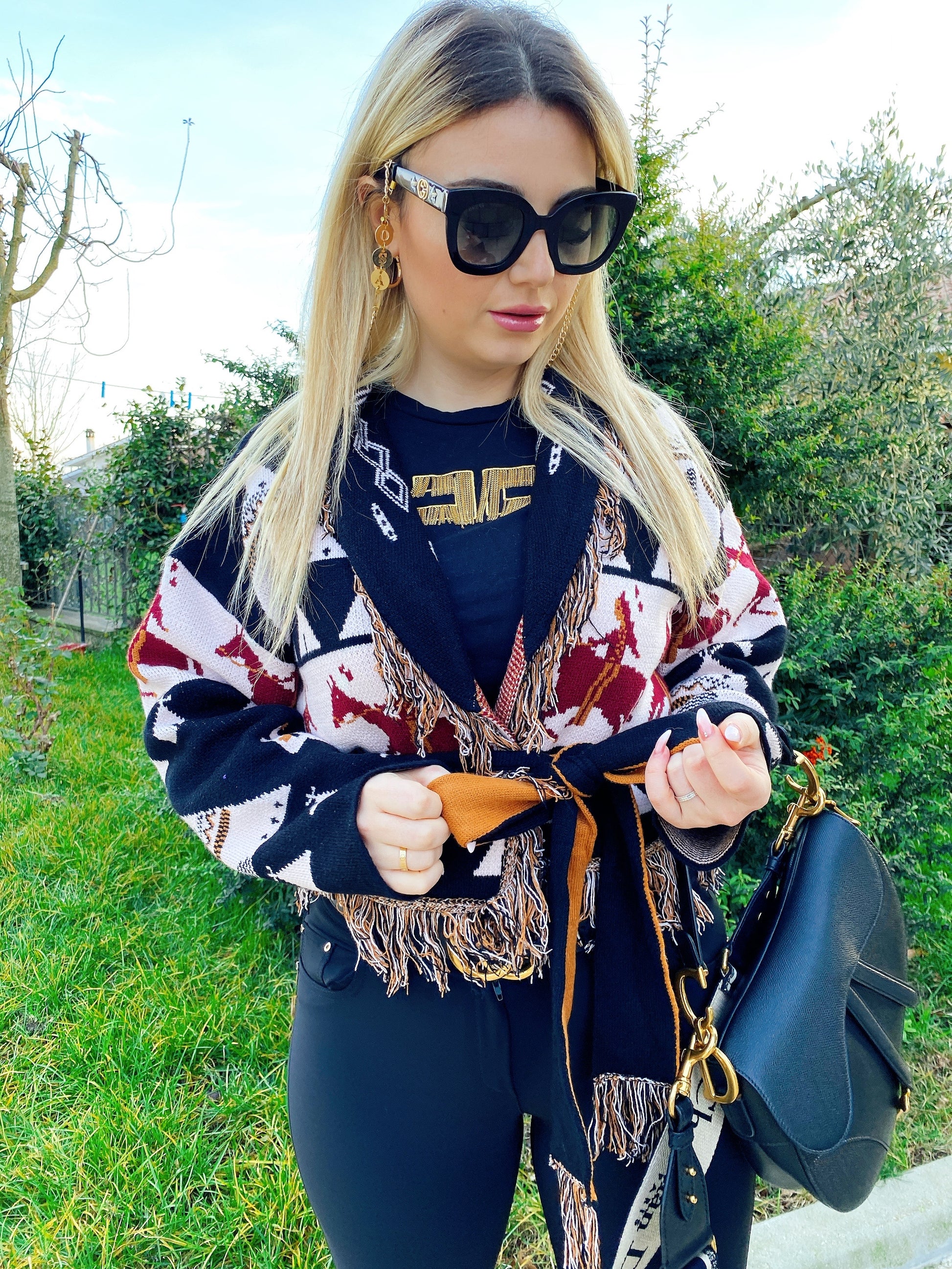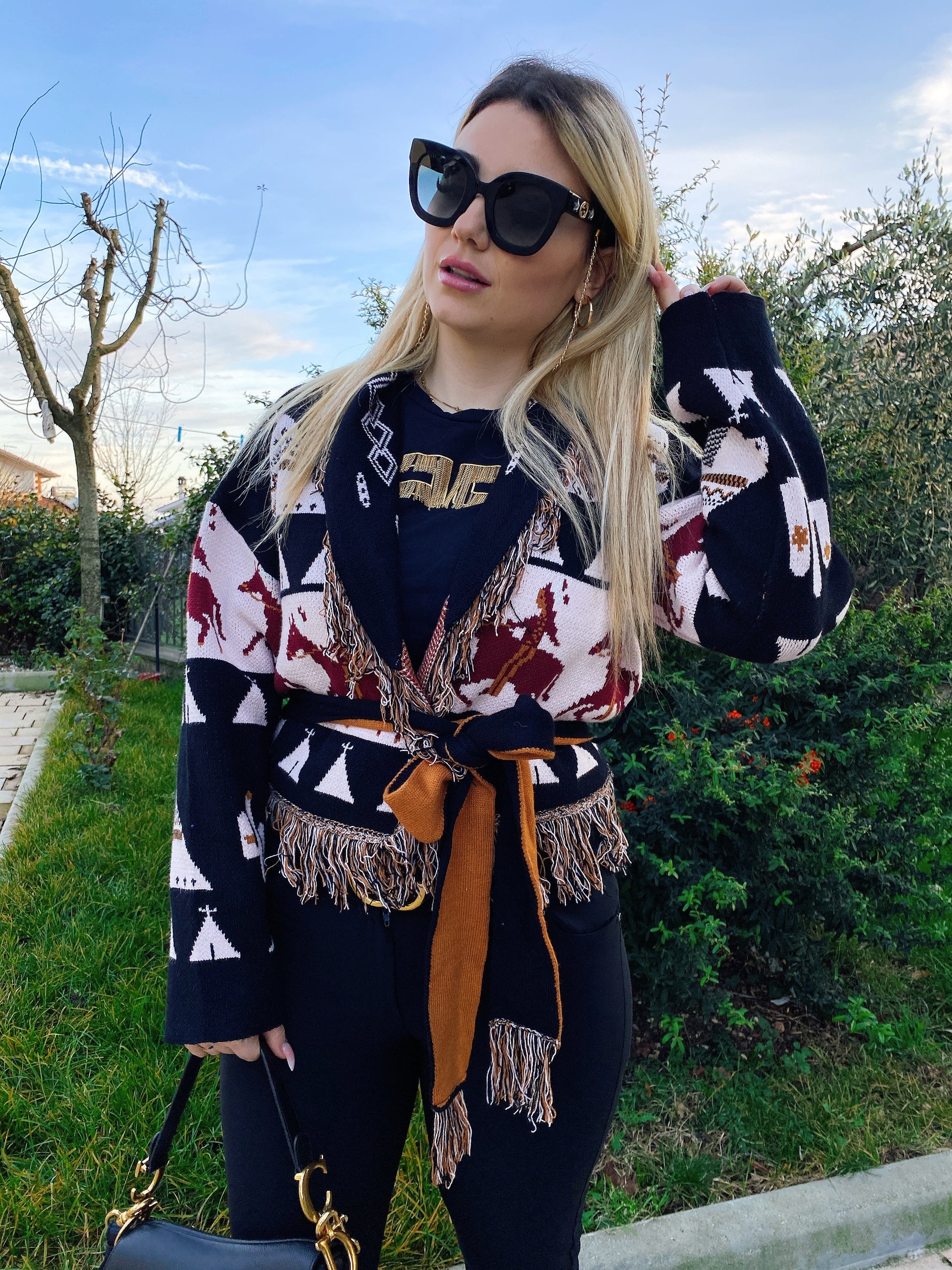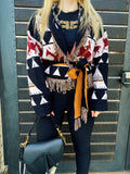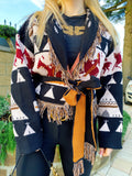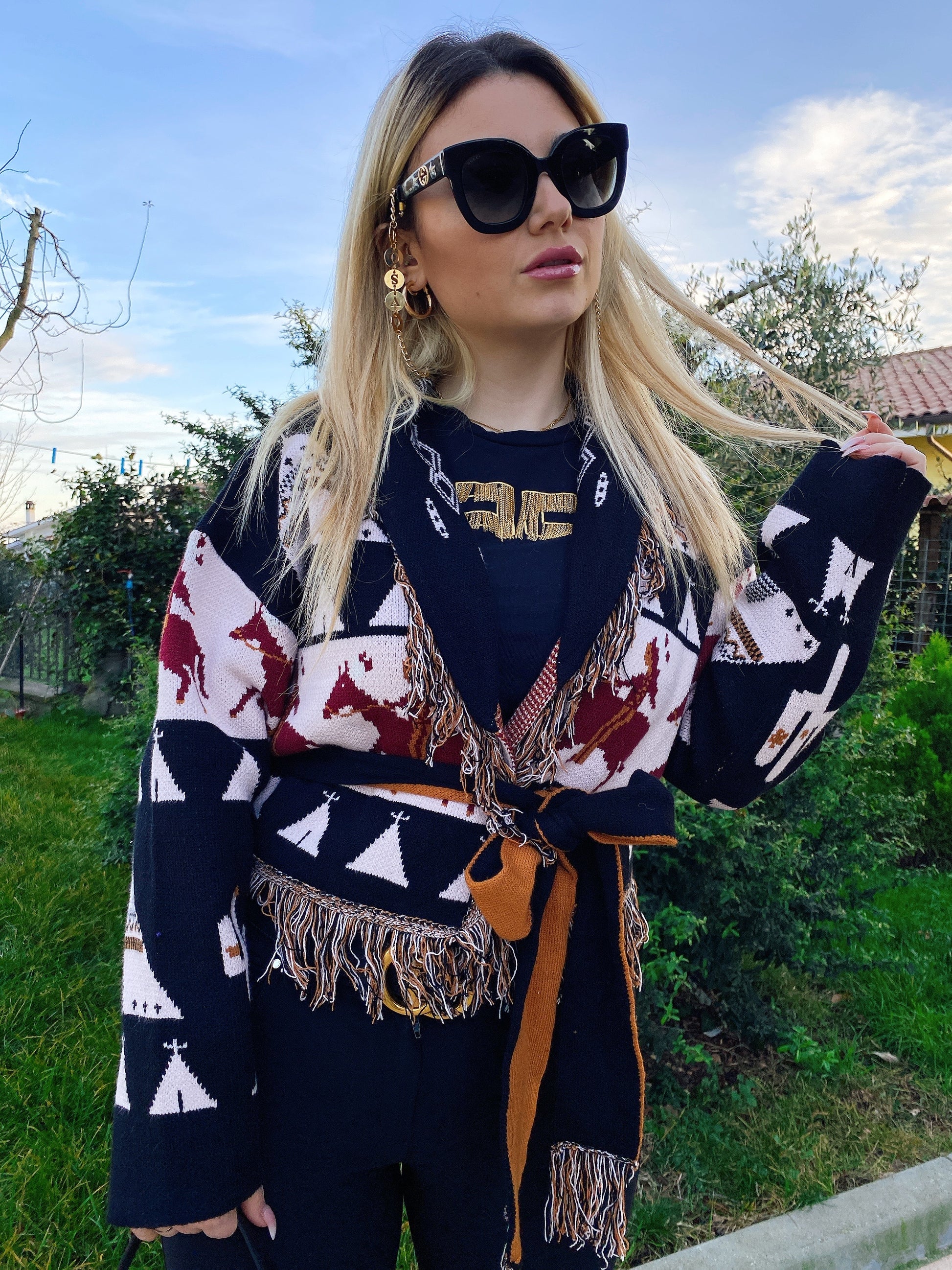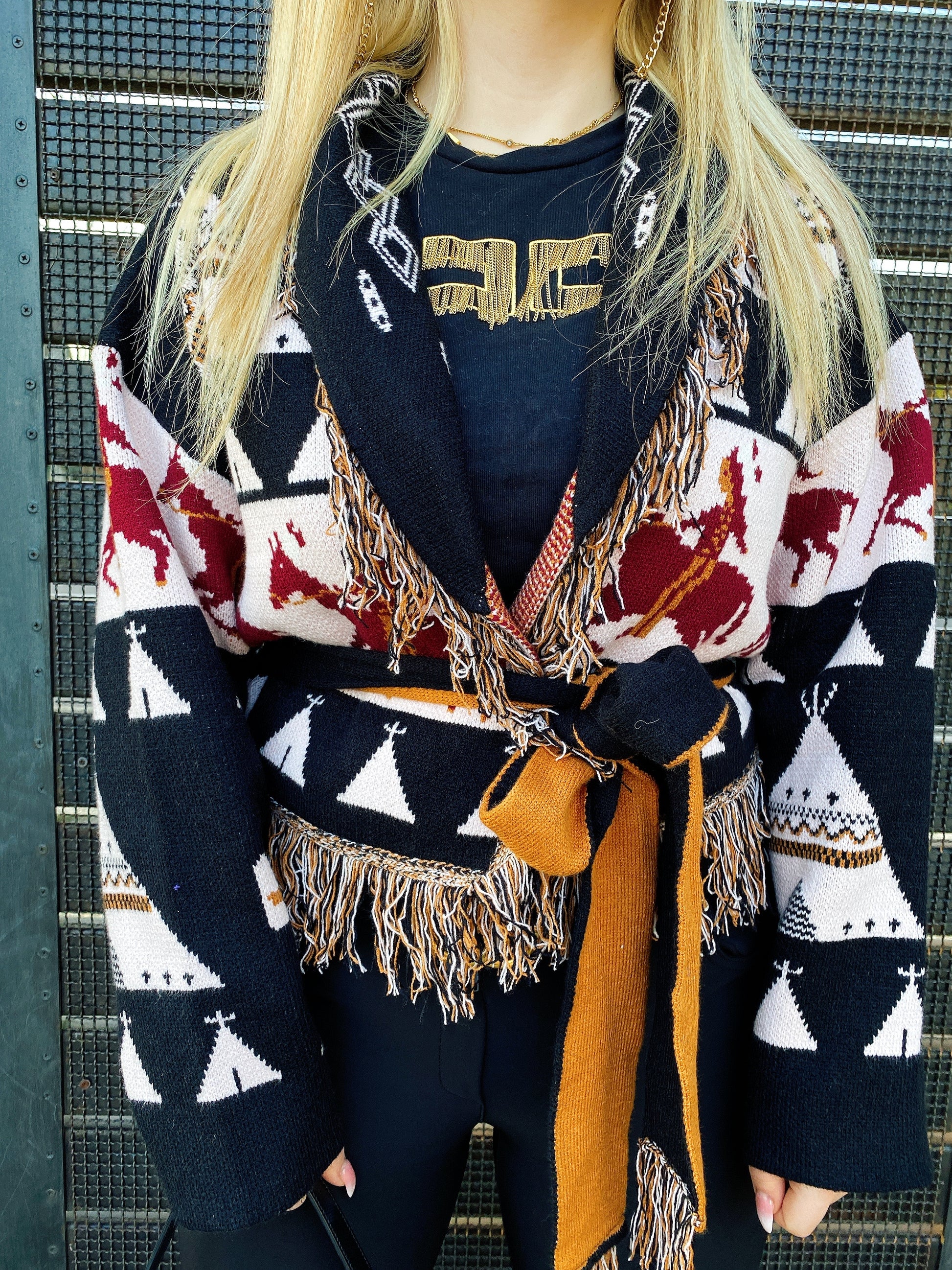 Cardigan in tessuto medio pesante con frange e cintura in vita. Alta qualità