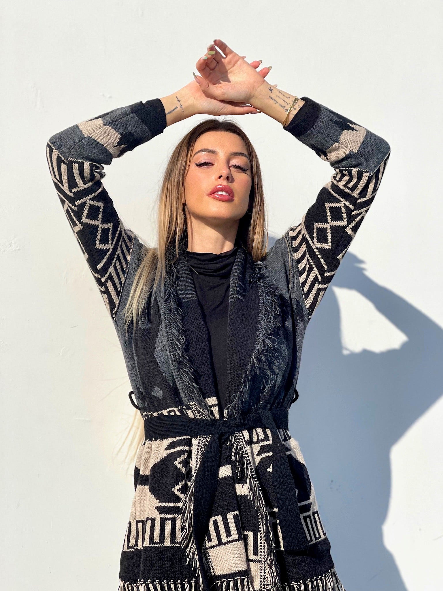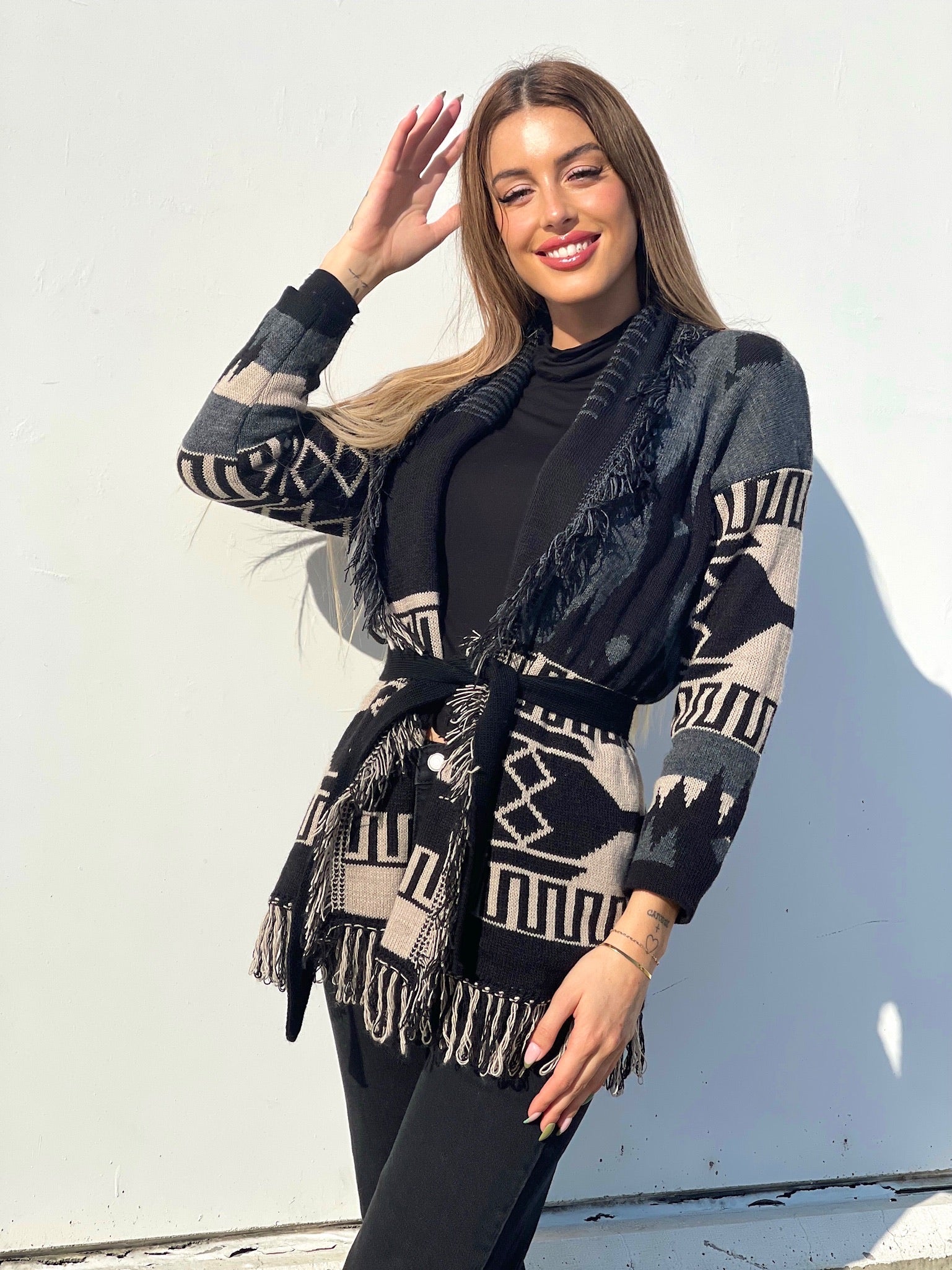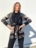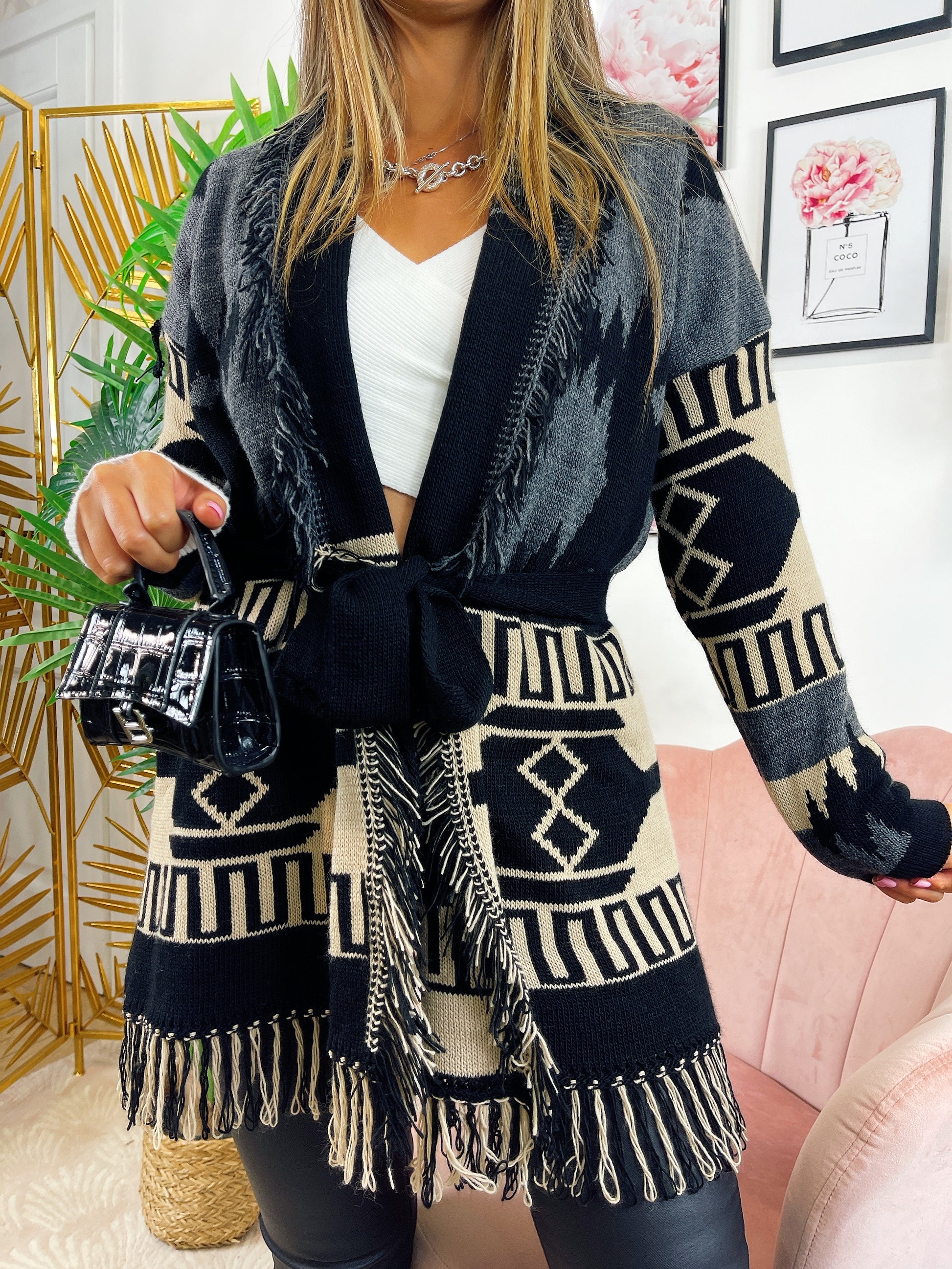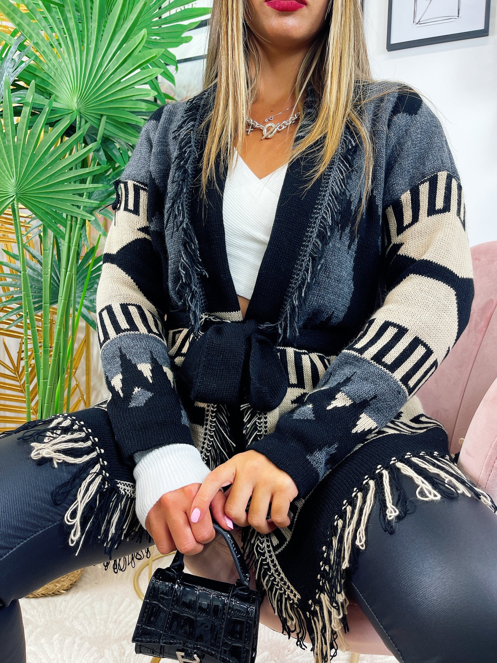 Cardigan in tessuto medio pesante con frange e cintura in vita.