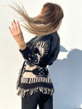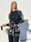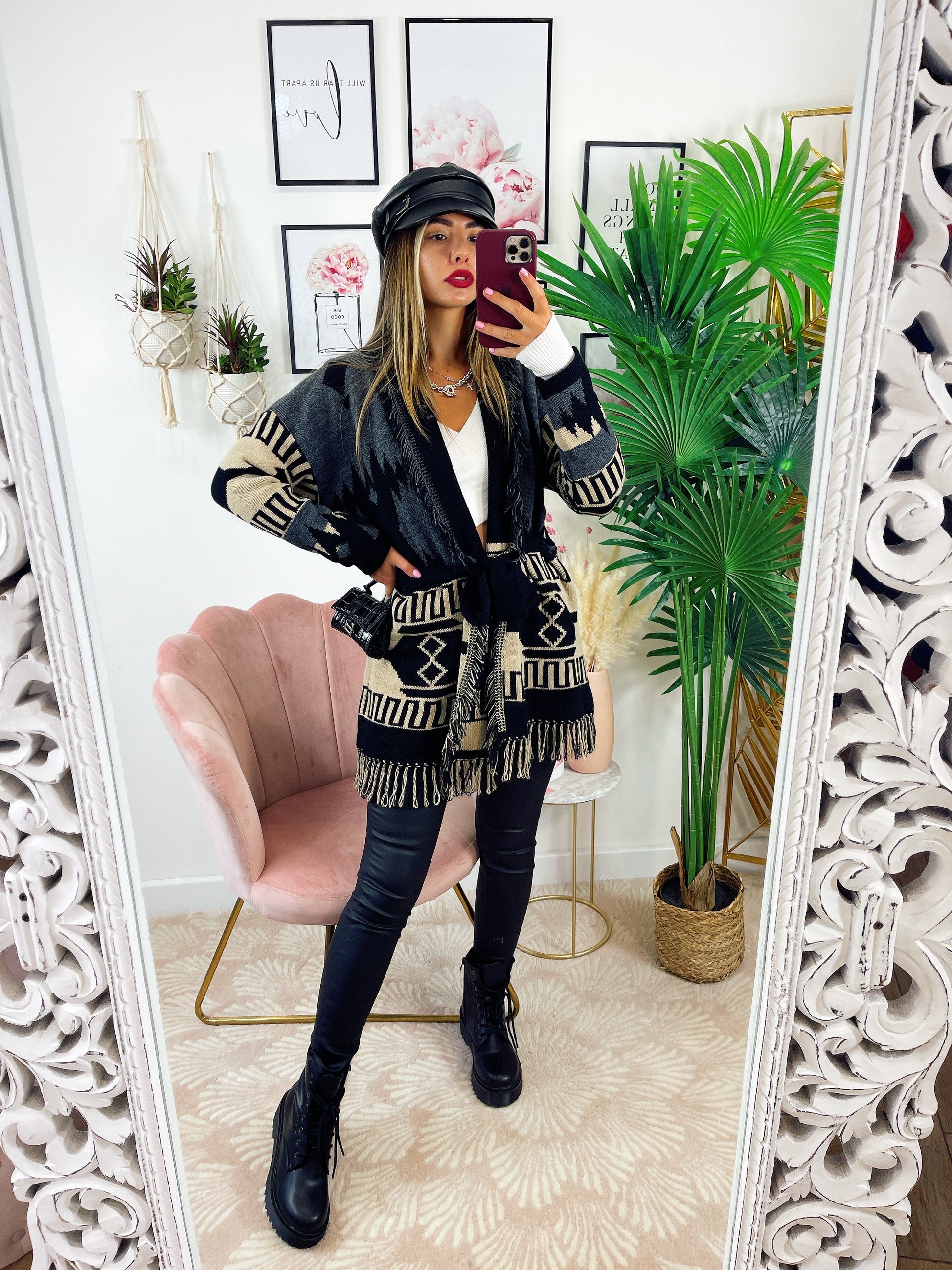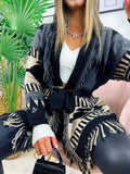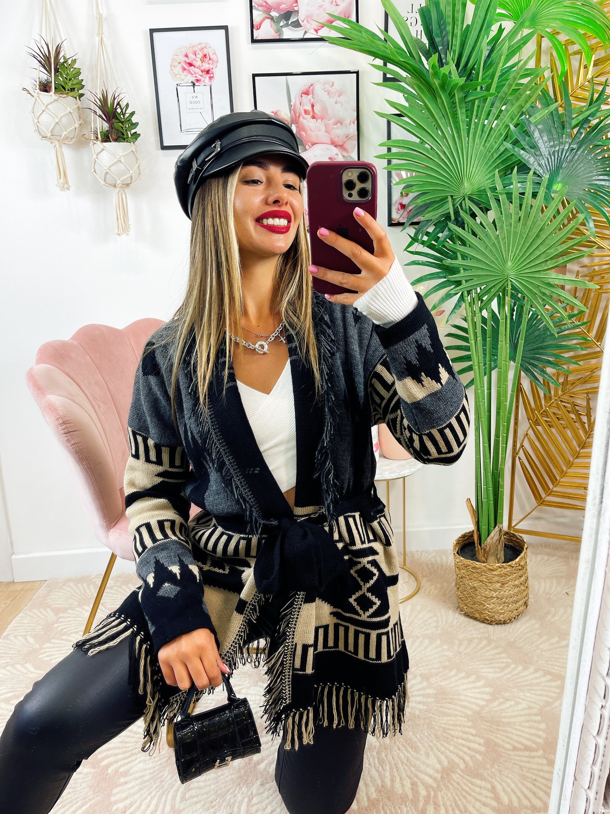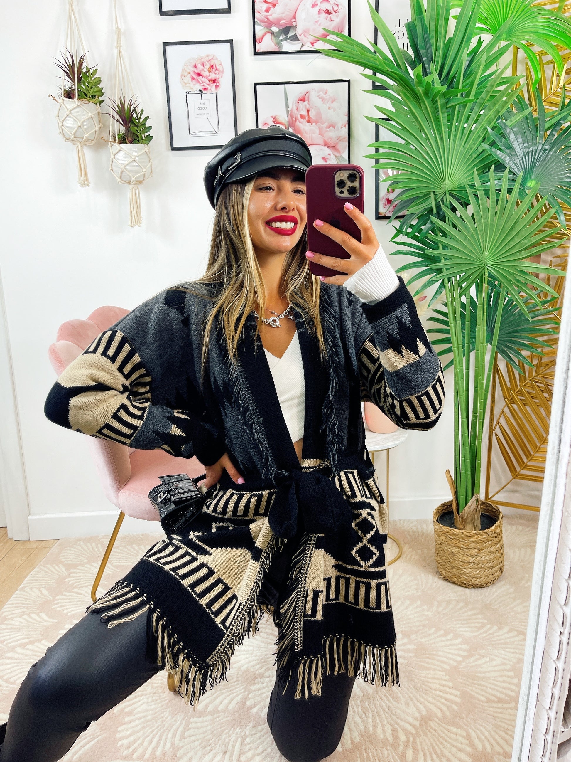 Cardigan in tessuto medio pesante con frange e cintura in vita.
