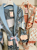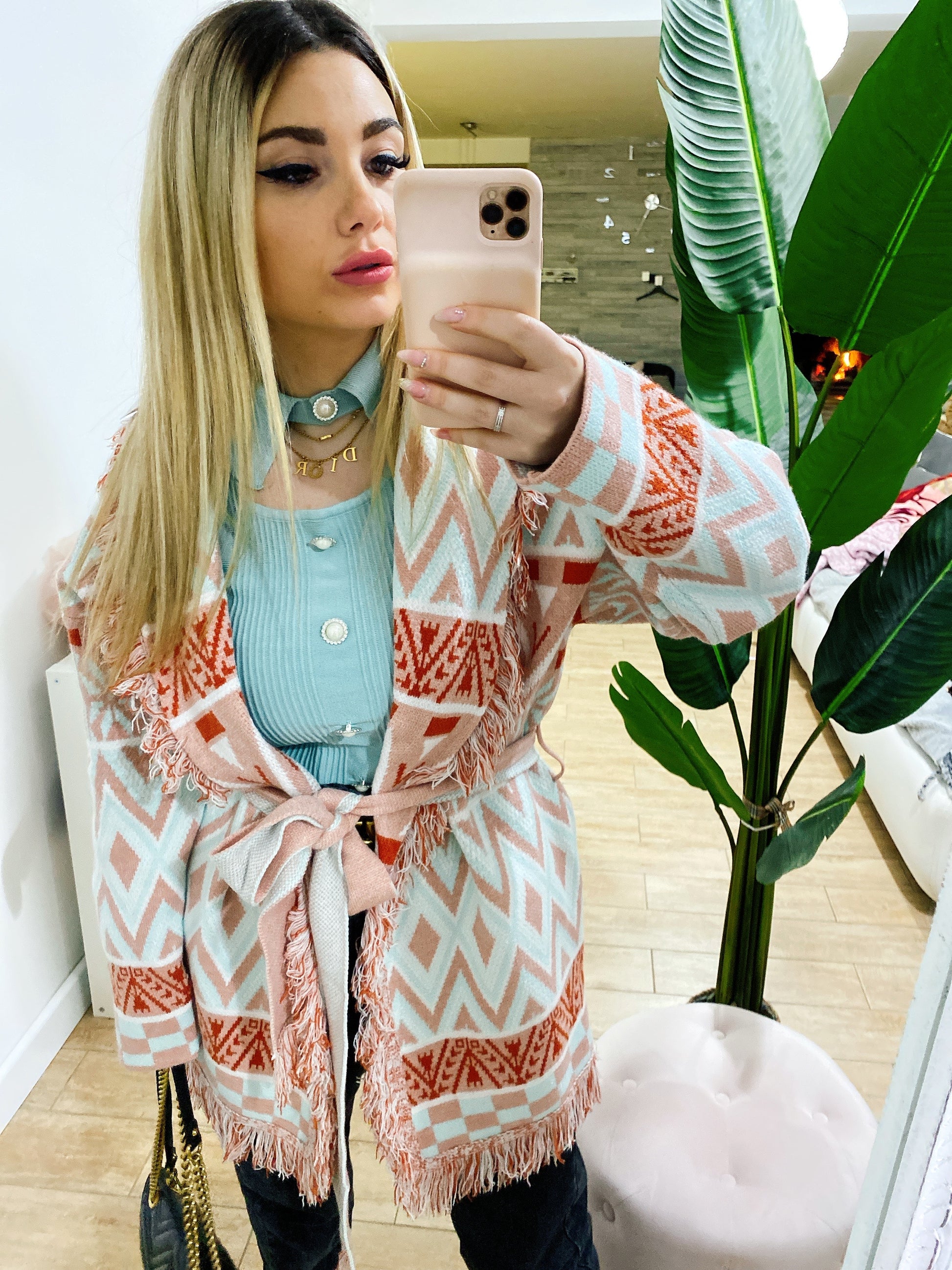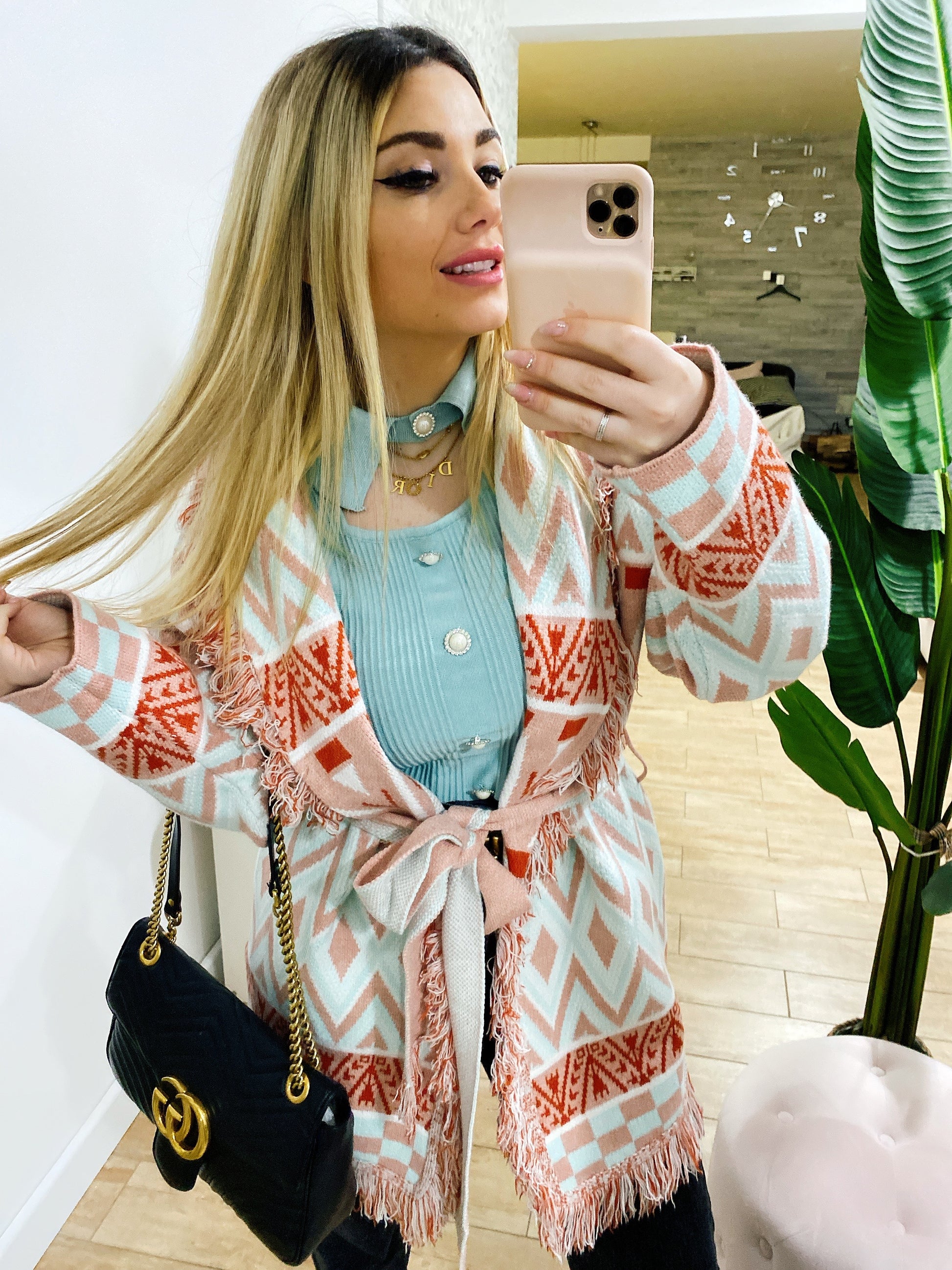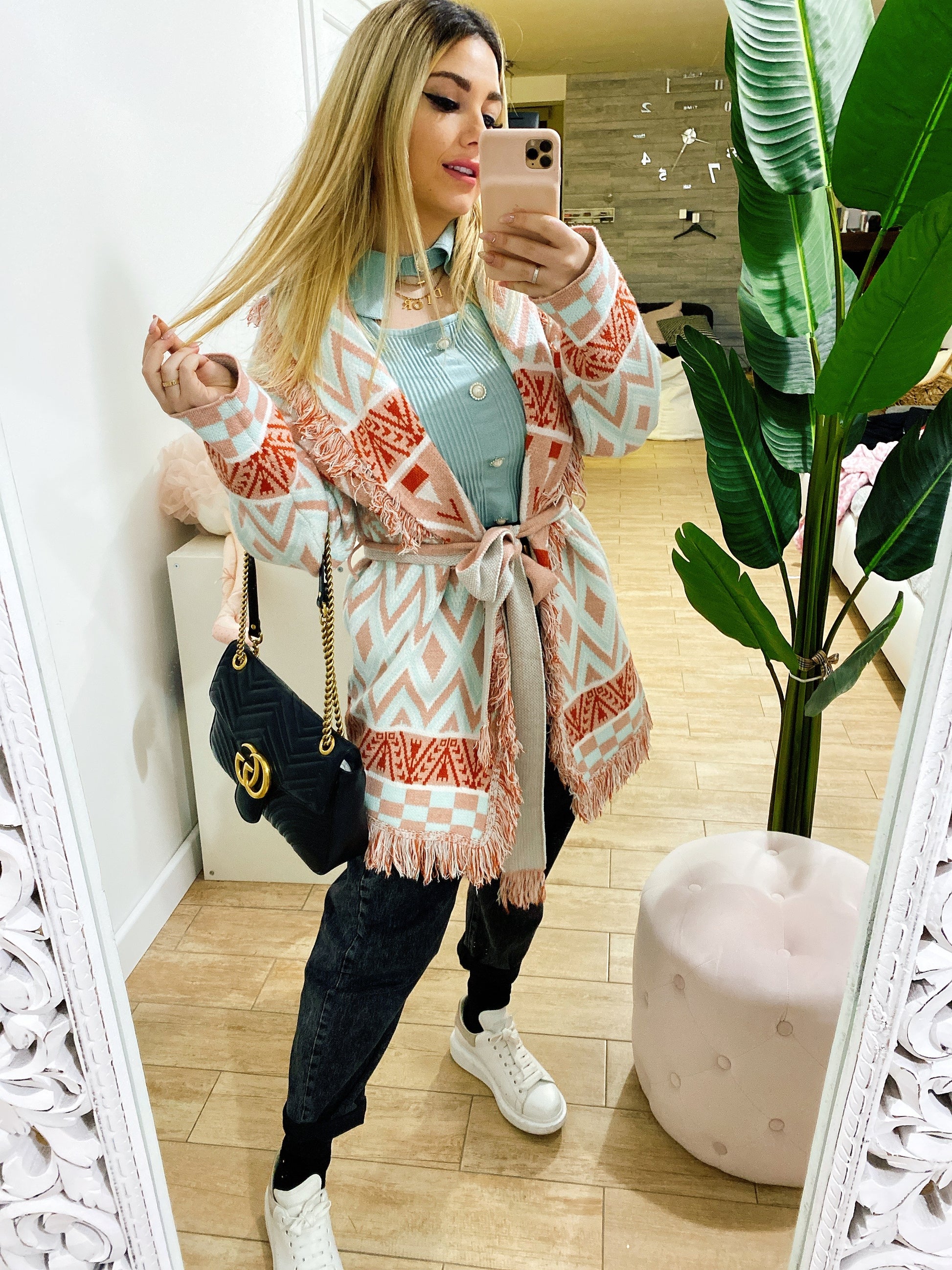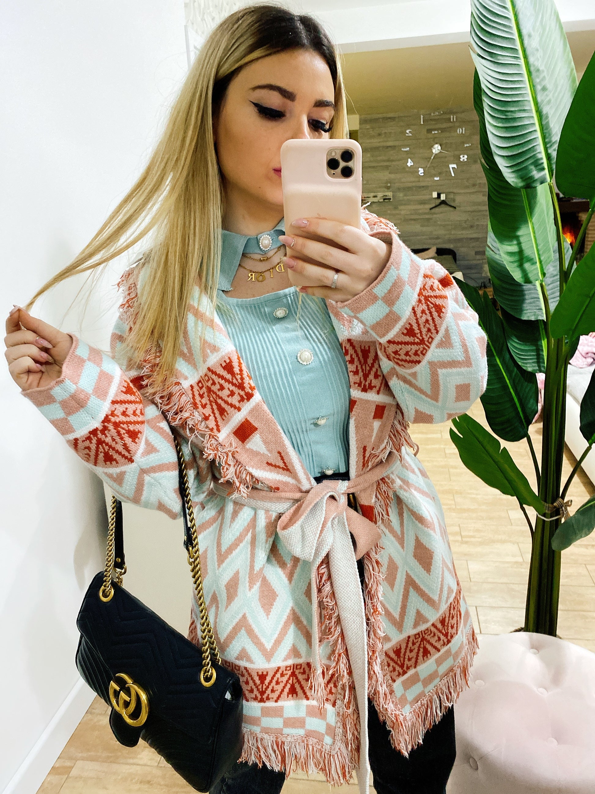 Cardigan in tessuto medio pesante con frange e cintura in vita. Alta qualità