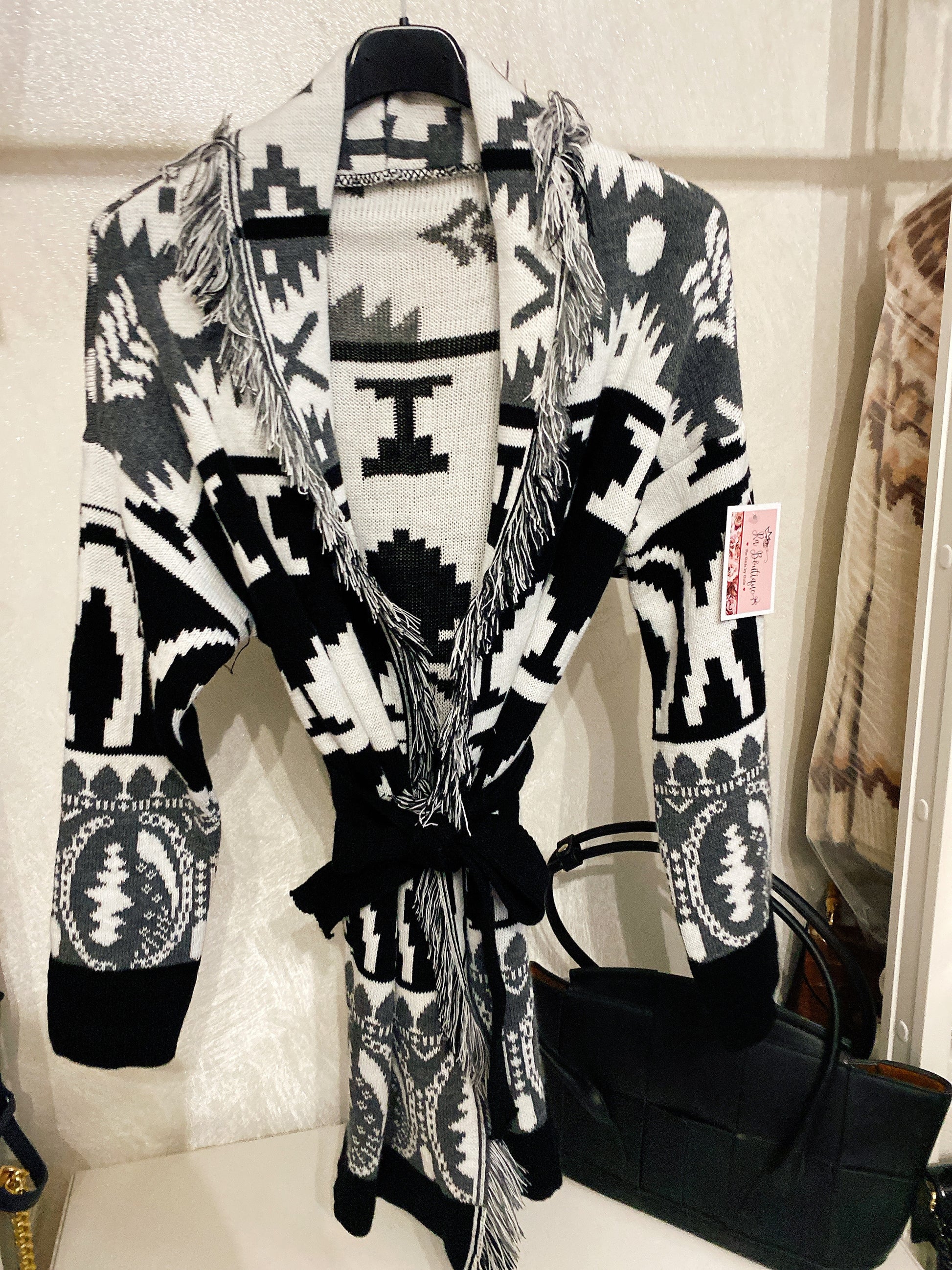 Cardigan nero con frange e cinta
