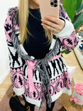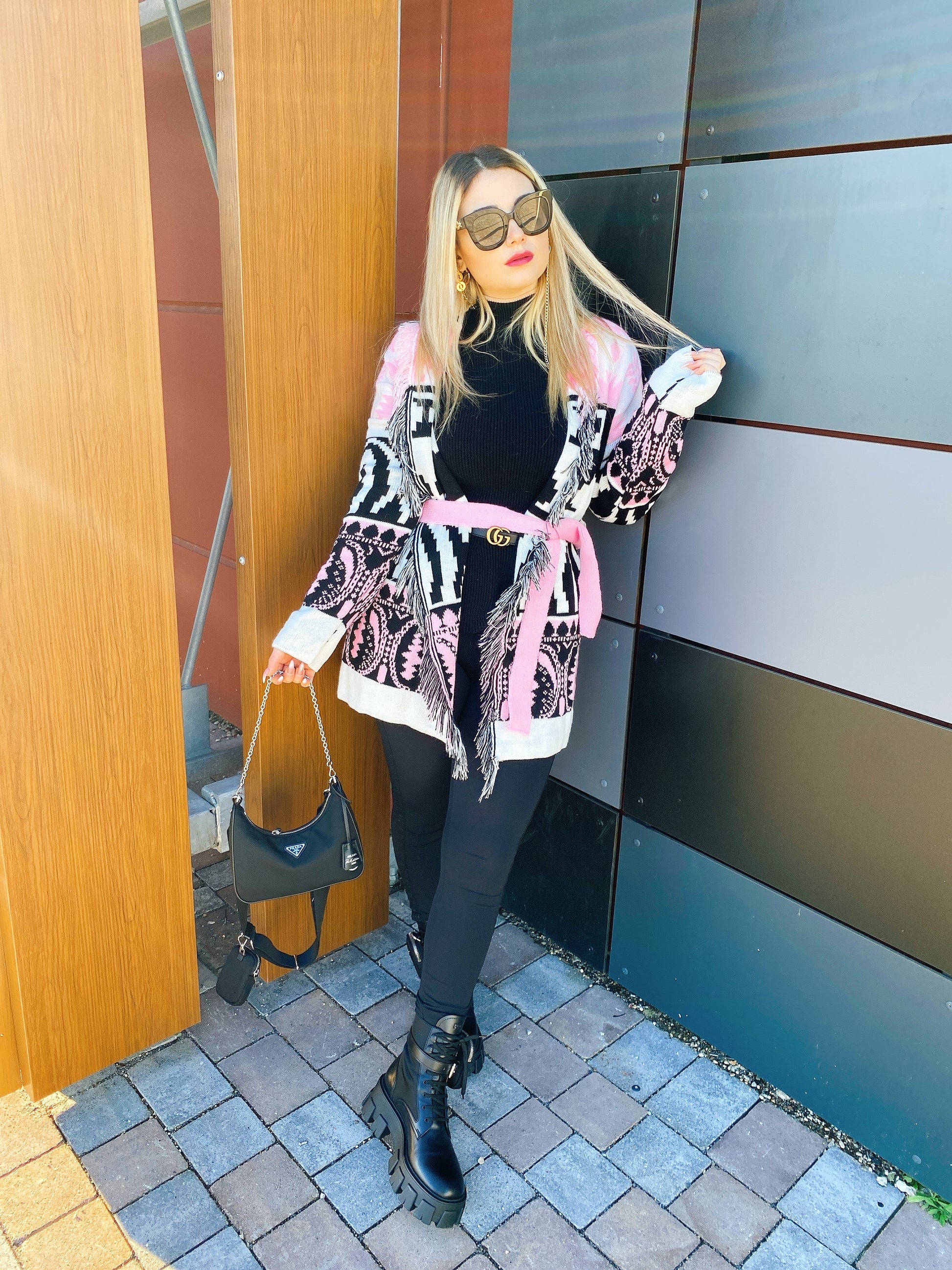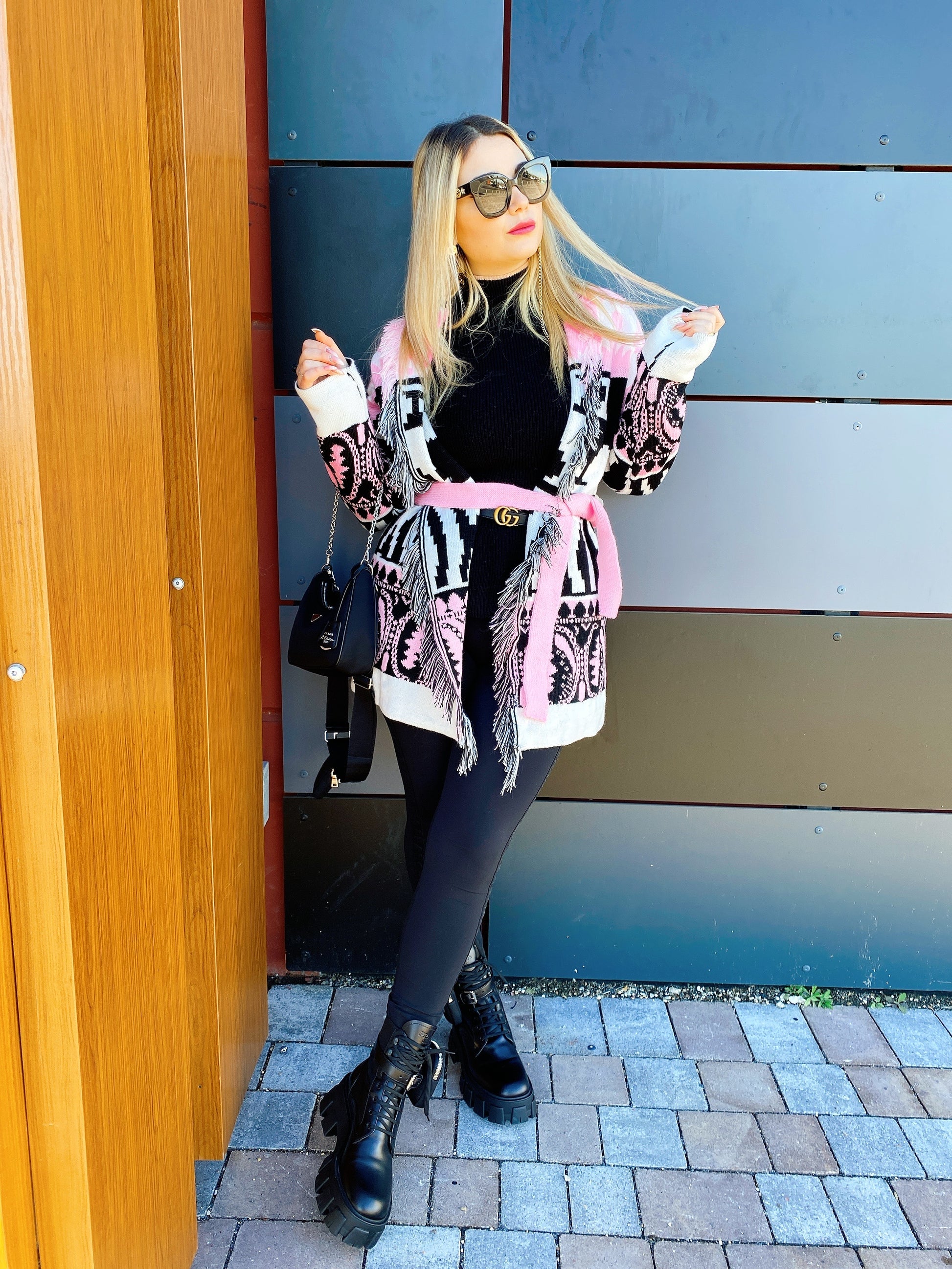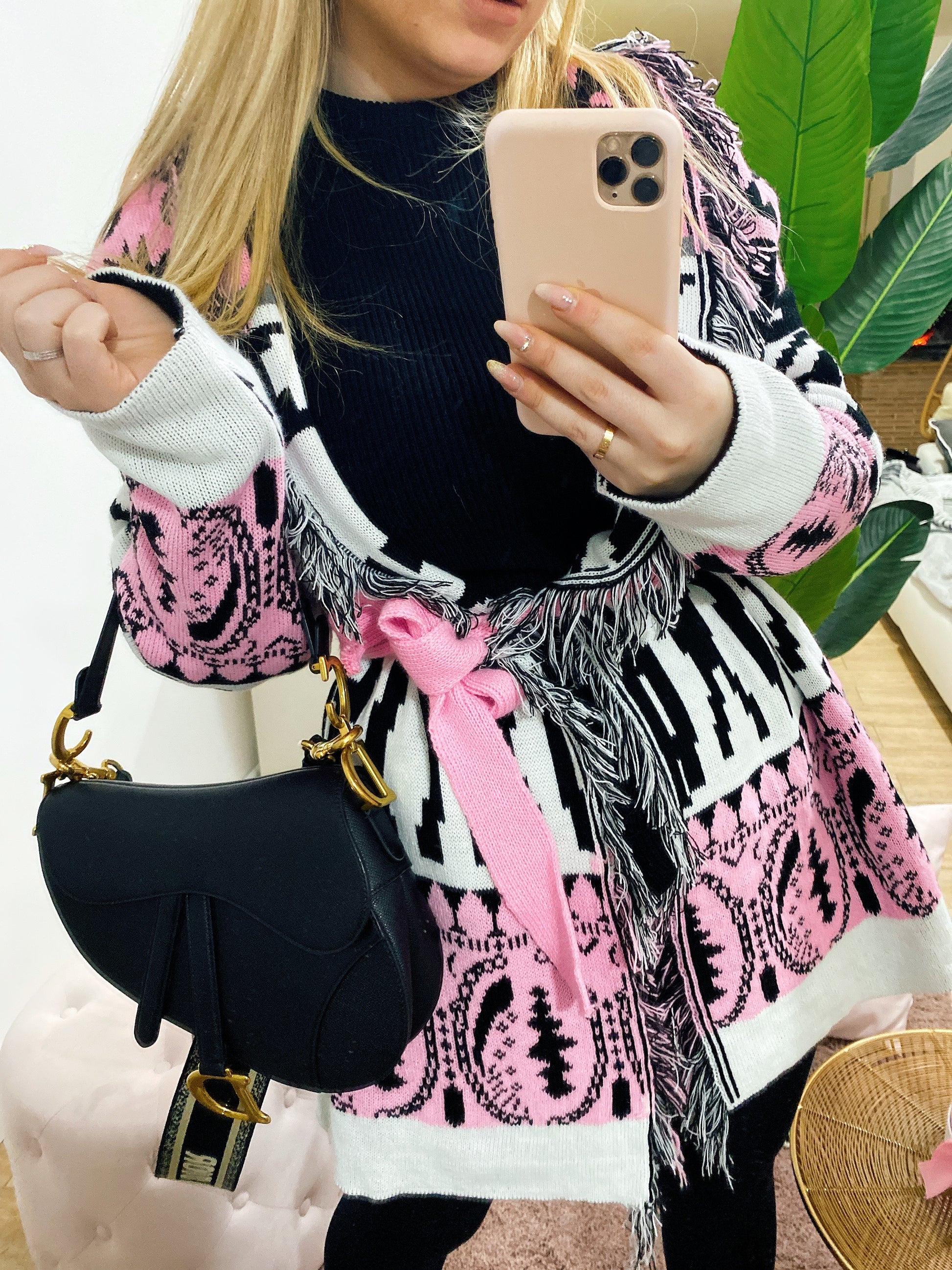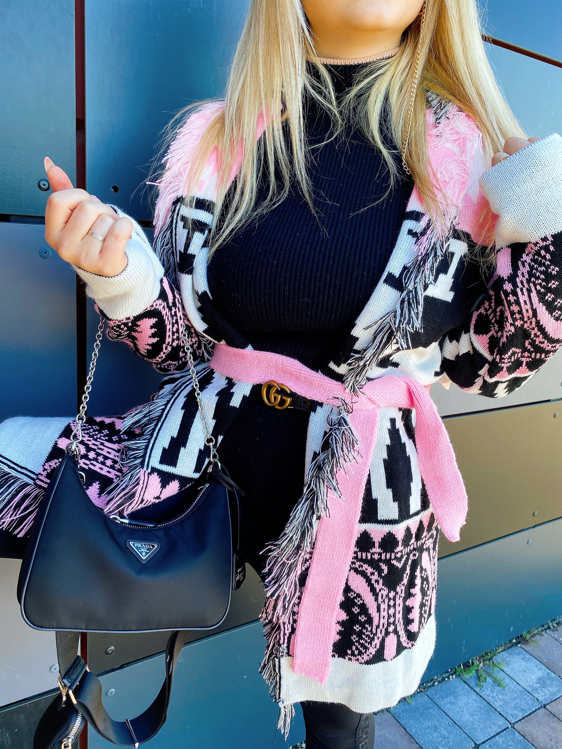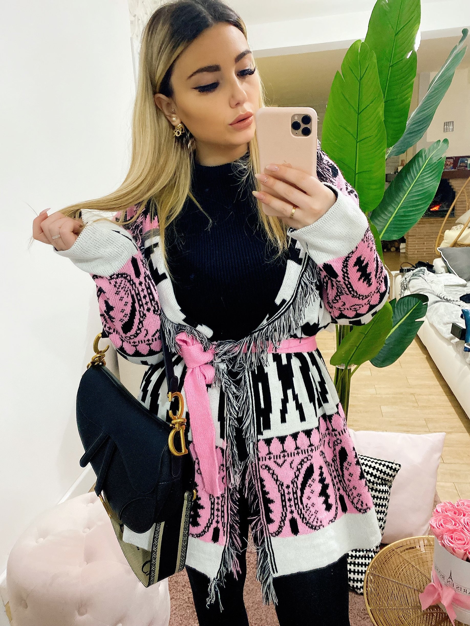 Cardigan in tessuto medio pesante con frange e cintura in vita. Reversibile