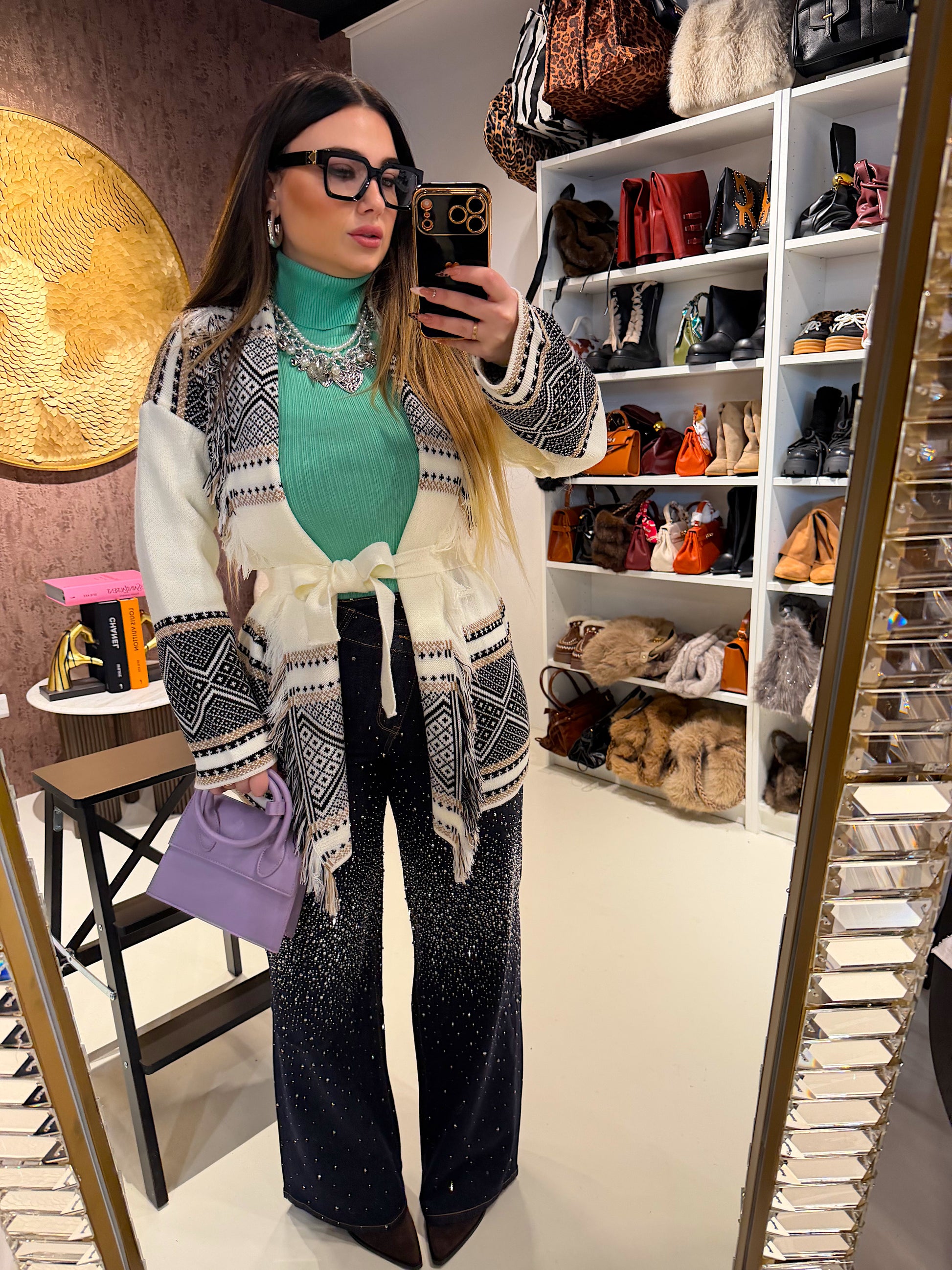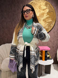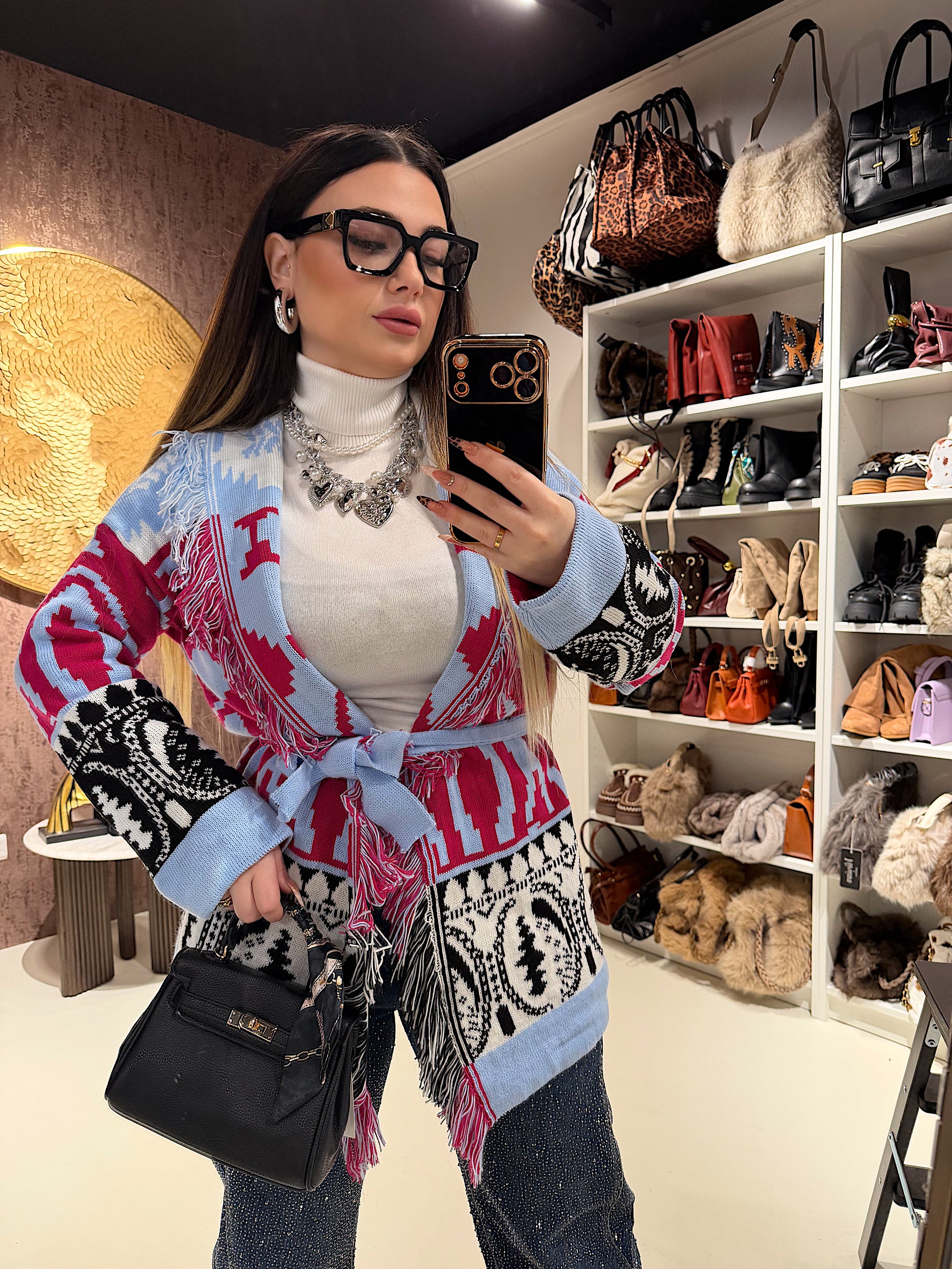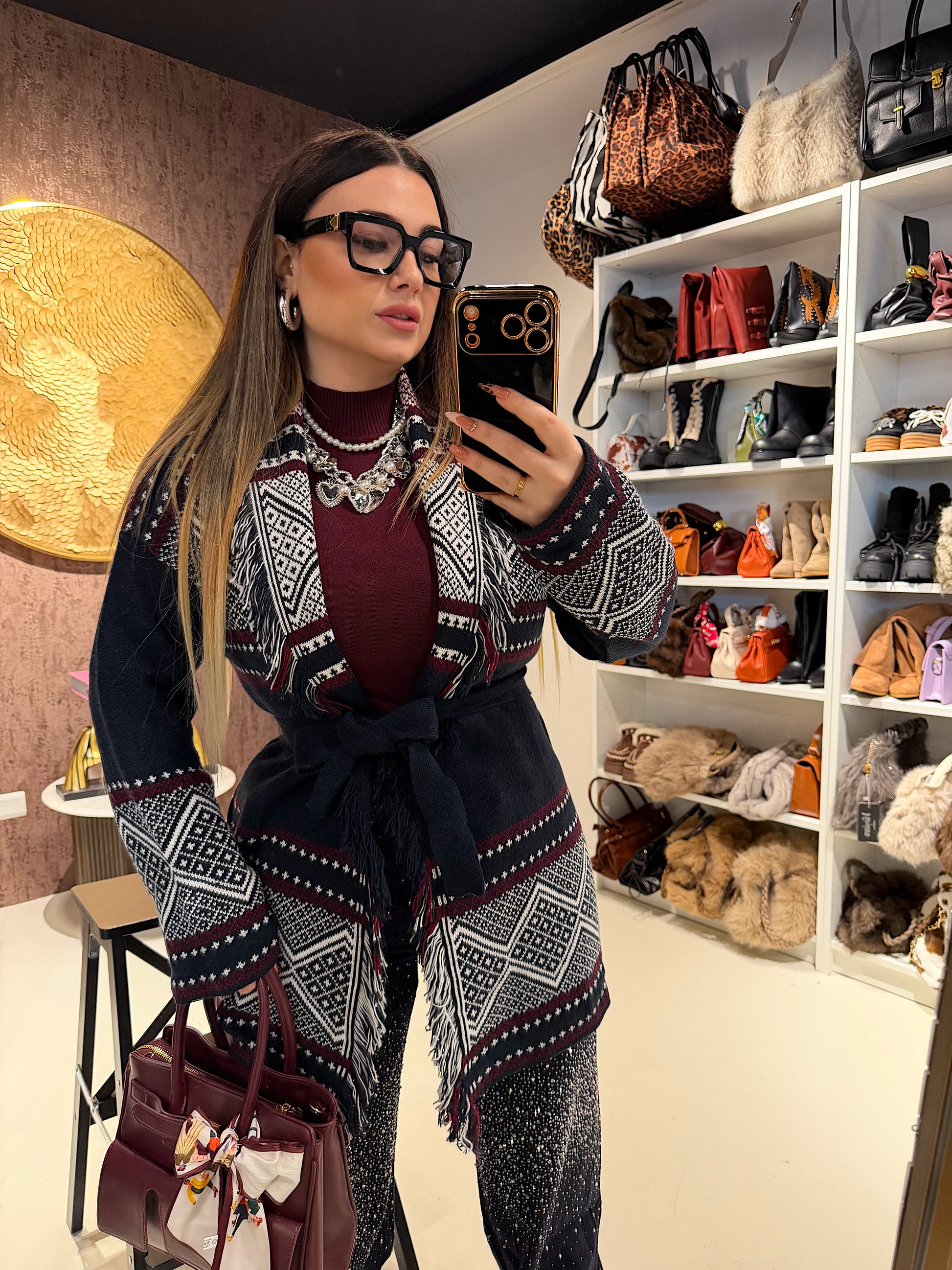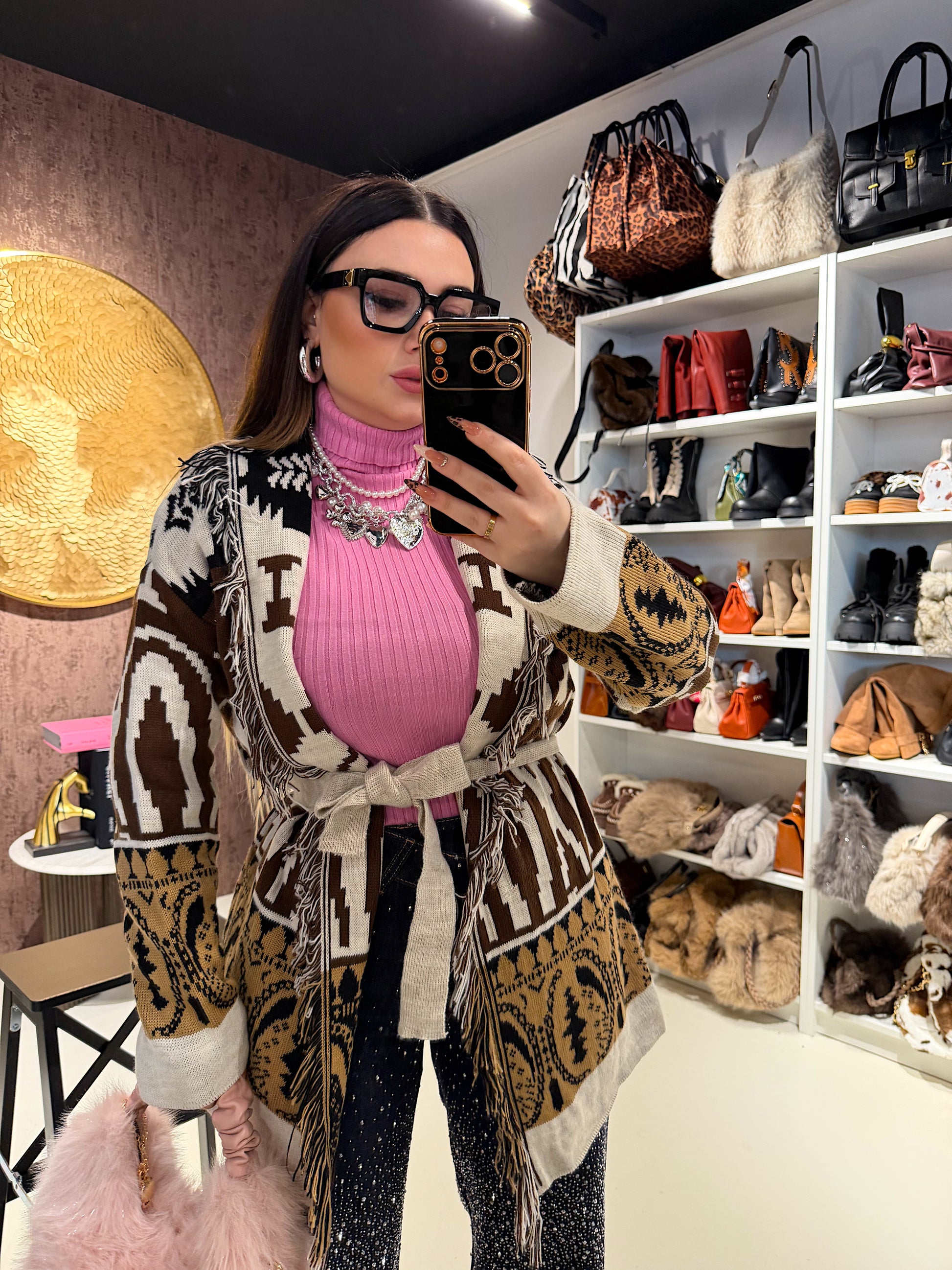 Avvolgente e sofisticato, il cardigan Andina dona un tocco etnico-chic ai tuoi look autunnali. Realizzato in morbida maglia pesante nei toni del marrone e del beige, presenta un raffinato motivo geometrico ispirato ai tessuti andini e frange decorative sui bordi. La cintura in vita permette di valorizzare la silhouette mantenendo il massimo comfort.