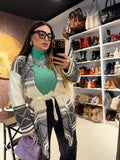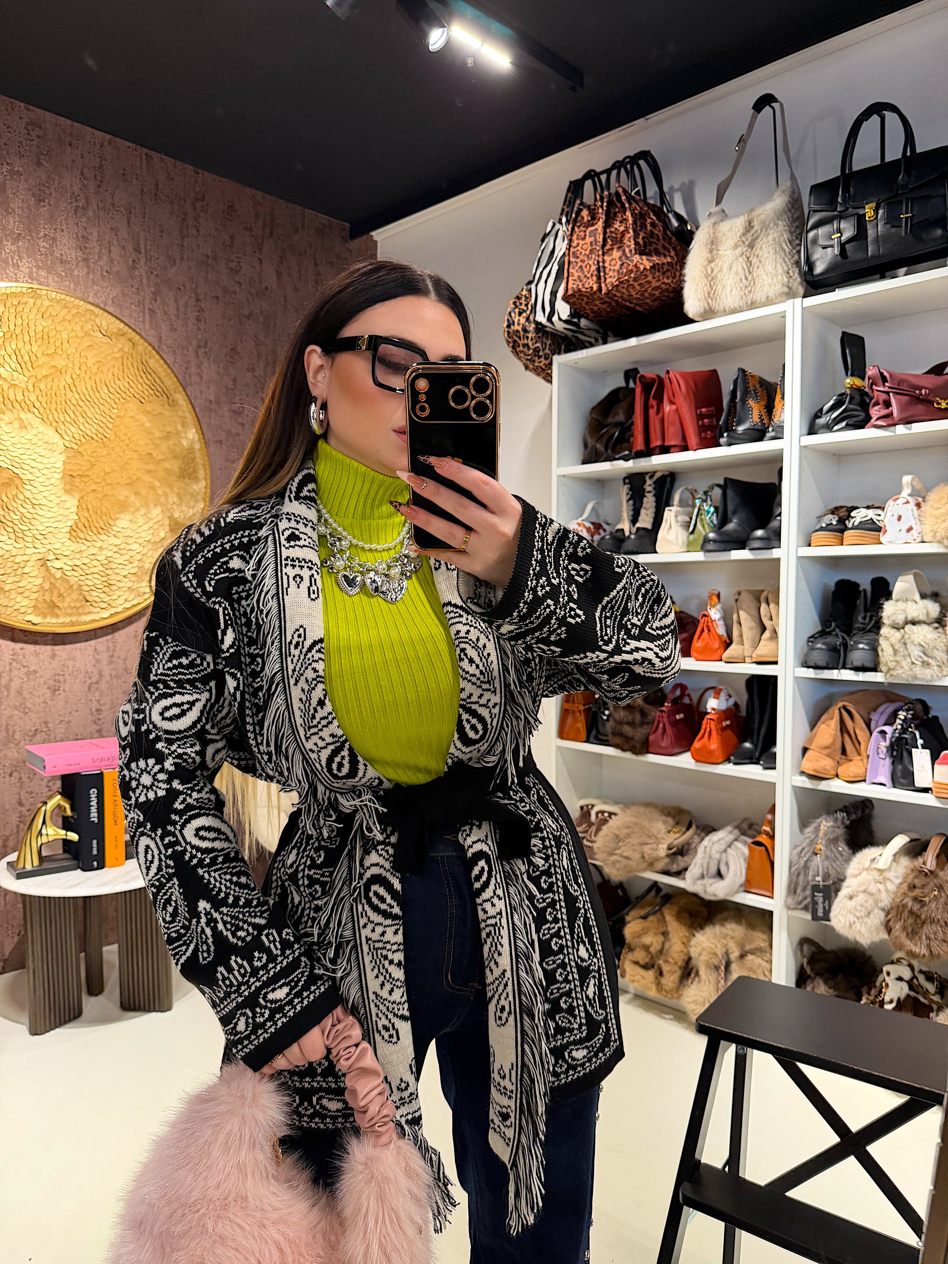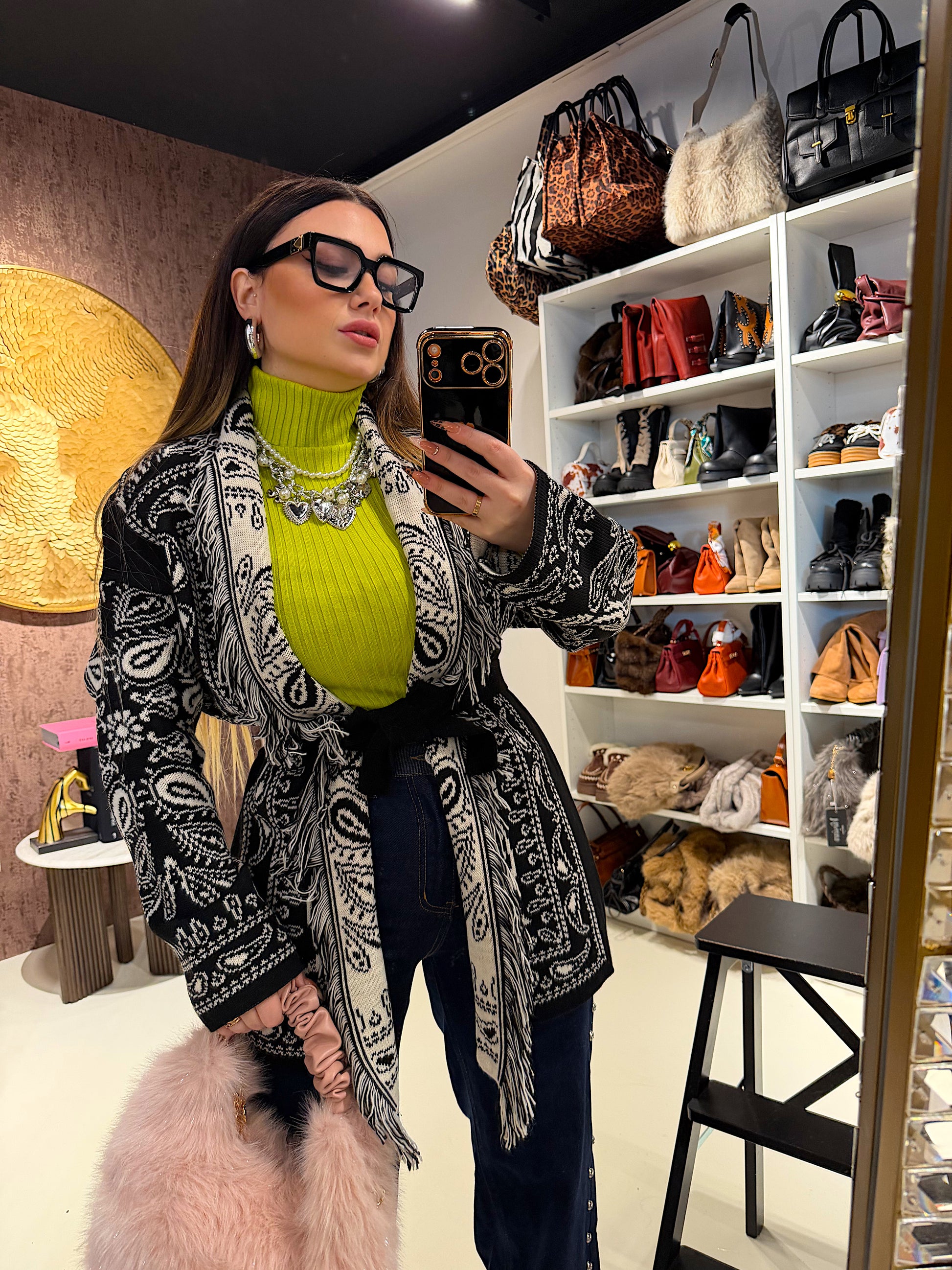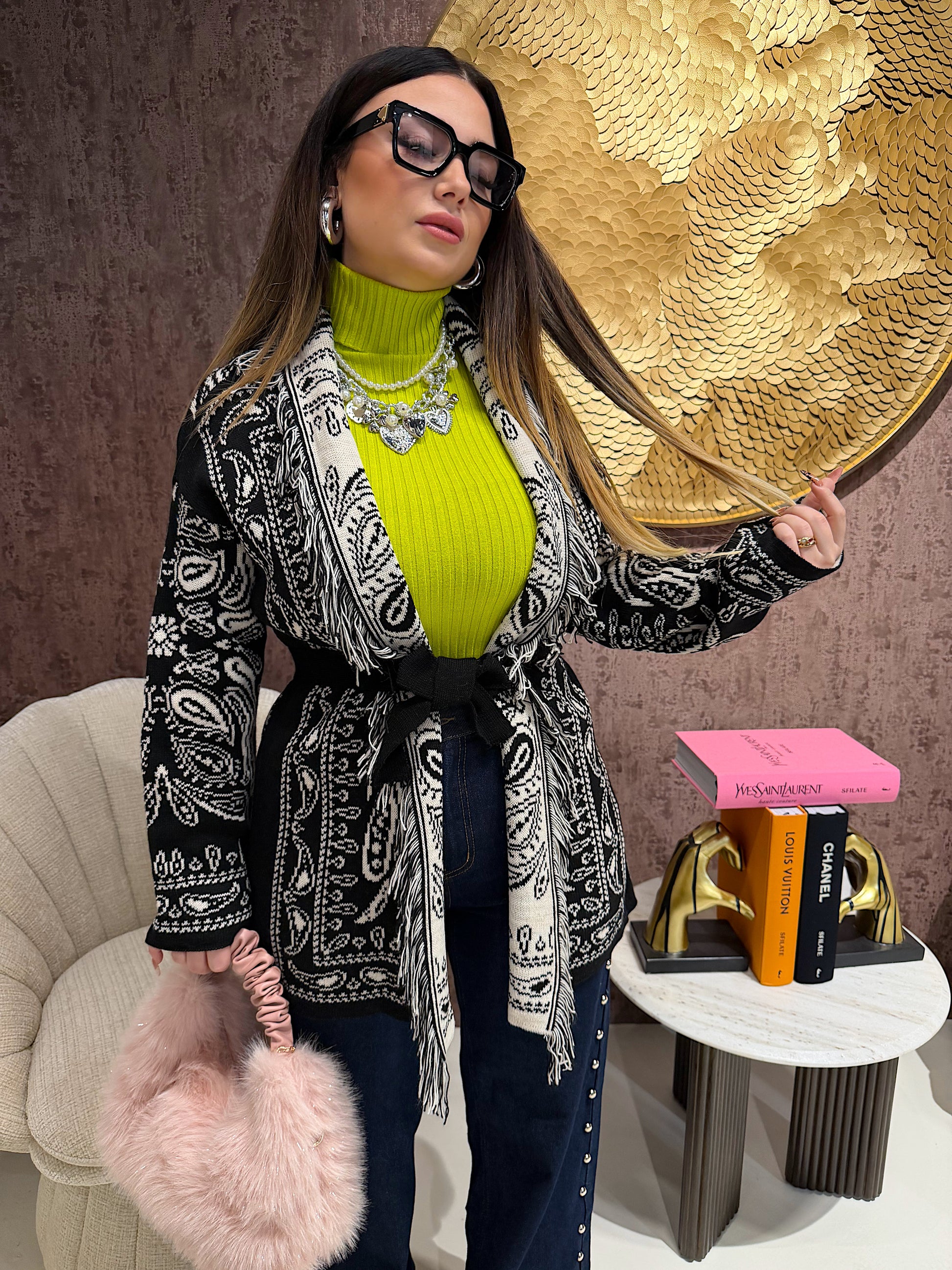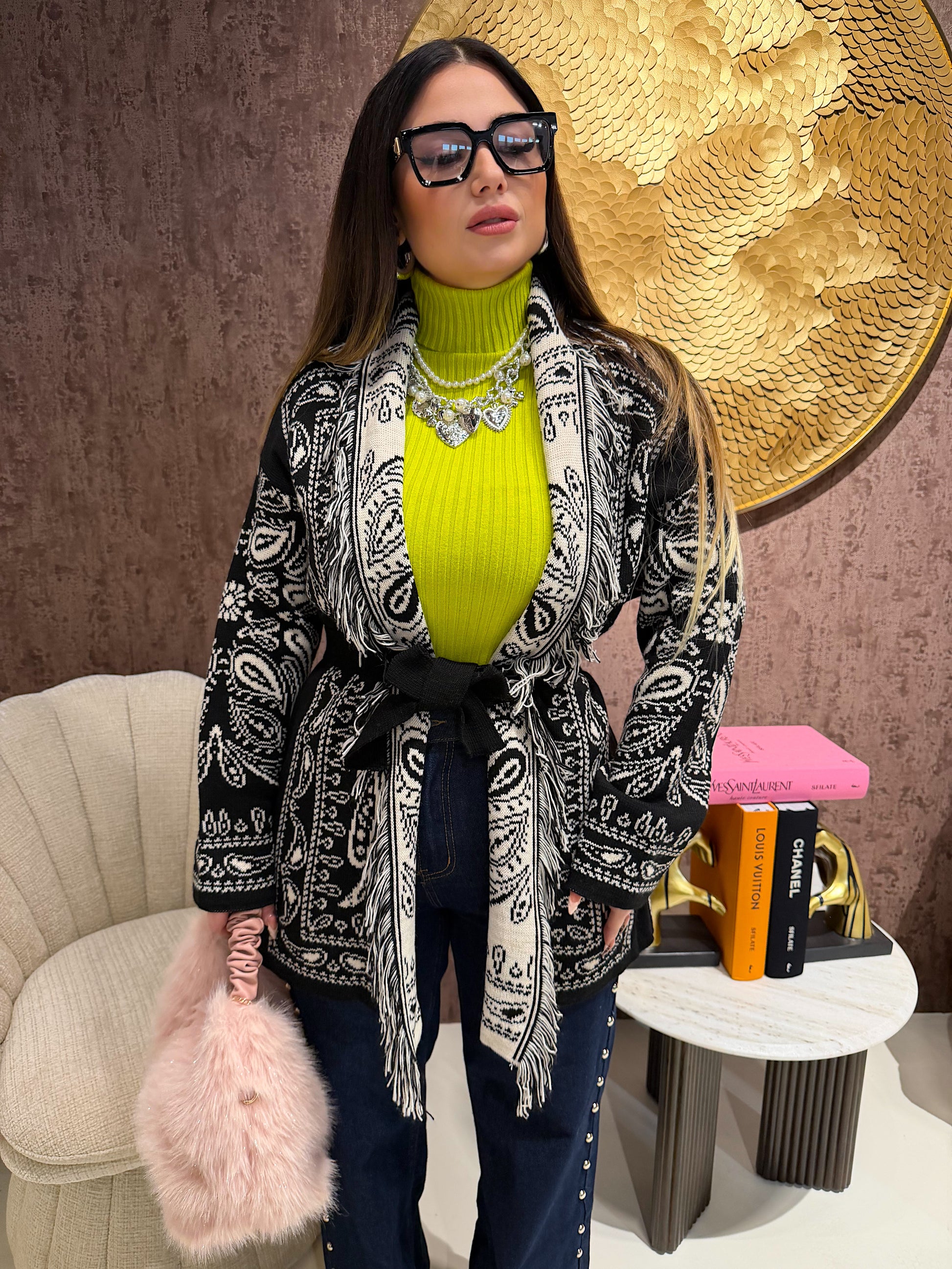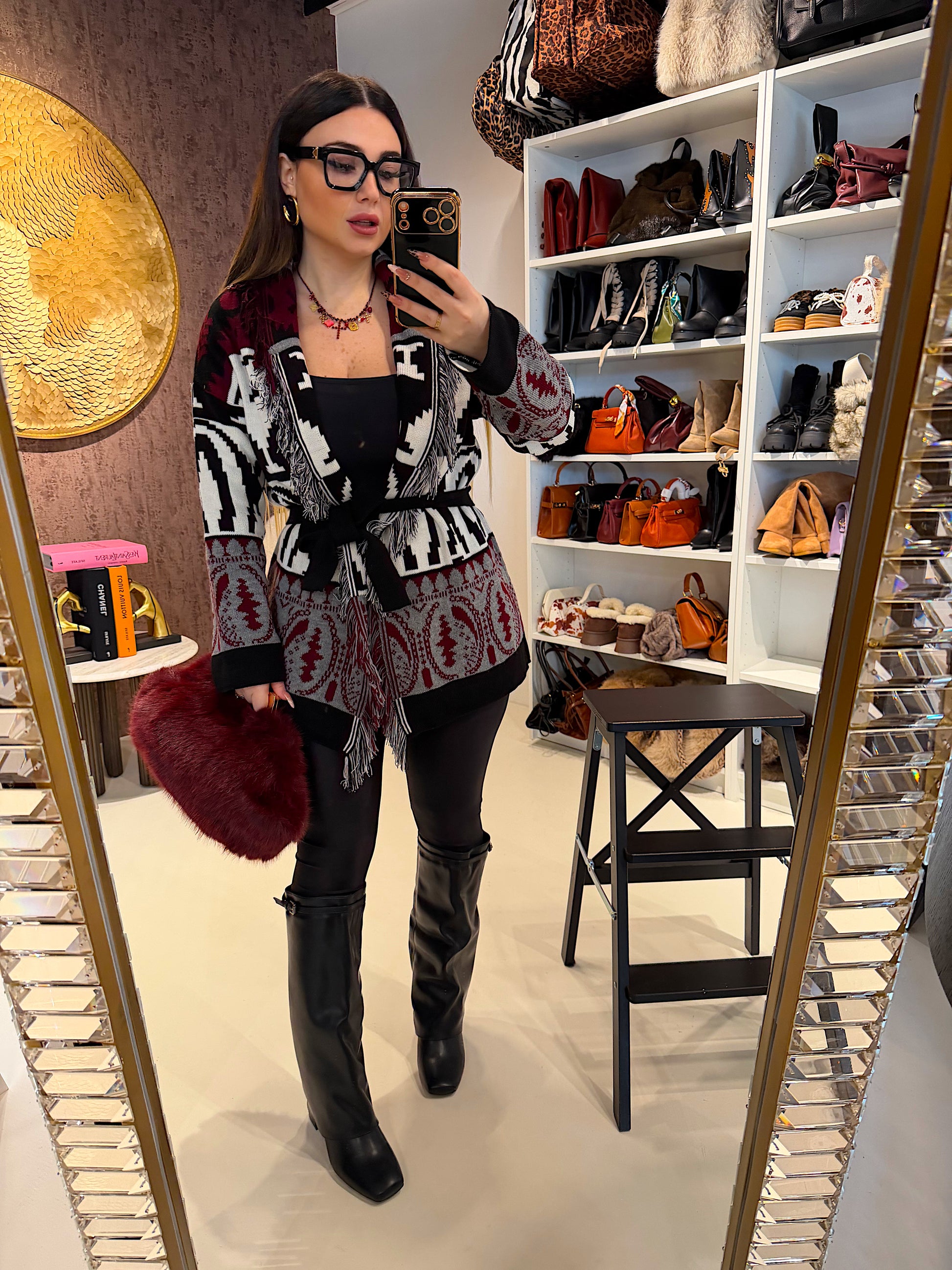Avvolgente e sofisticato, il cardigan Andina dona un tocco etnico-chic ai tuoi look autunnali. Realizzato in morbida maglia pesante nei toni del marrone e del beige, presenta un raffinato motivo geometrico ispirato ai tessuti andini e frange decorative sui bordi. La cintura in vita permette di valorizzare la silhouette mantenendo il massimo comfort.