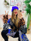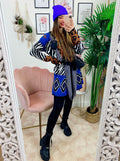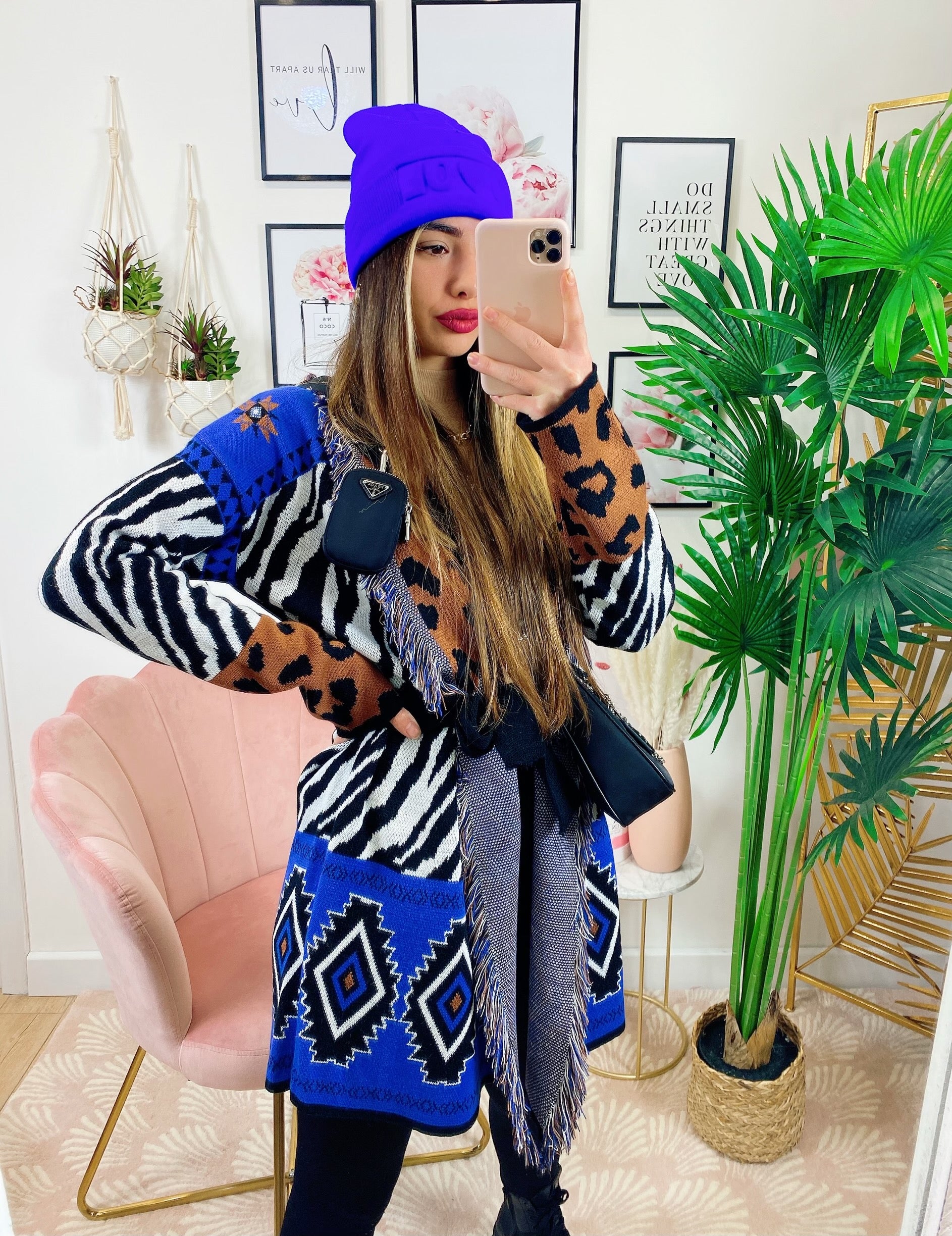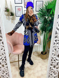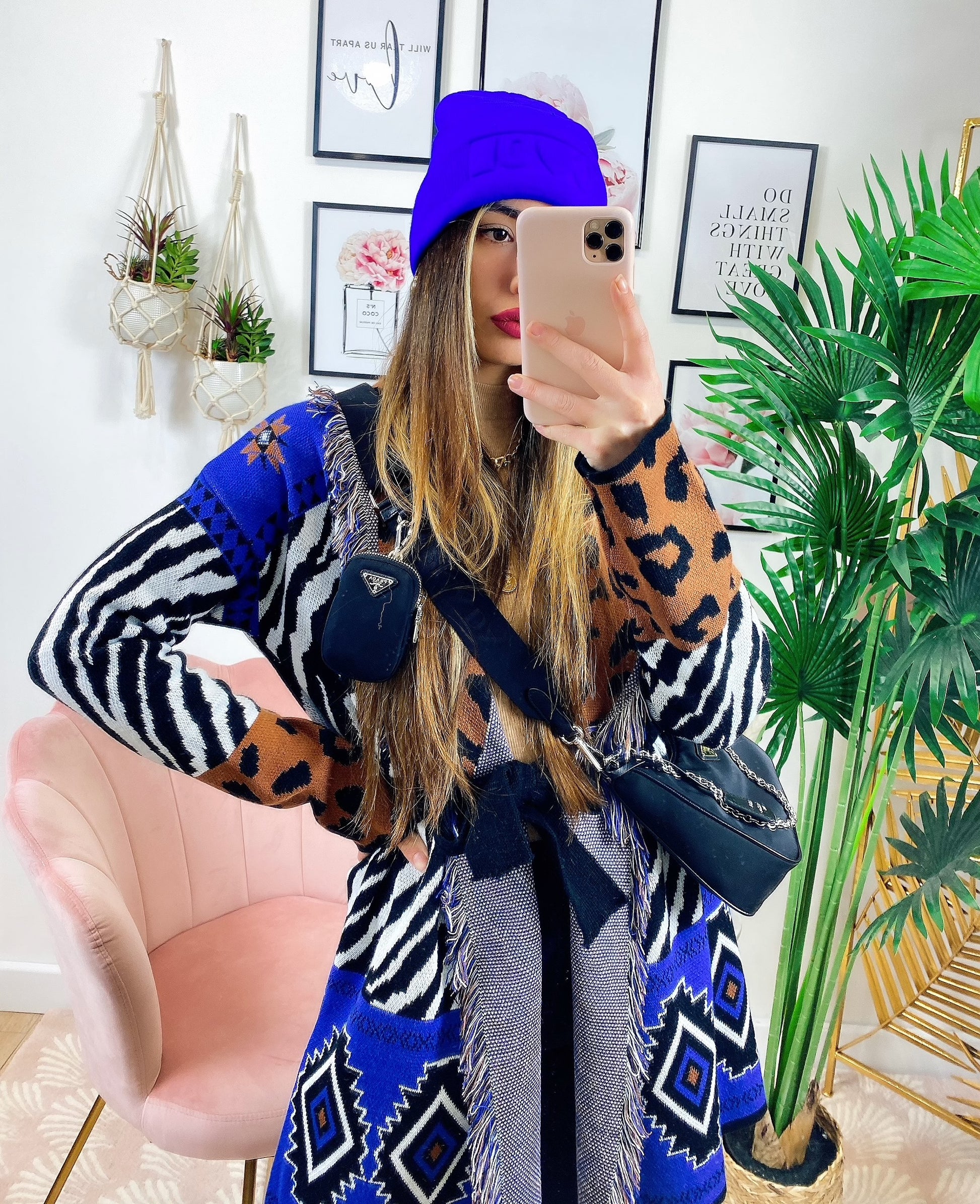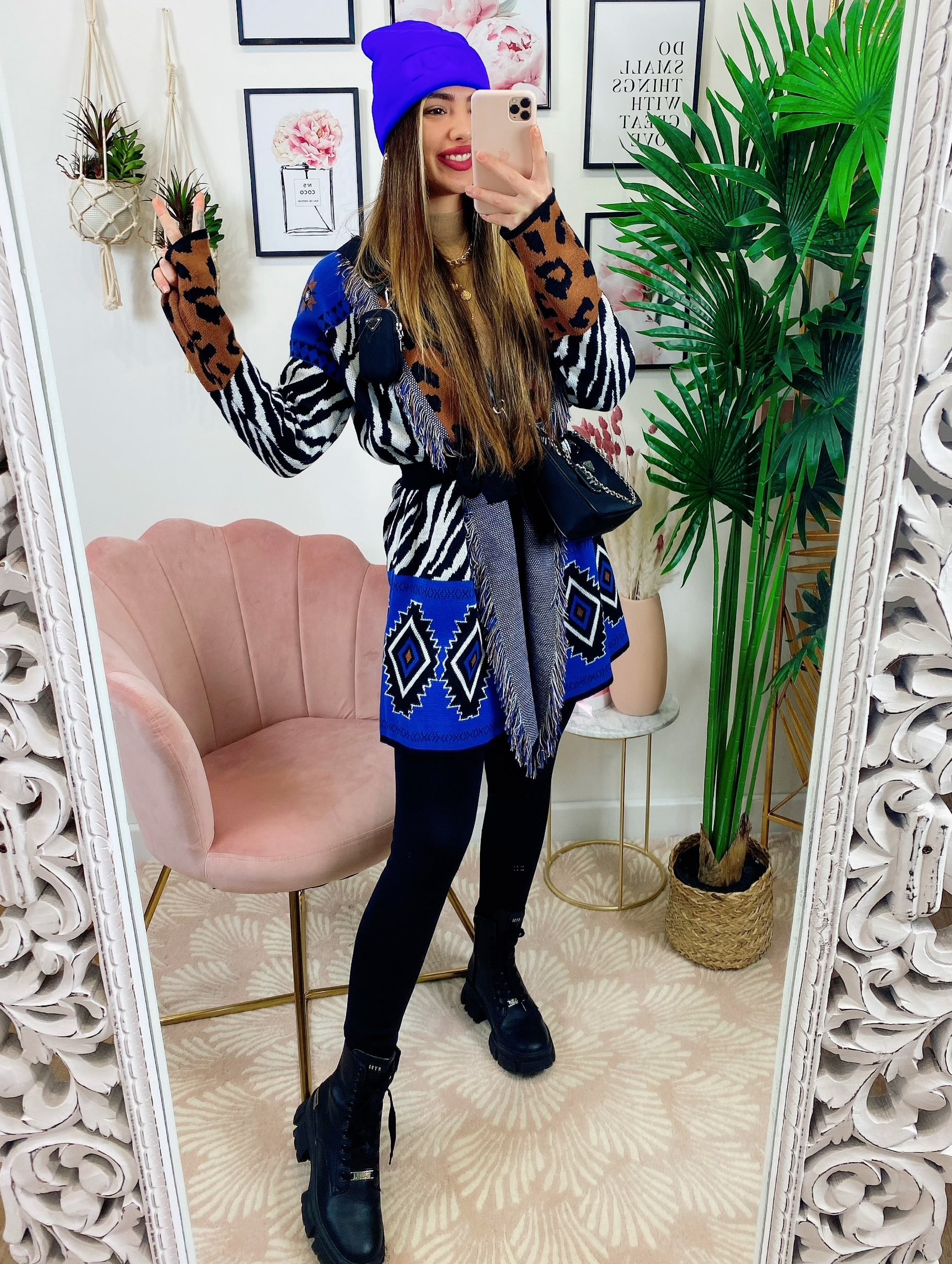 Cardigan Zebrato con dettagli maculari frange e cinta con sfondo Blu.