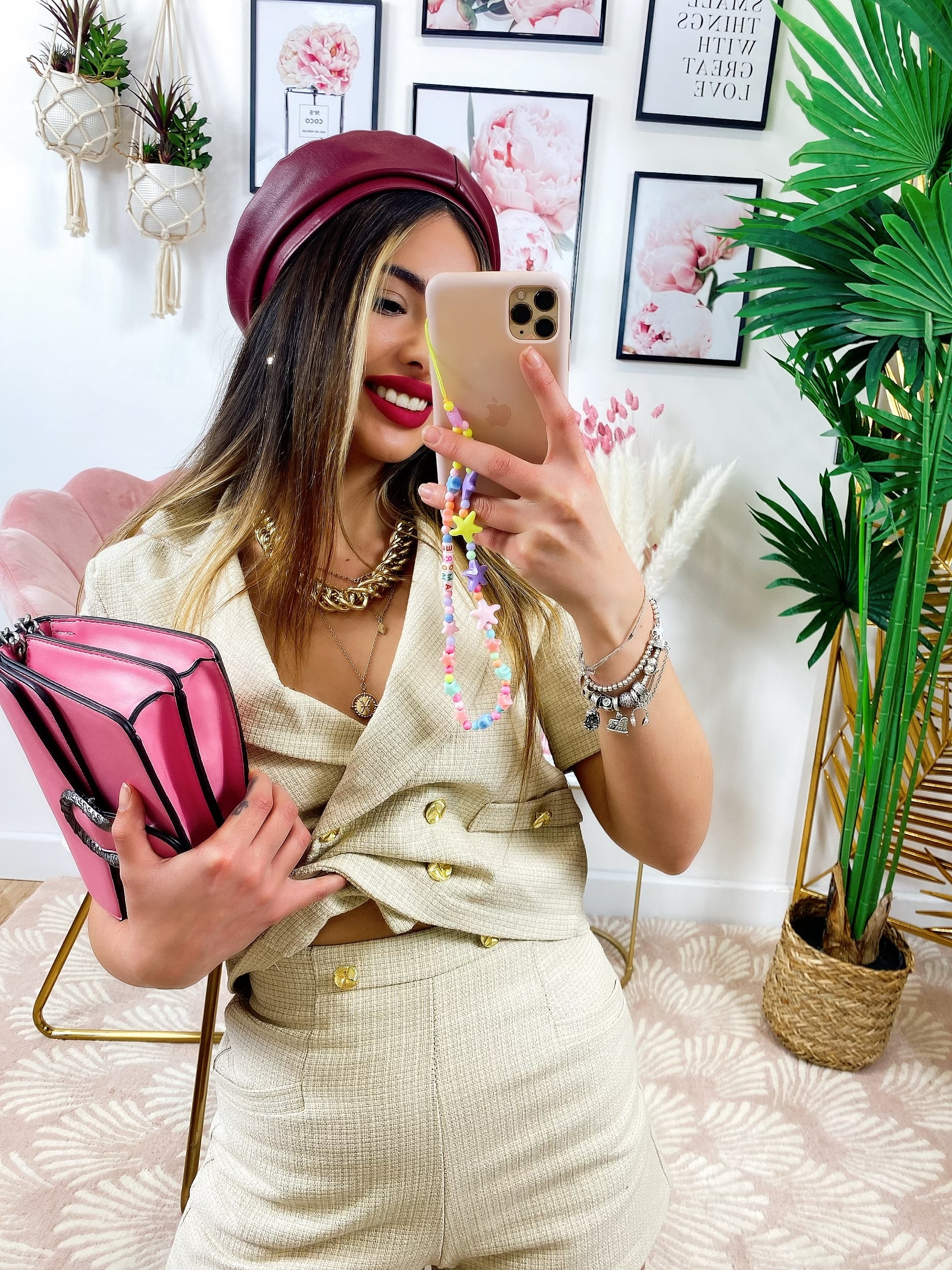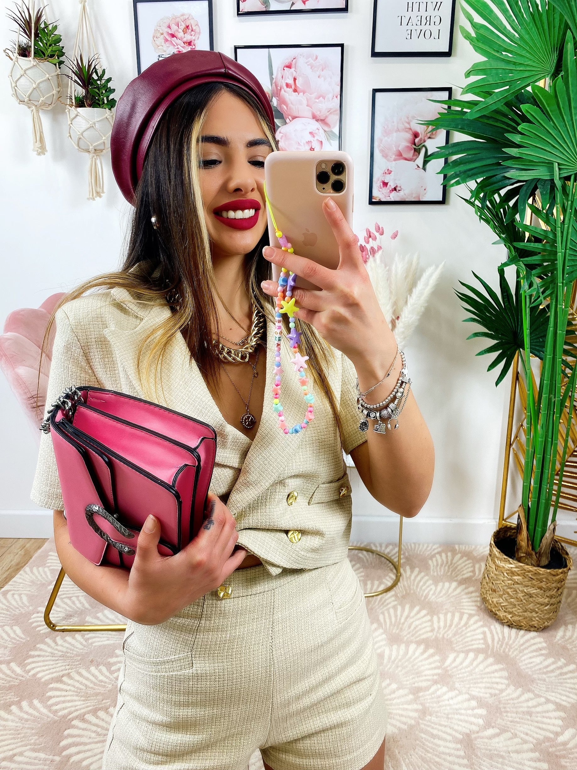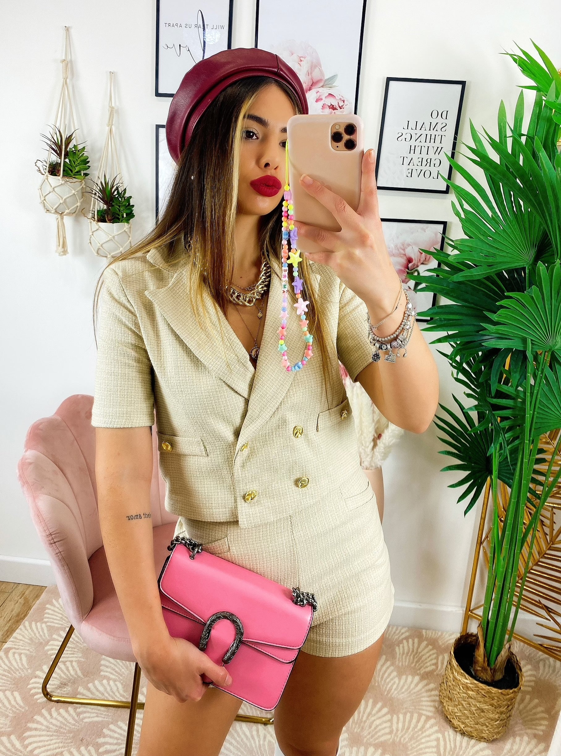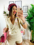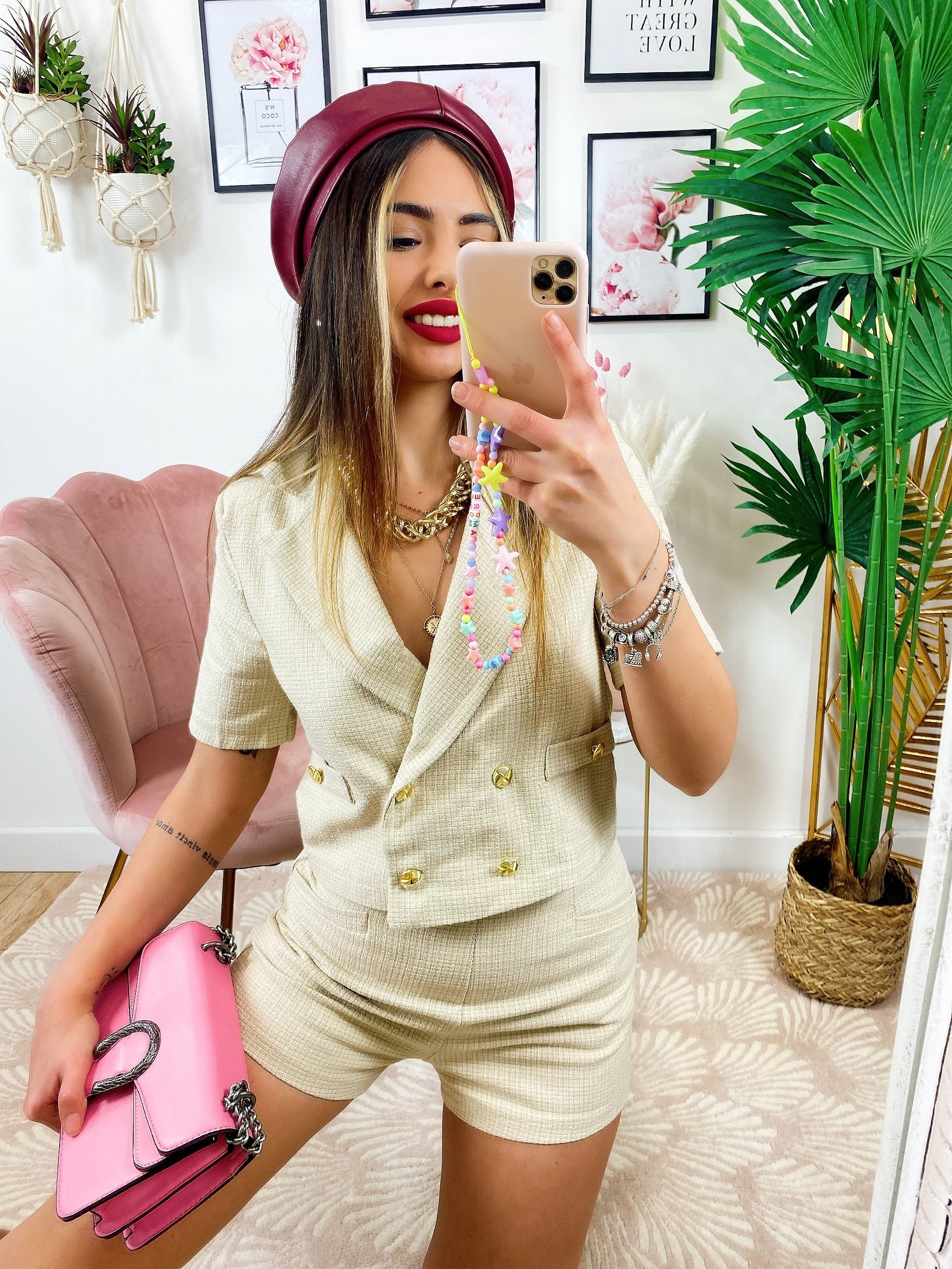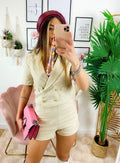 Completo beige con bottoni oro composta da Short più giacca con tasche leggermente elasticizzato.
