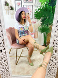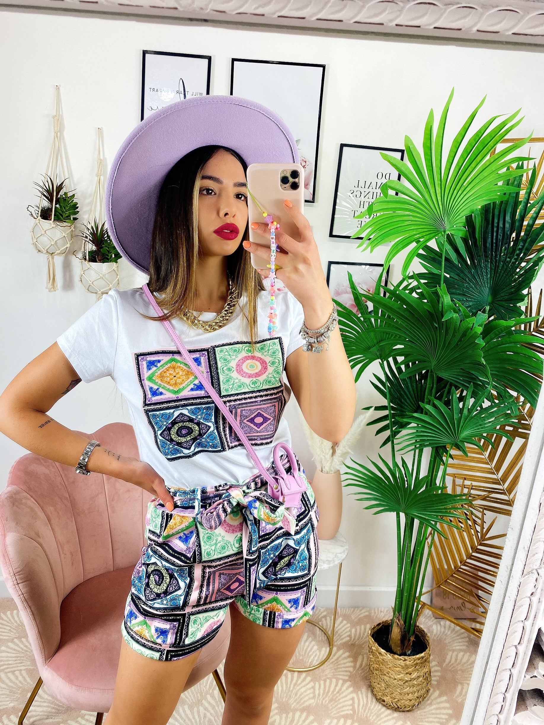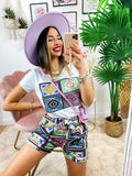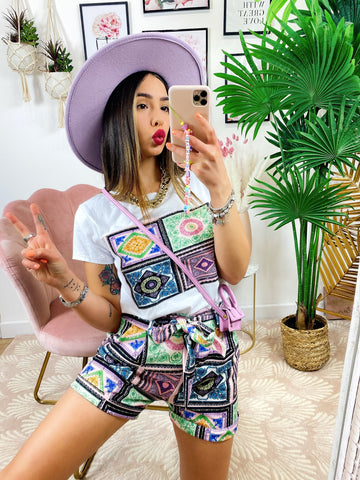 Completo etnico Short e t-shirt base Celeste e lilla