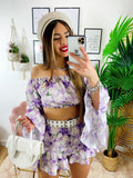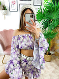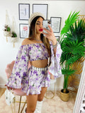 Completo pantaloncino e top con scollo a barchetta, manica ampia e elasticizzato sotto al seno.