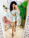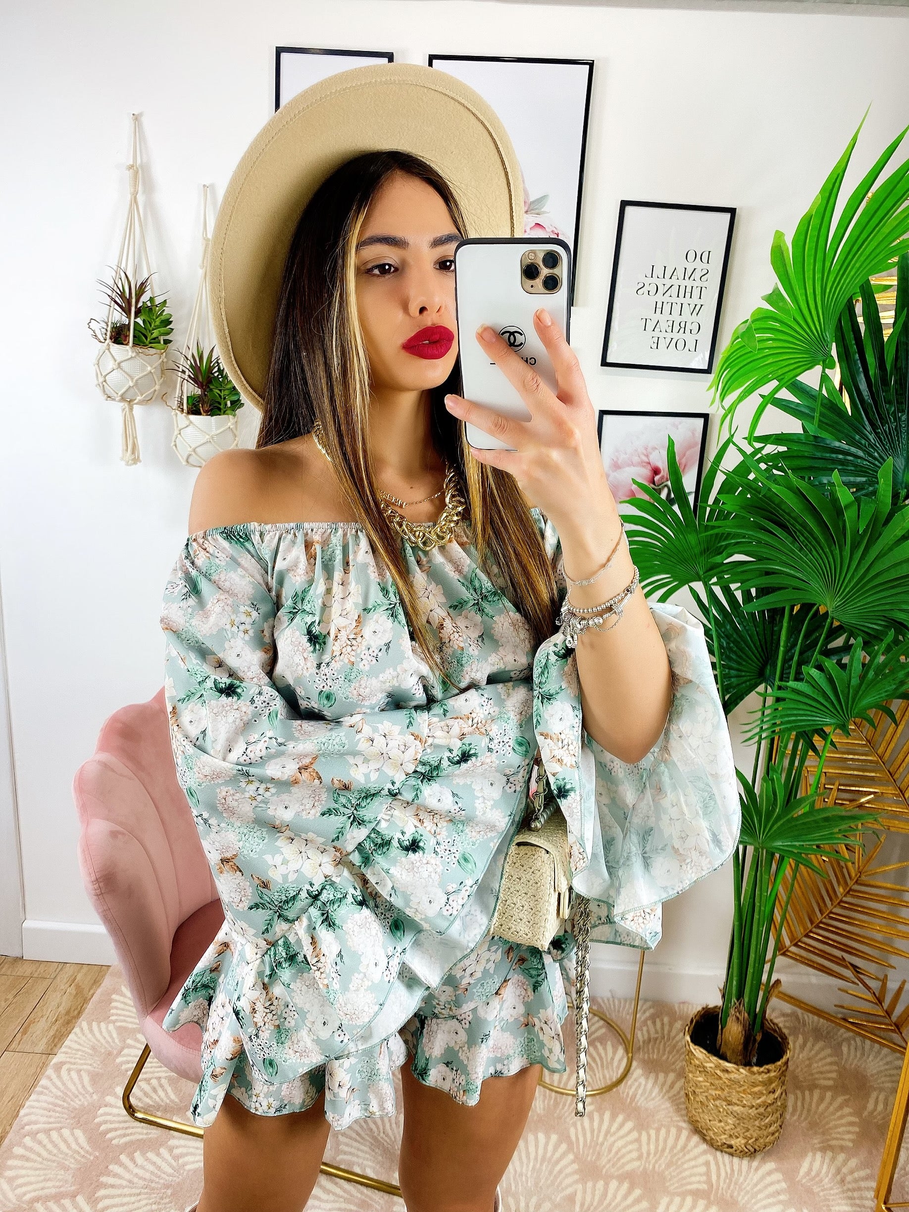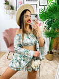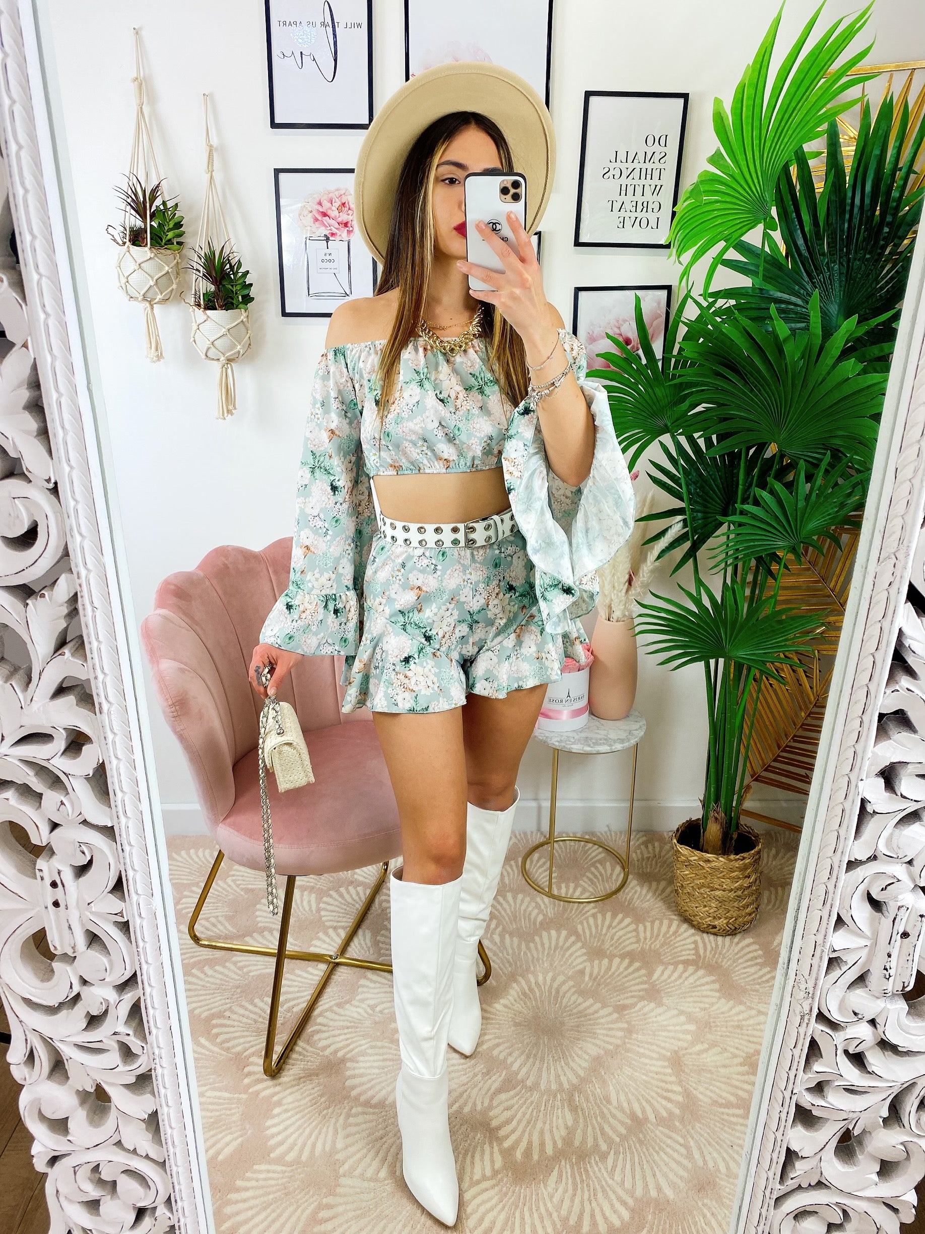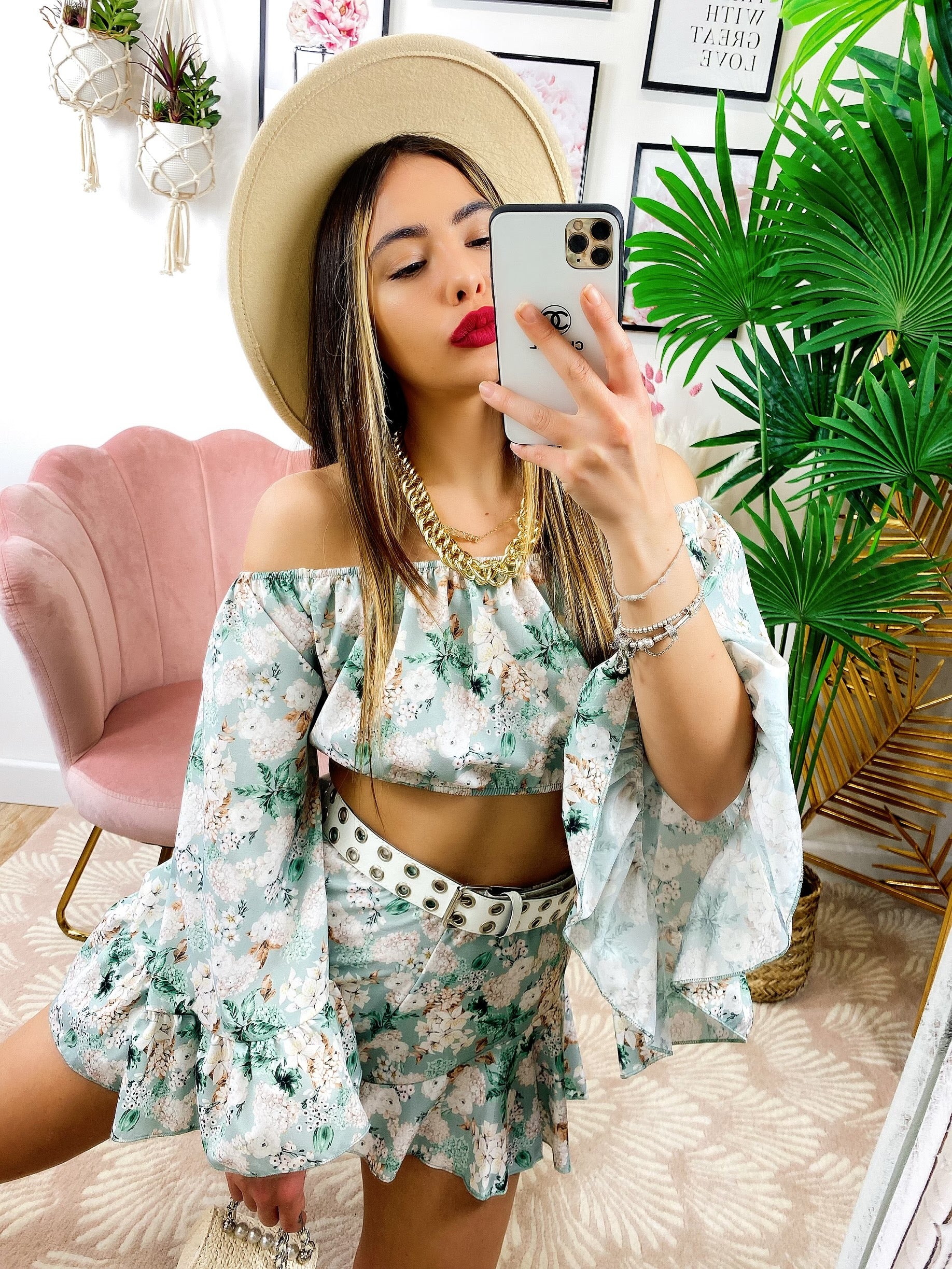 Completo pantaloncino e top con scollo a barchetta, manica ampia e elasticizzato sotto al seno.