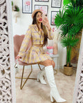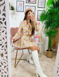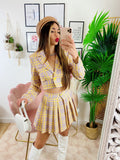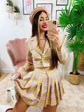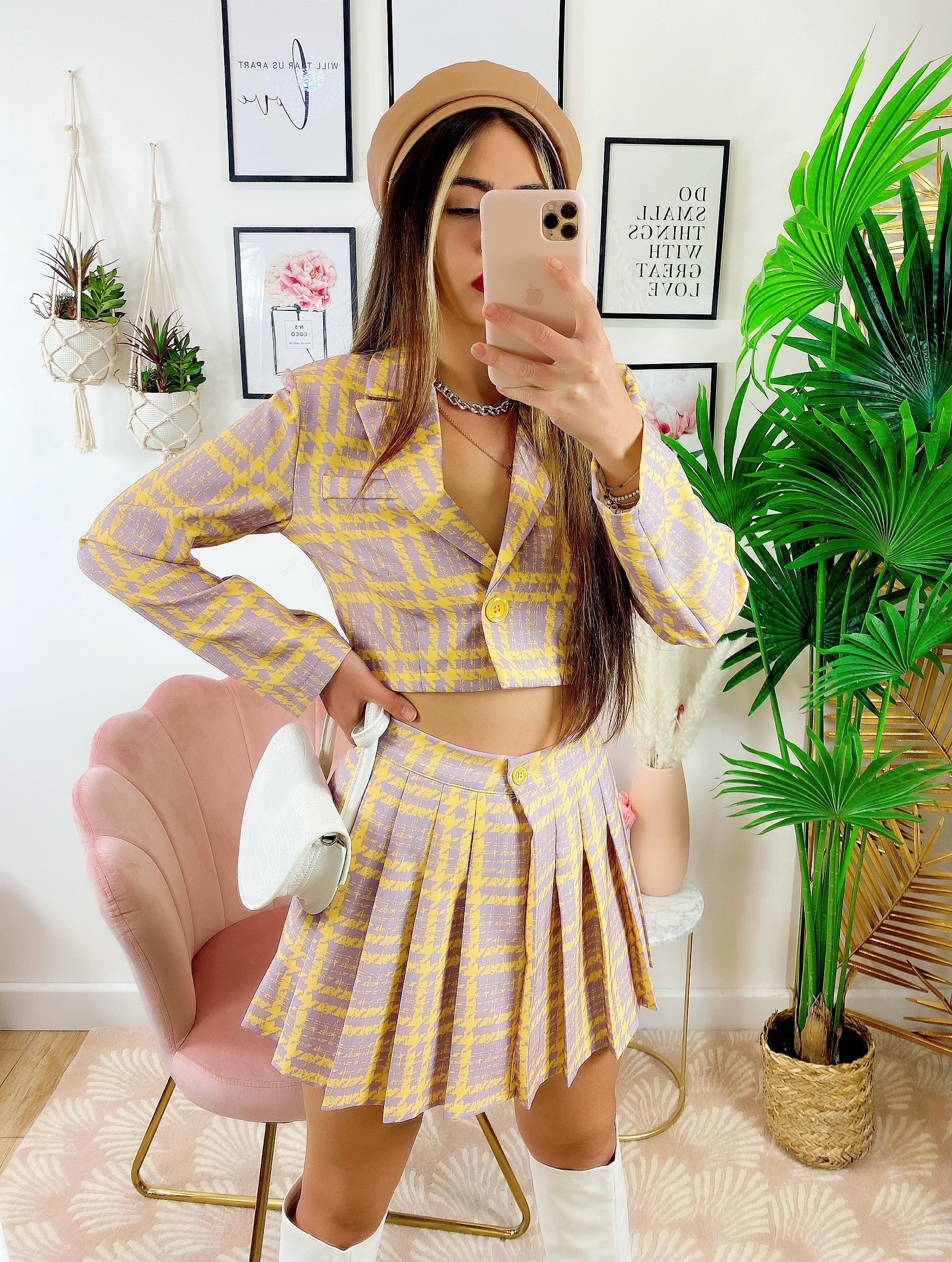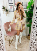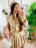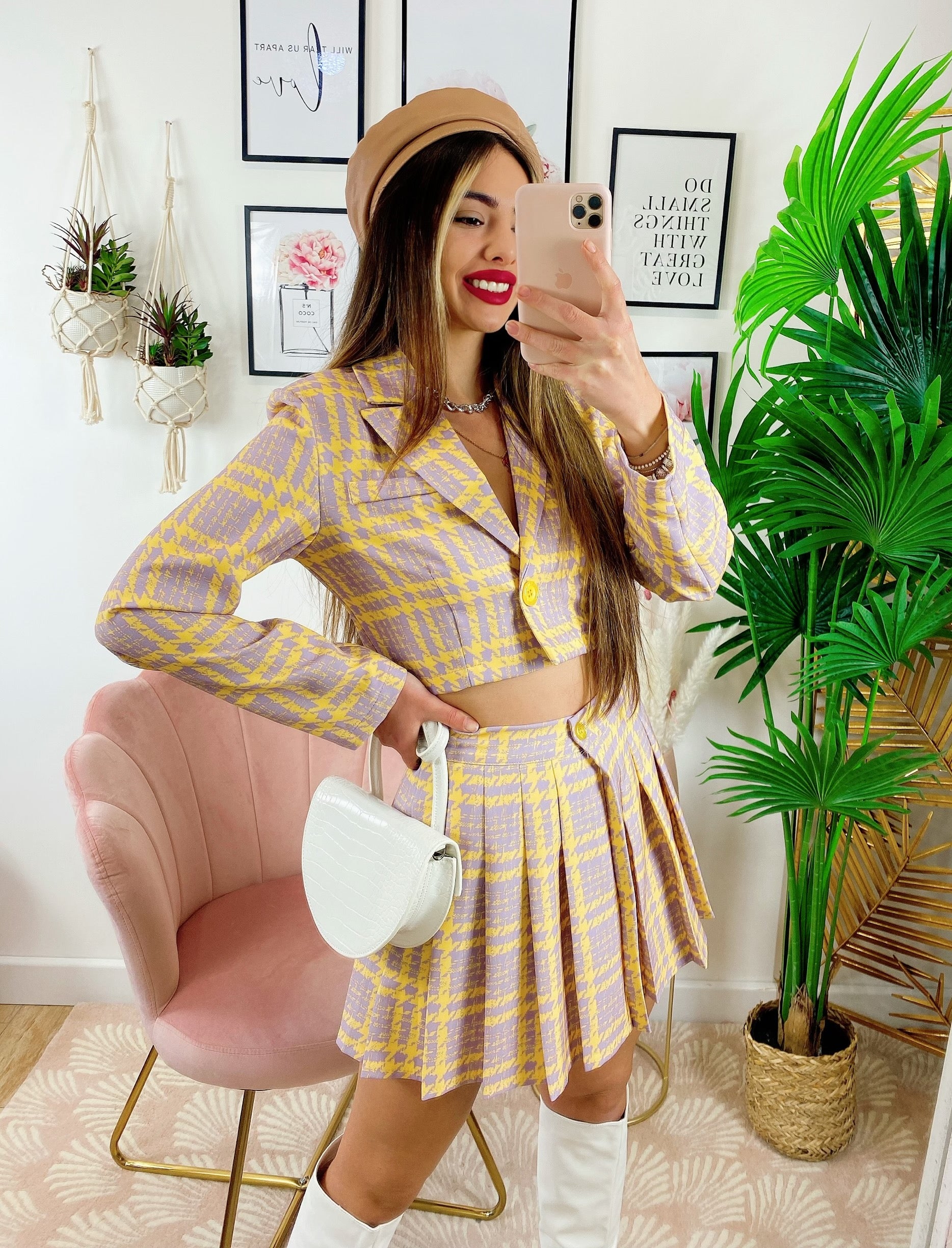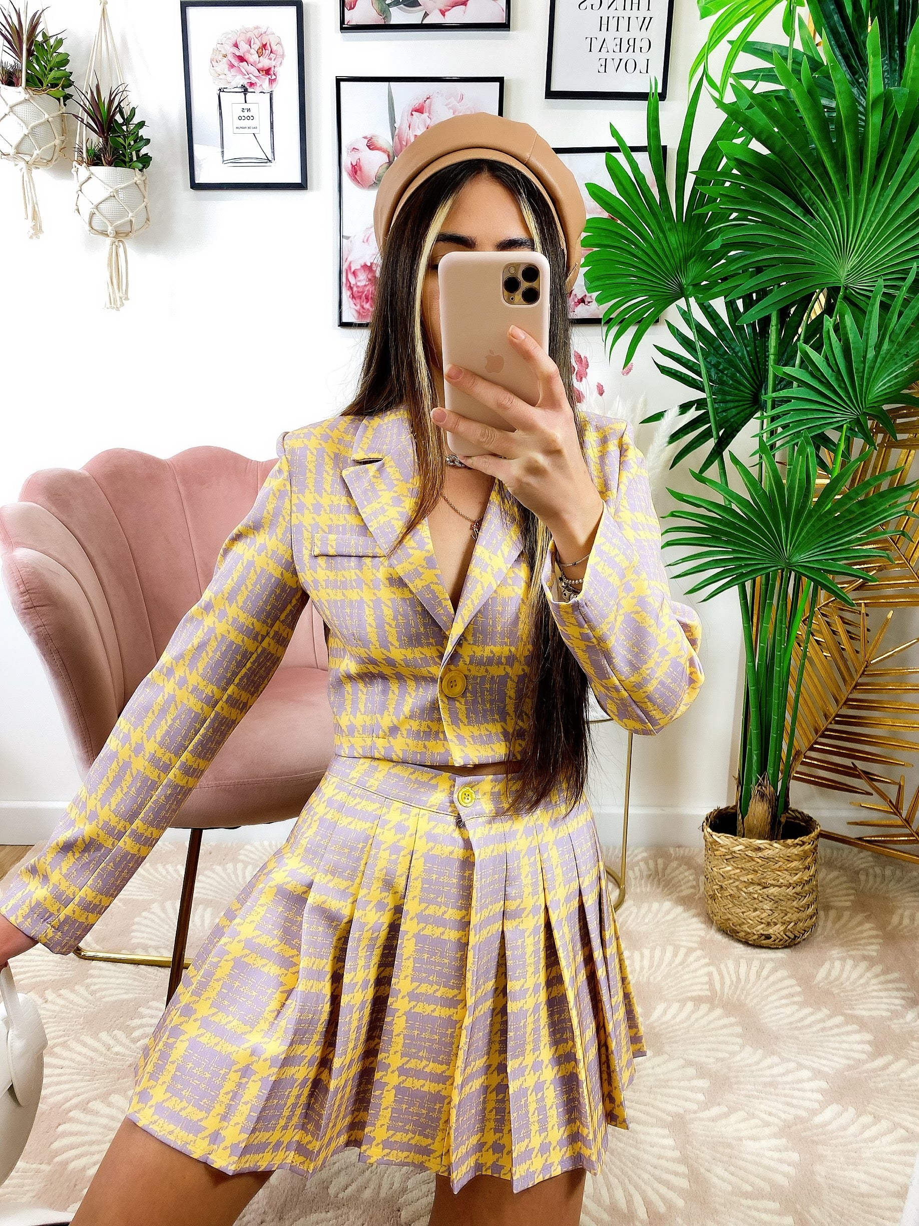 Completo Giacca Corta e Gonna Giallo, gonna a pieghine con bottone e zip, giacca con singolo bottone.