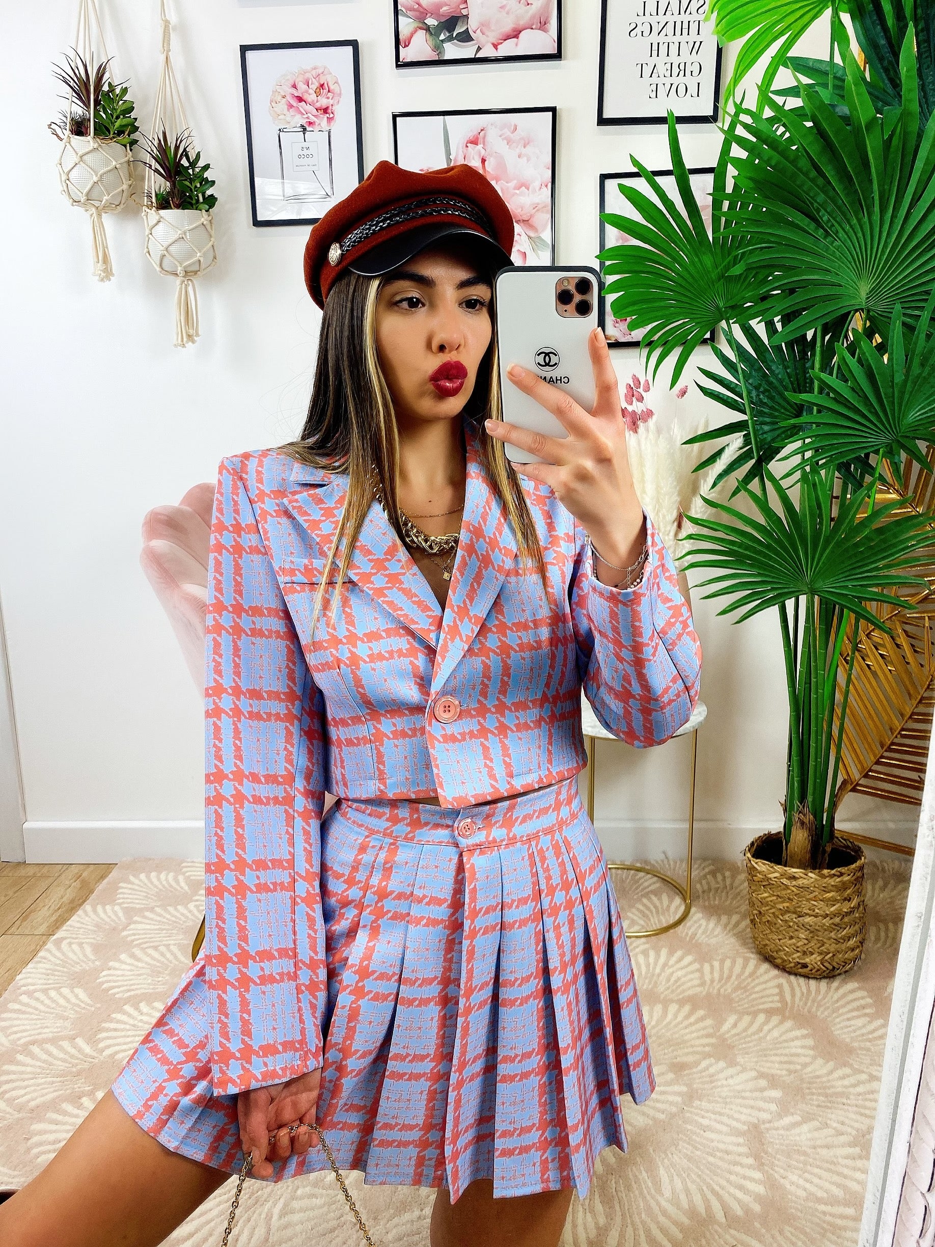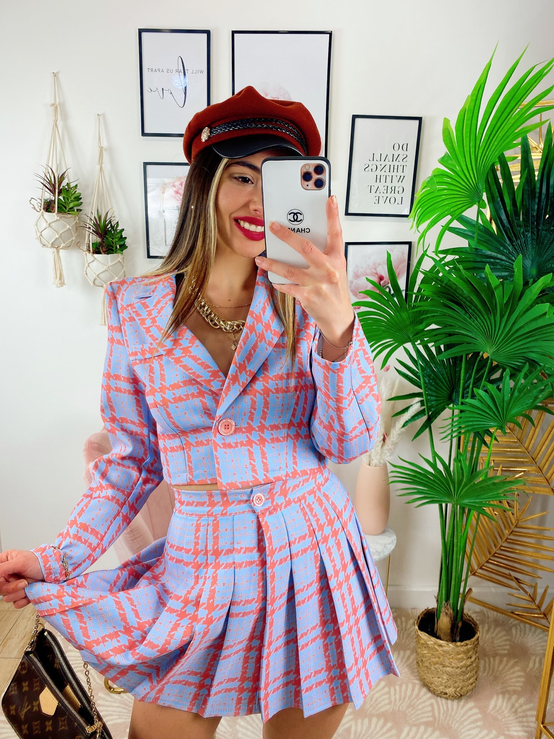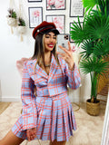 Completo Giacca Corta e Gonna Rosa, gonna a pieghine con bottone e zip, giacca con singolo bottone.