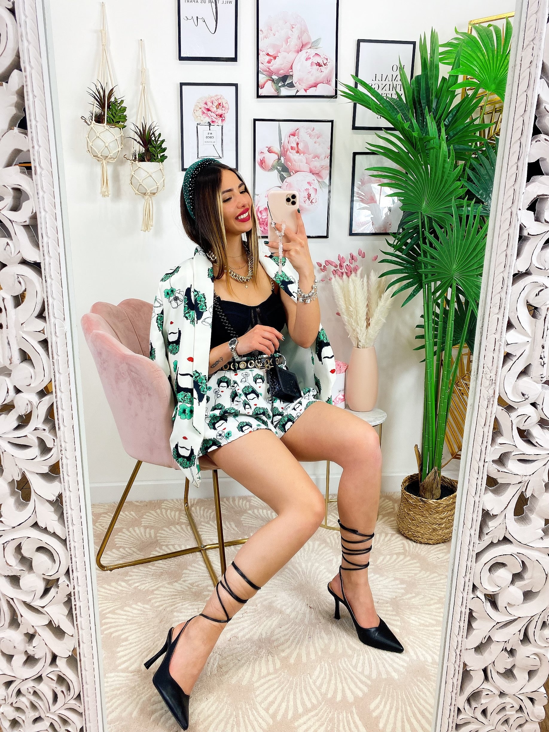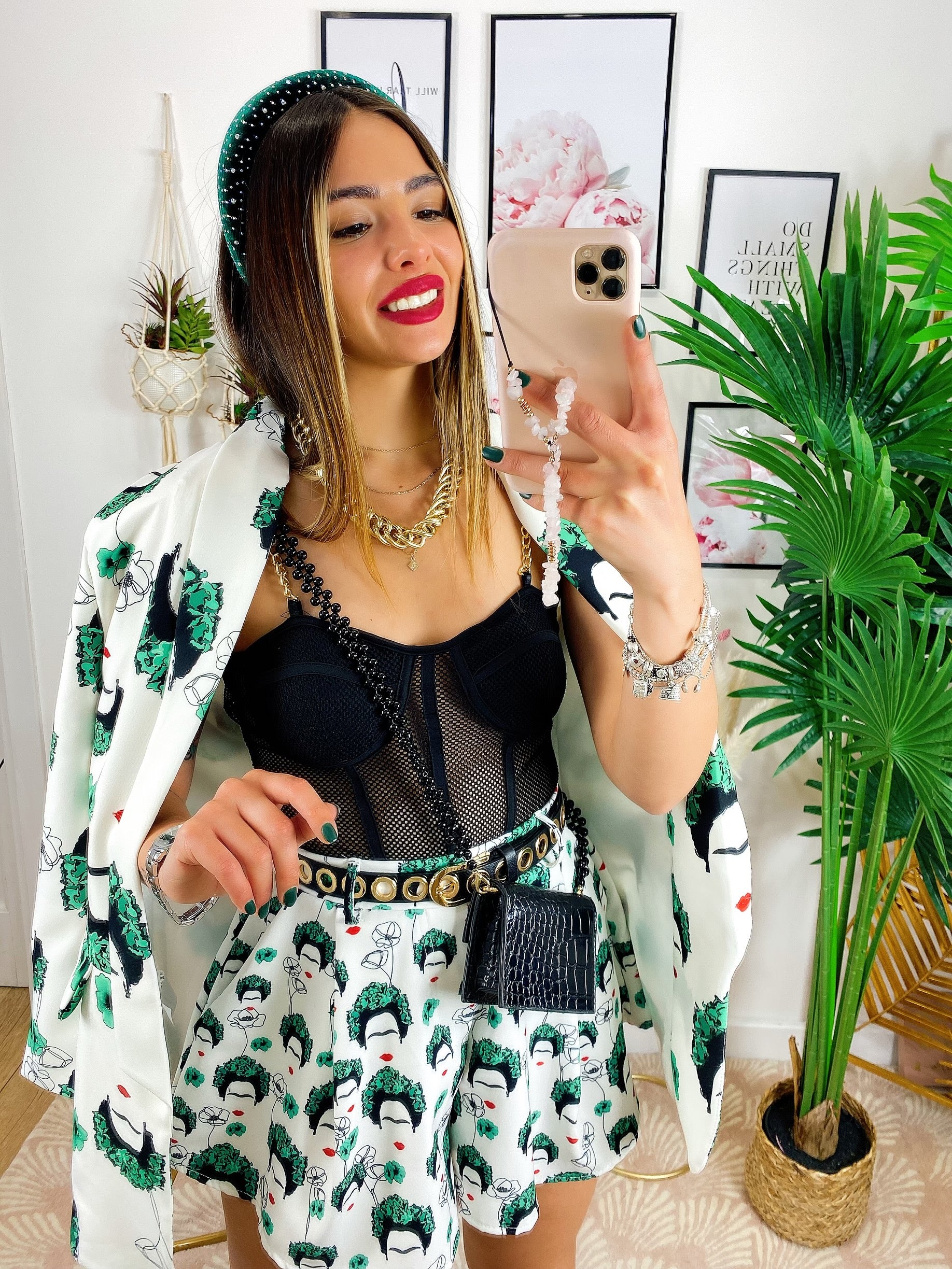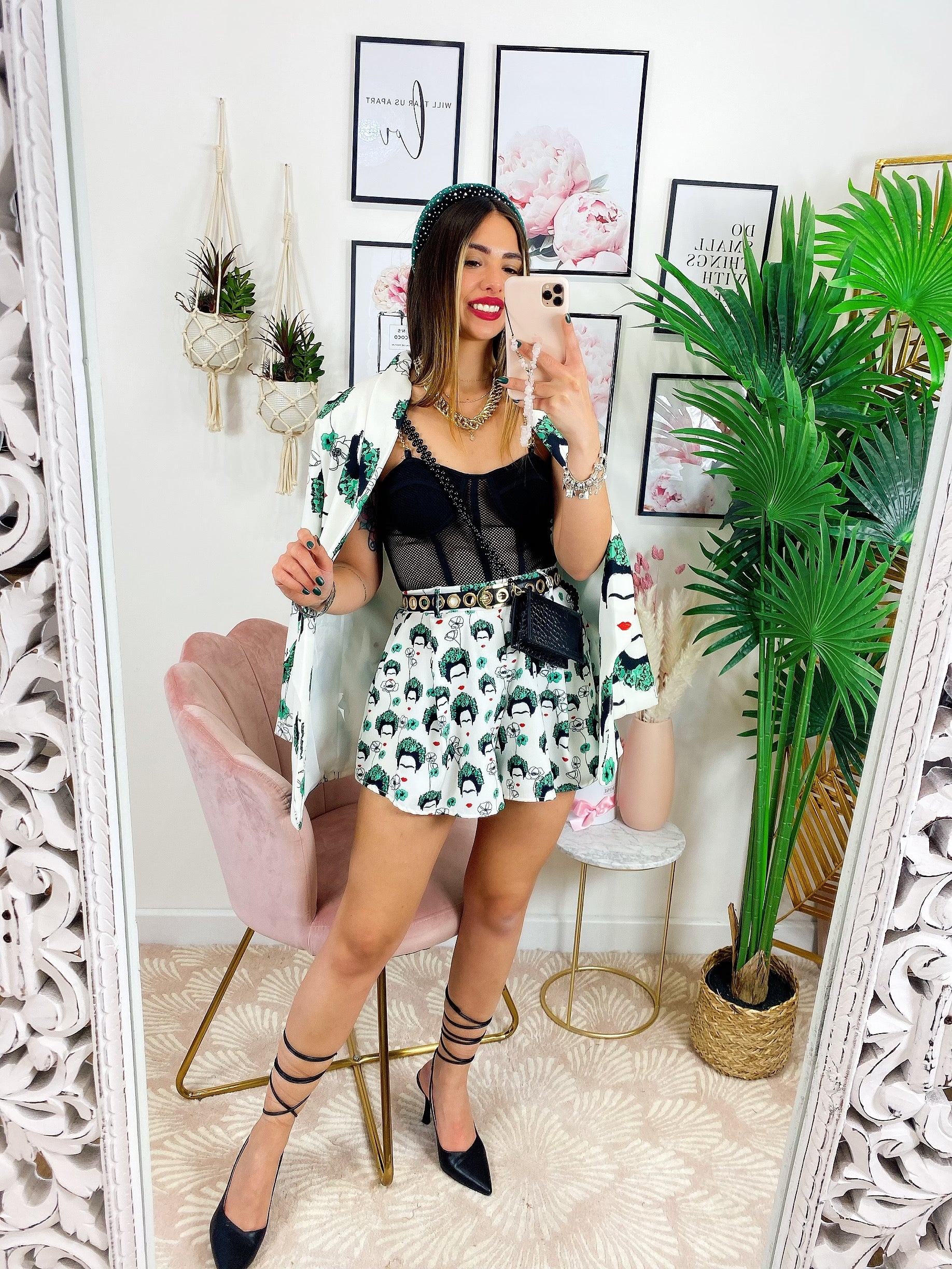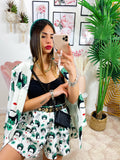 Completo giacca e pantalone dettaglio verde , Short elasticizzato con fiocco.