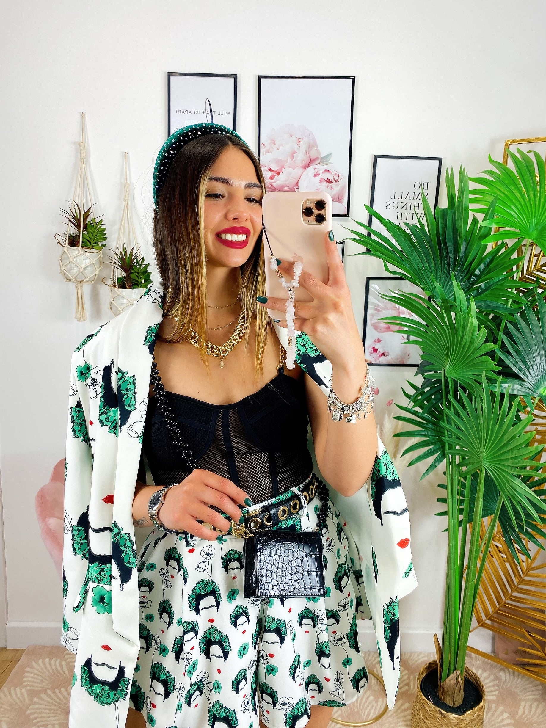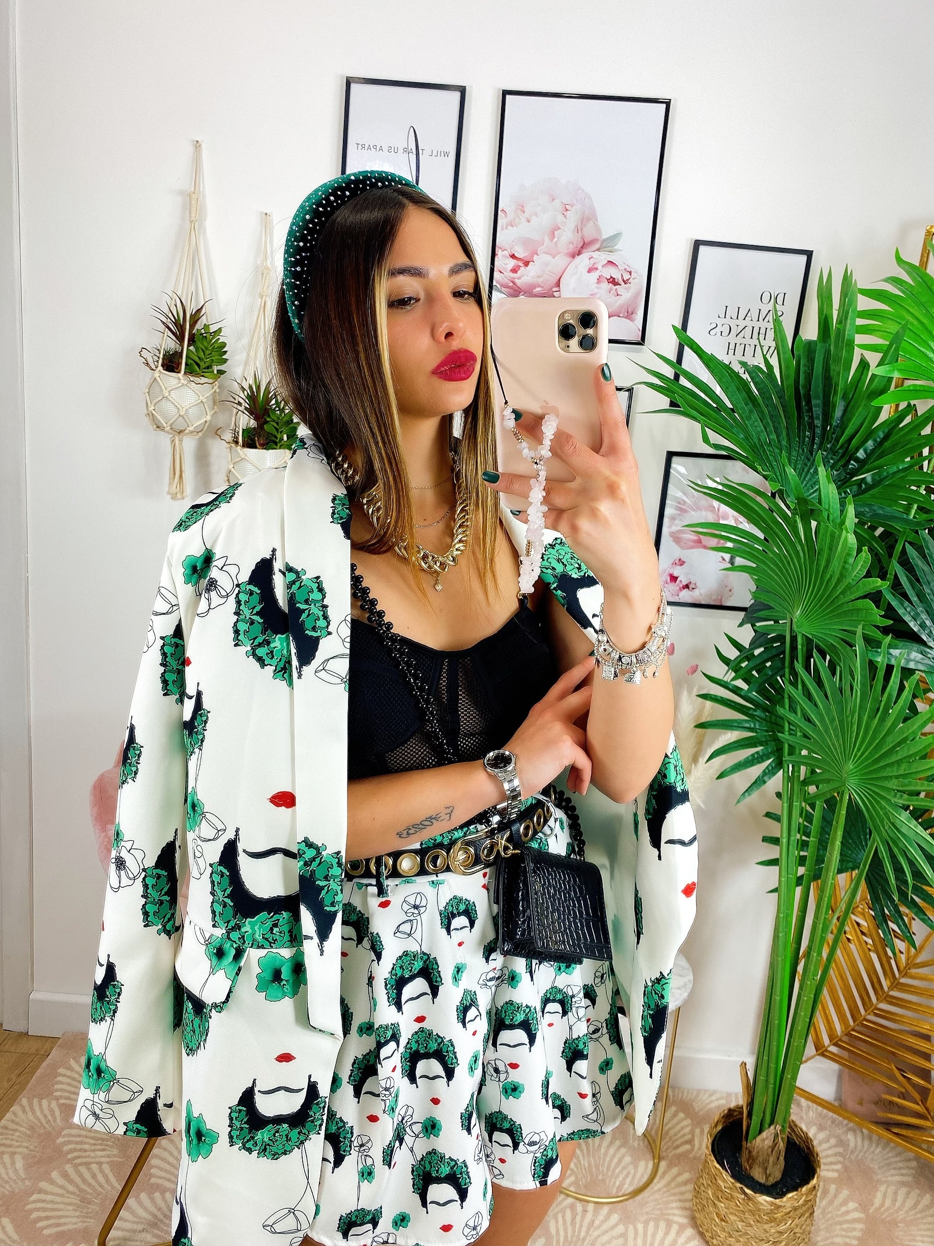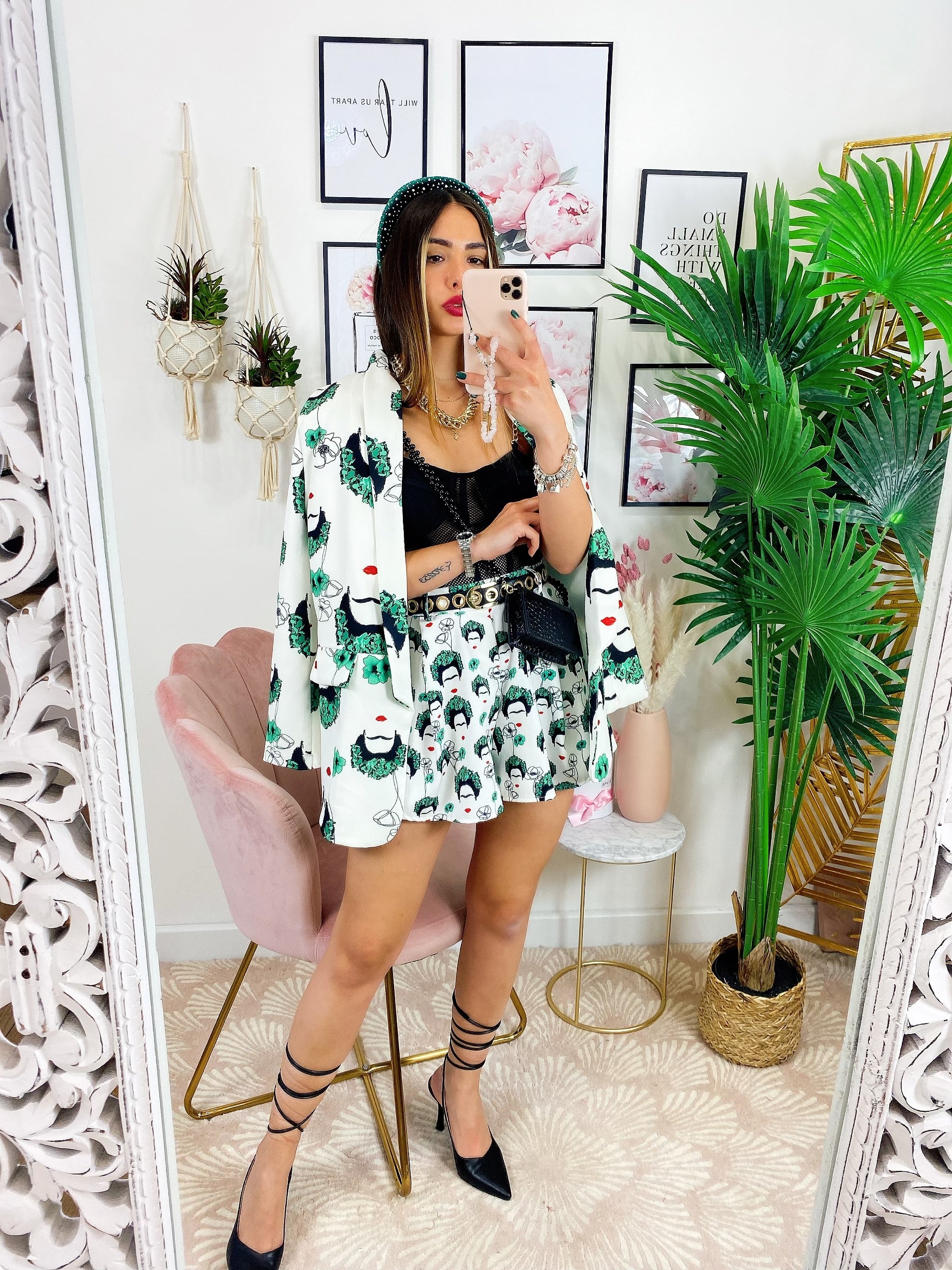 Completo giacca e pantalone dettaglio verde , Short elasticizzato con fiocco.