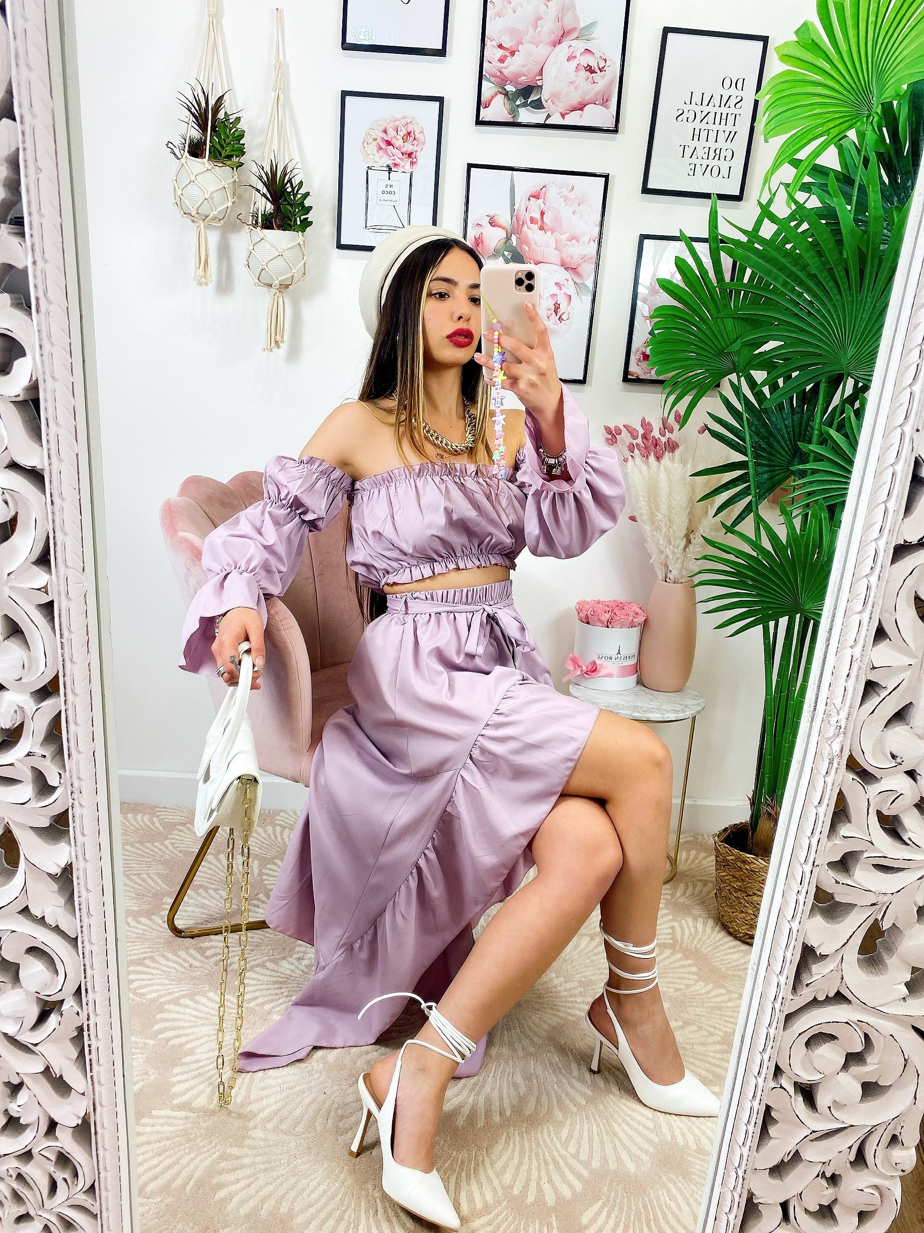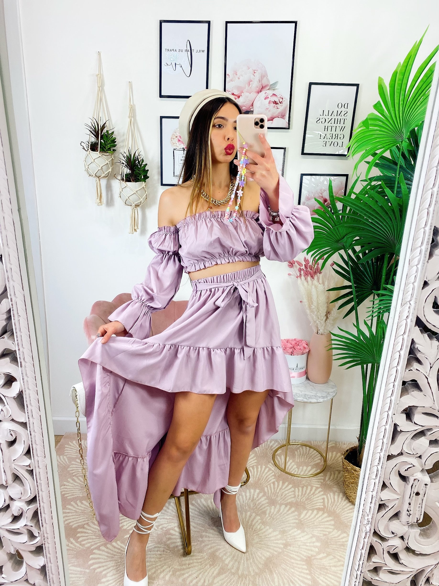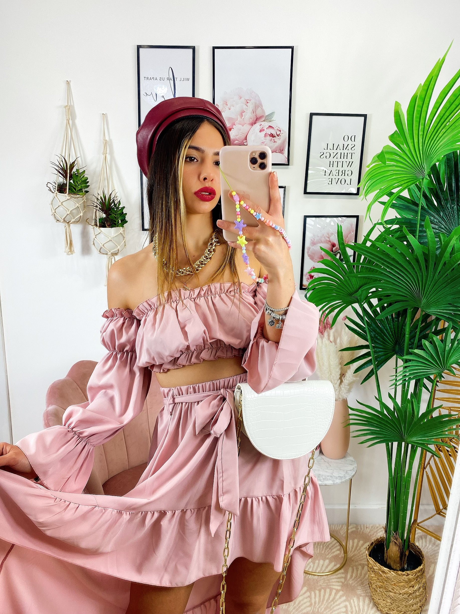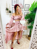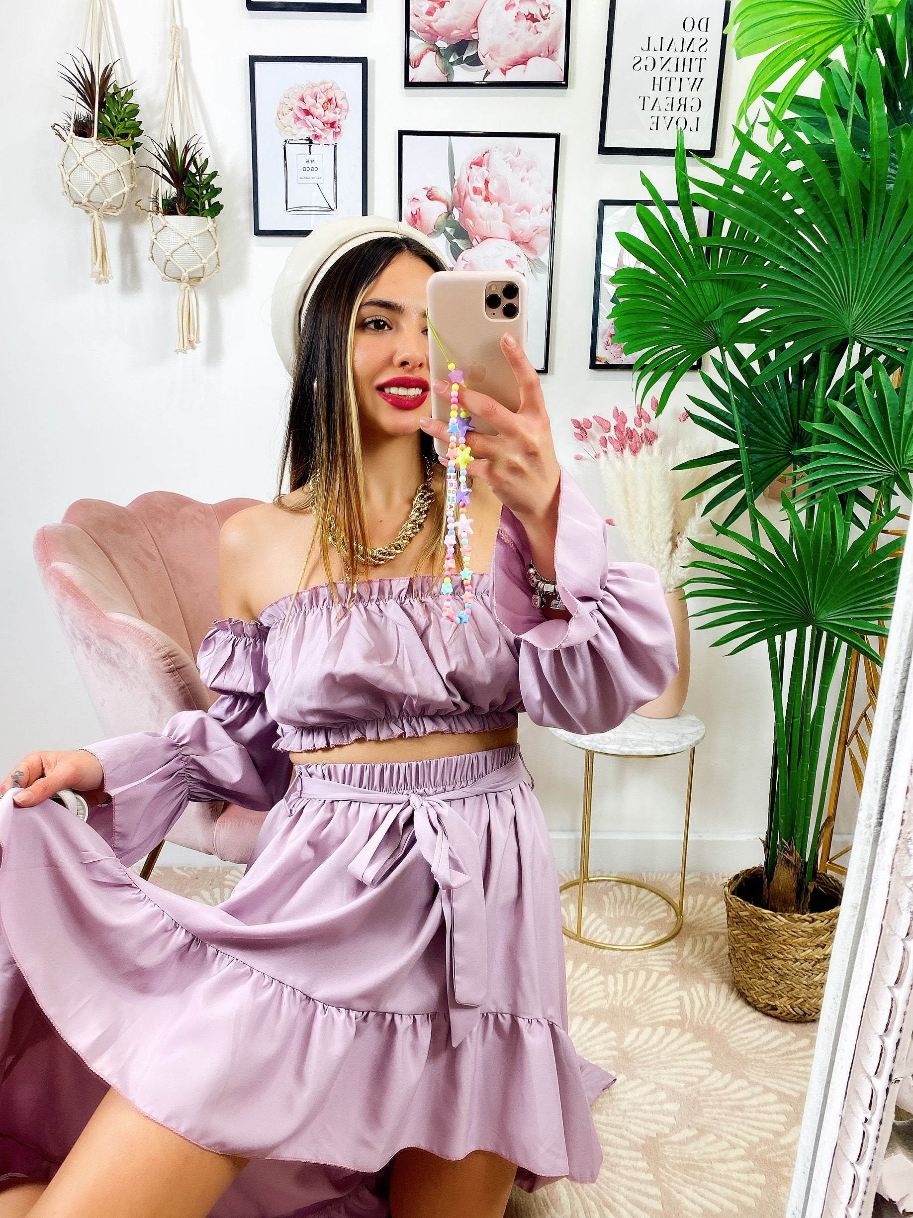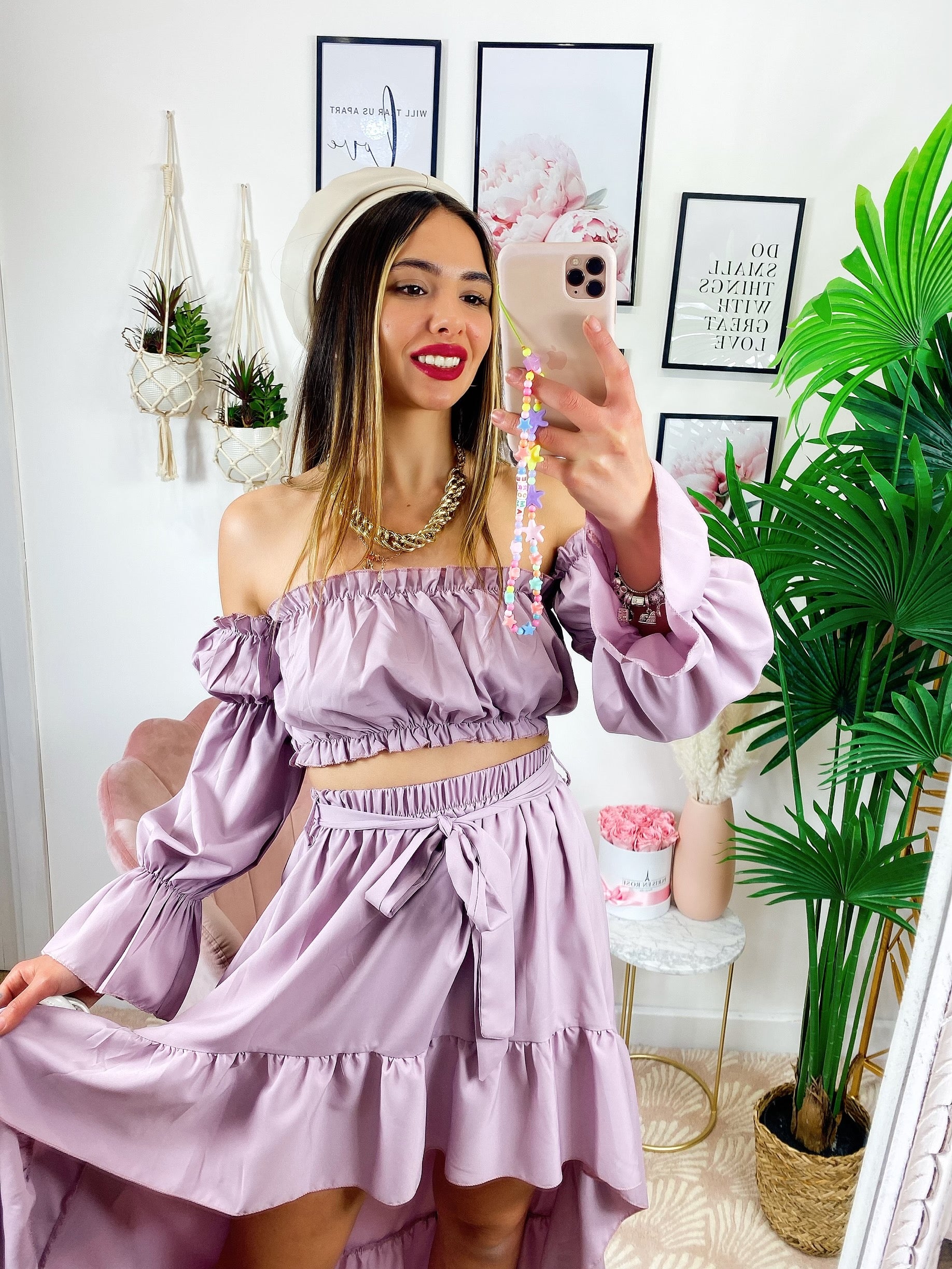 Completo Gonna con fiocco e top scollo a barchetta entrambi elasticizzati, prettamente estivi.