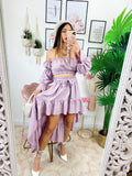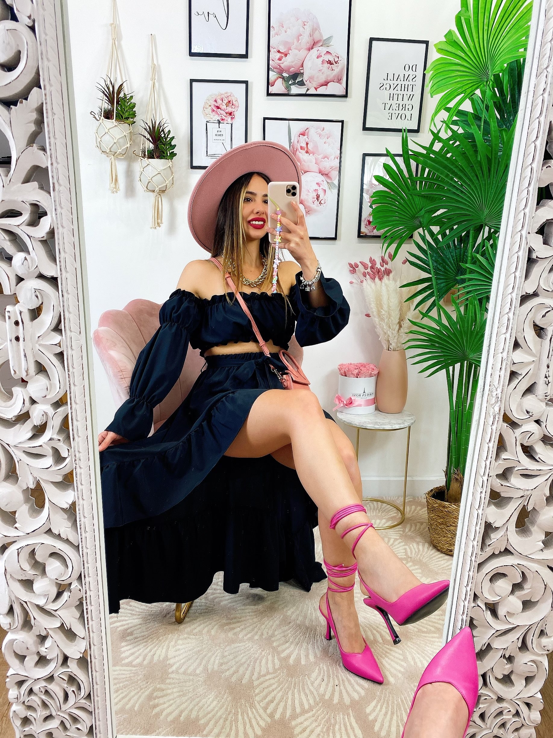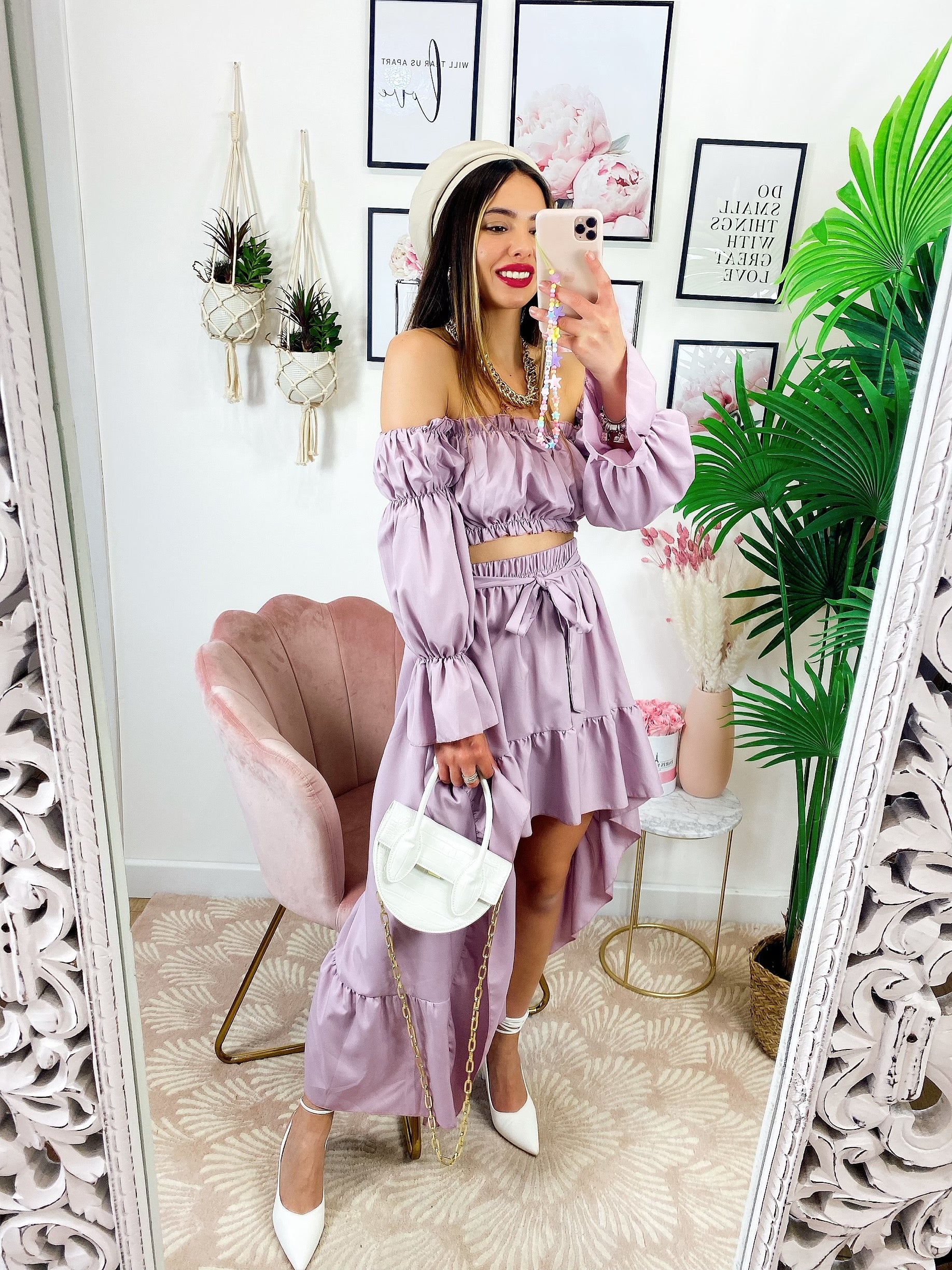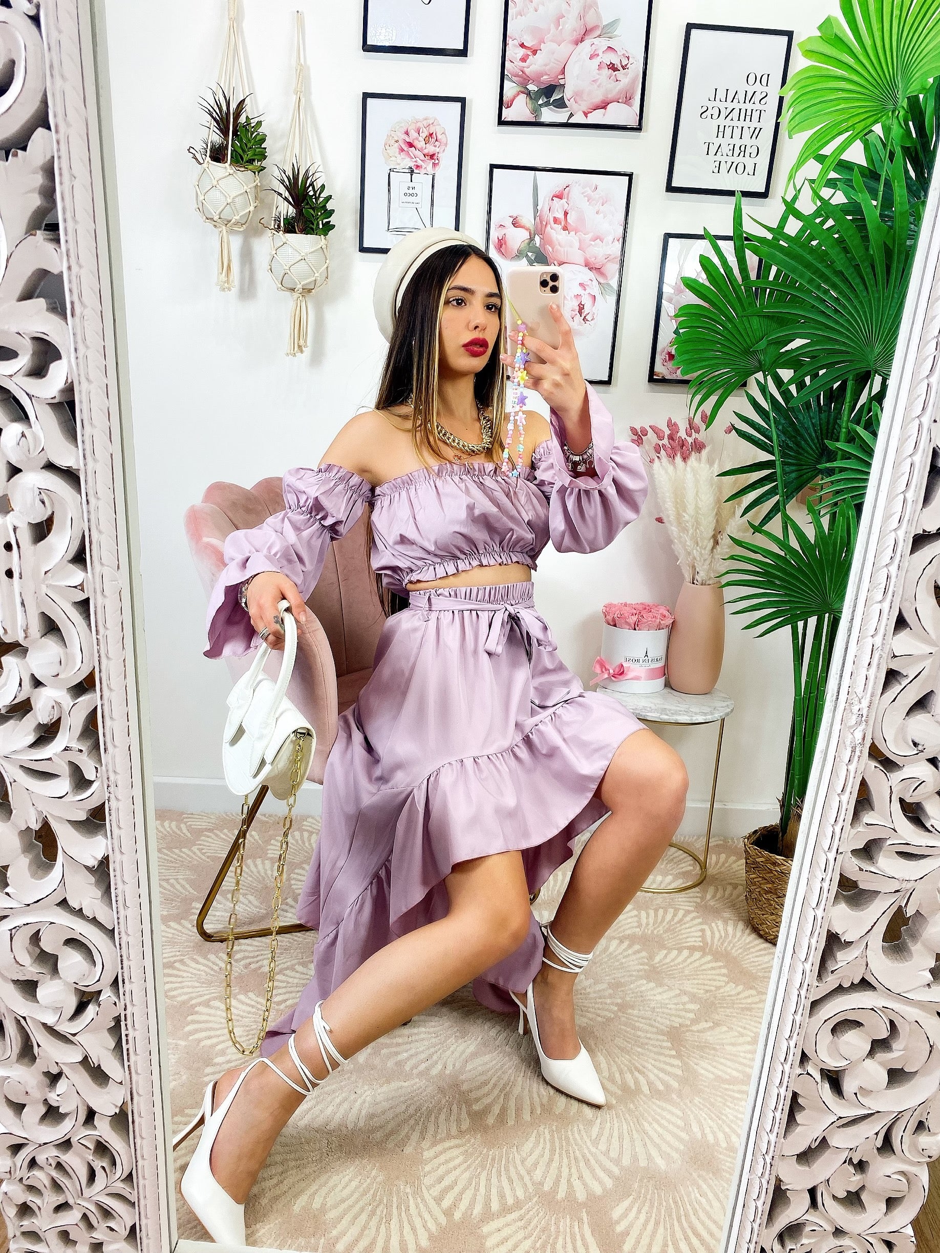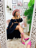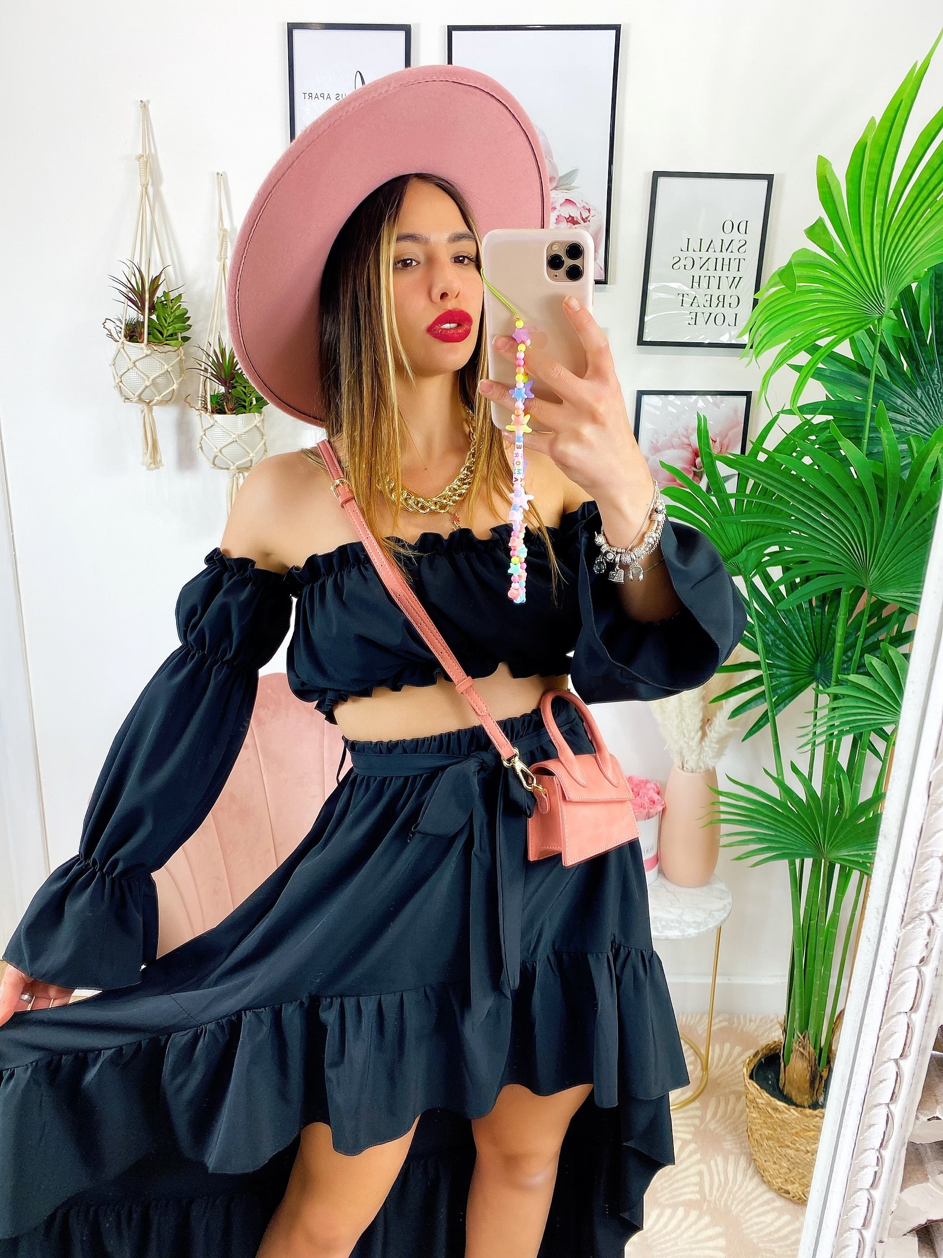 Completo Gonna con fiocco e top scollo a barchetta entrambi elasticizzati, prettamente estivi.