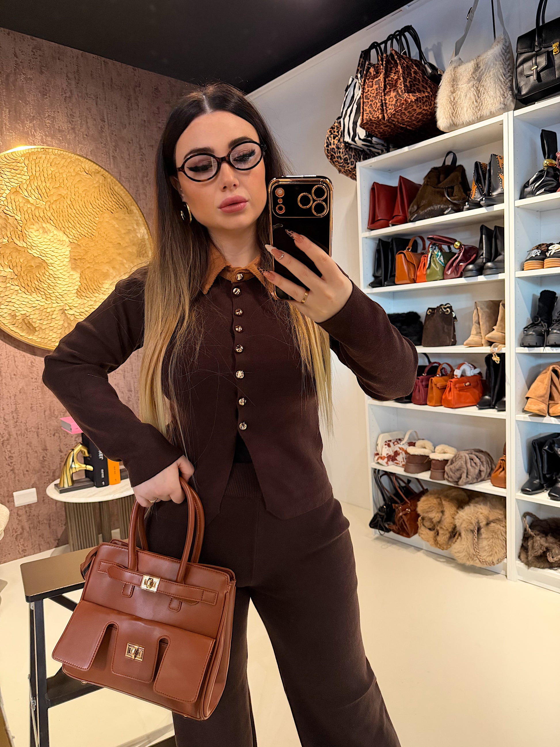 Un set elegante e versatile perfetto per la stagione più fresca. Il completo è composto da un cardigan in maglia con bottoni gioiello e colletto in velluto a coste a contrasto, abbinato a pantaloni lunghi dal taglio morbido e confortevole