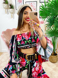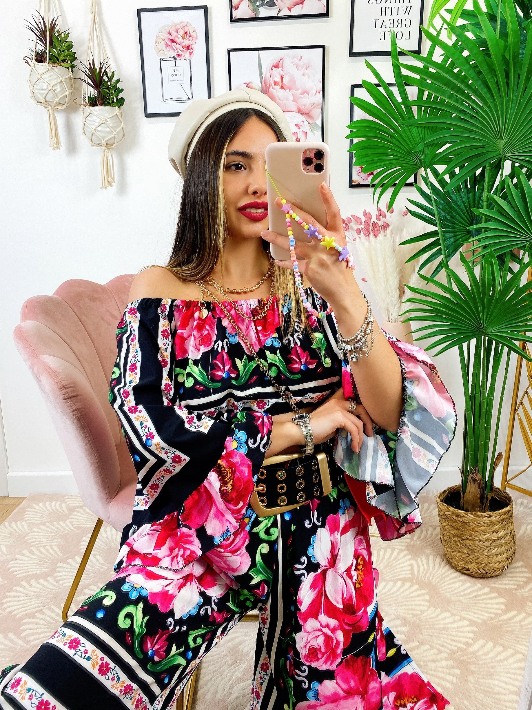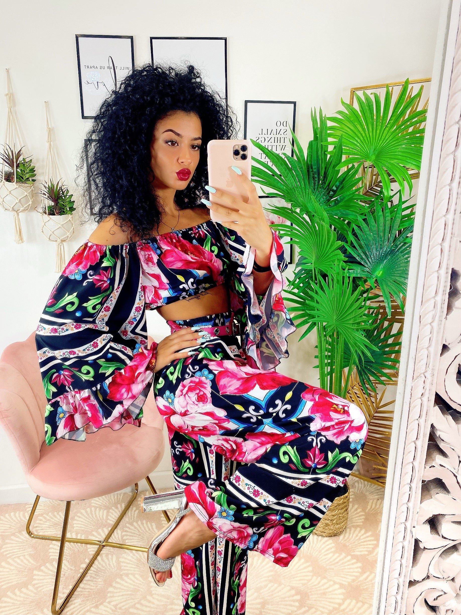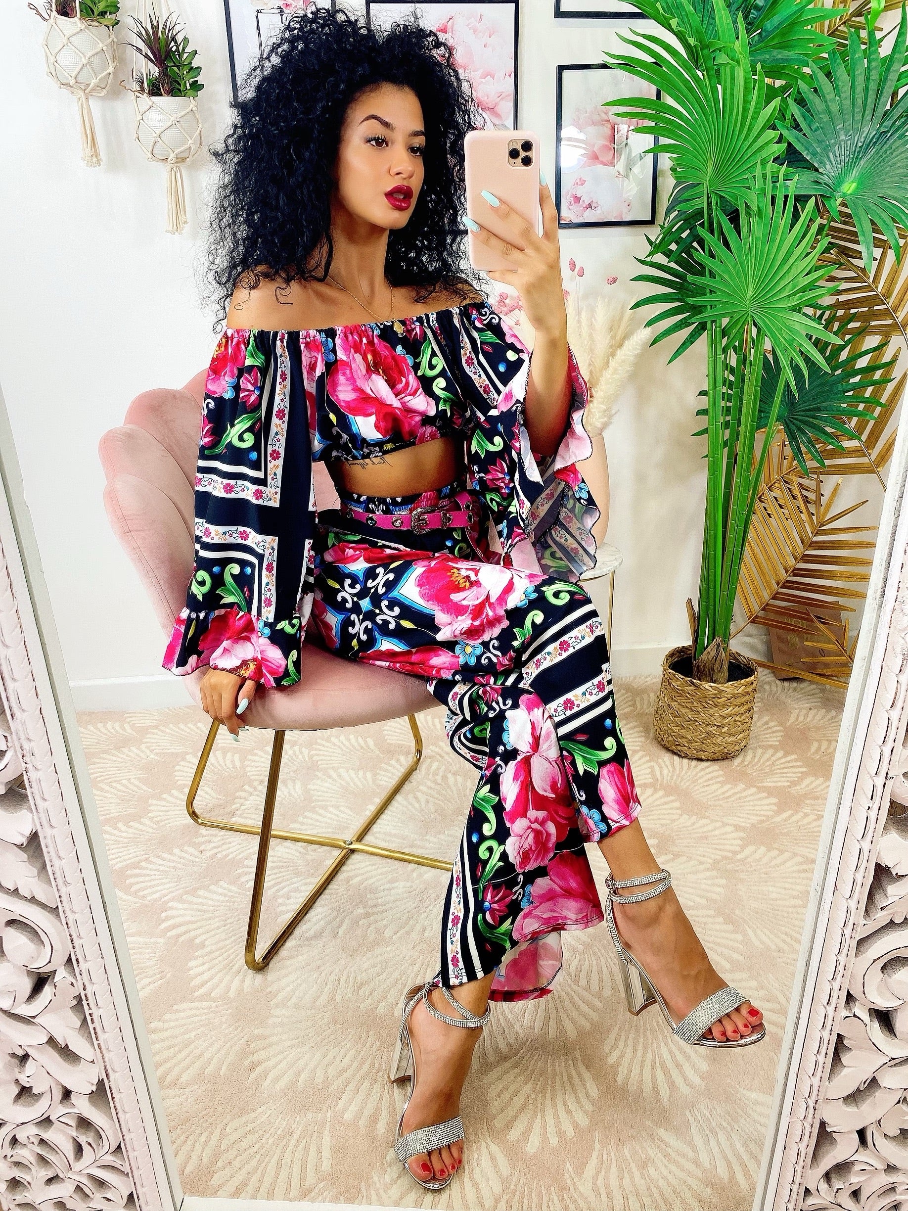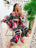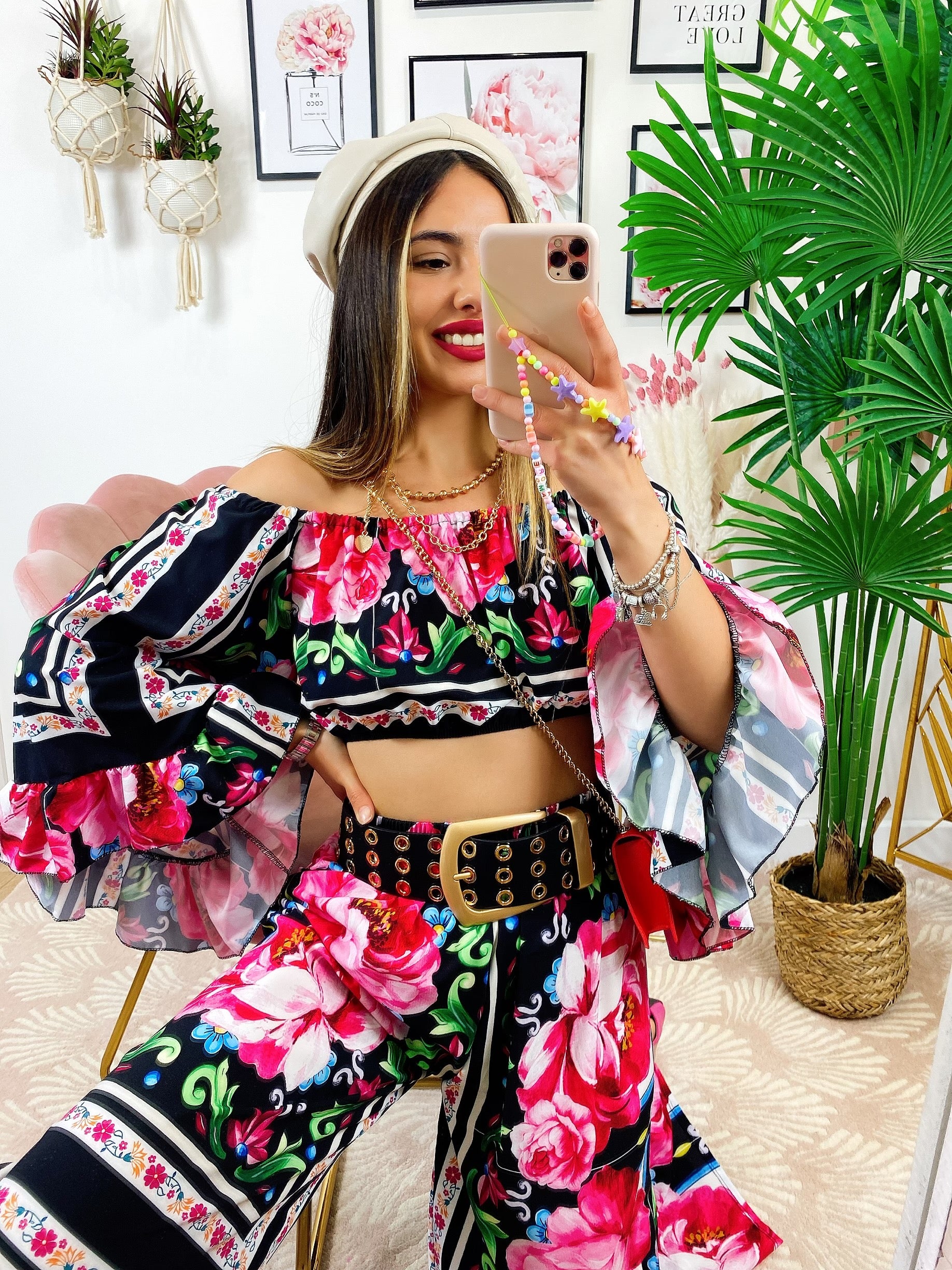 Completo stampa etnica Composto da pantalone a zampa con elastico in vita e top scollo a barchetta manica larga.