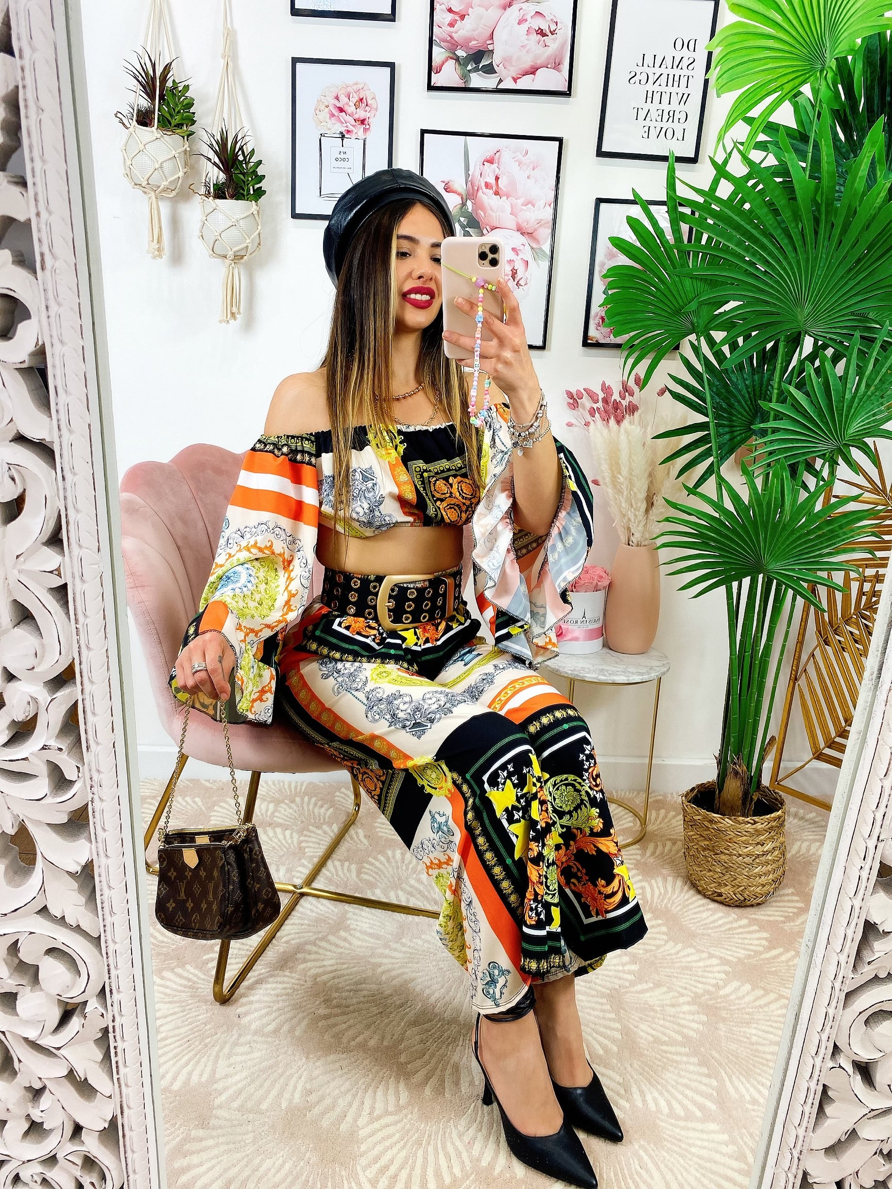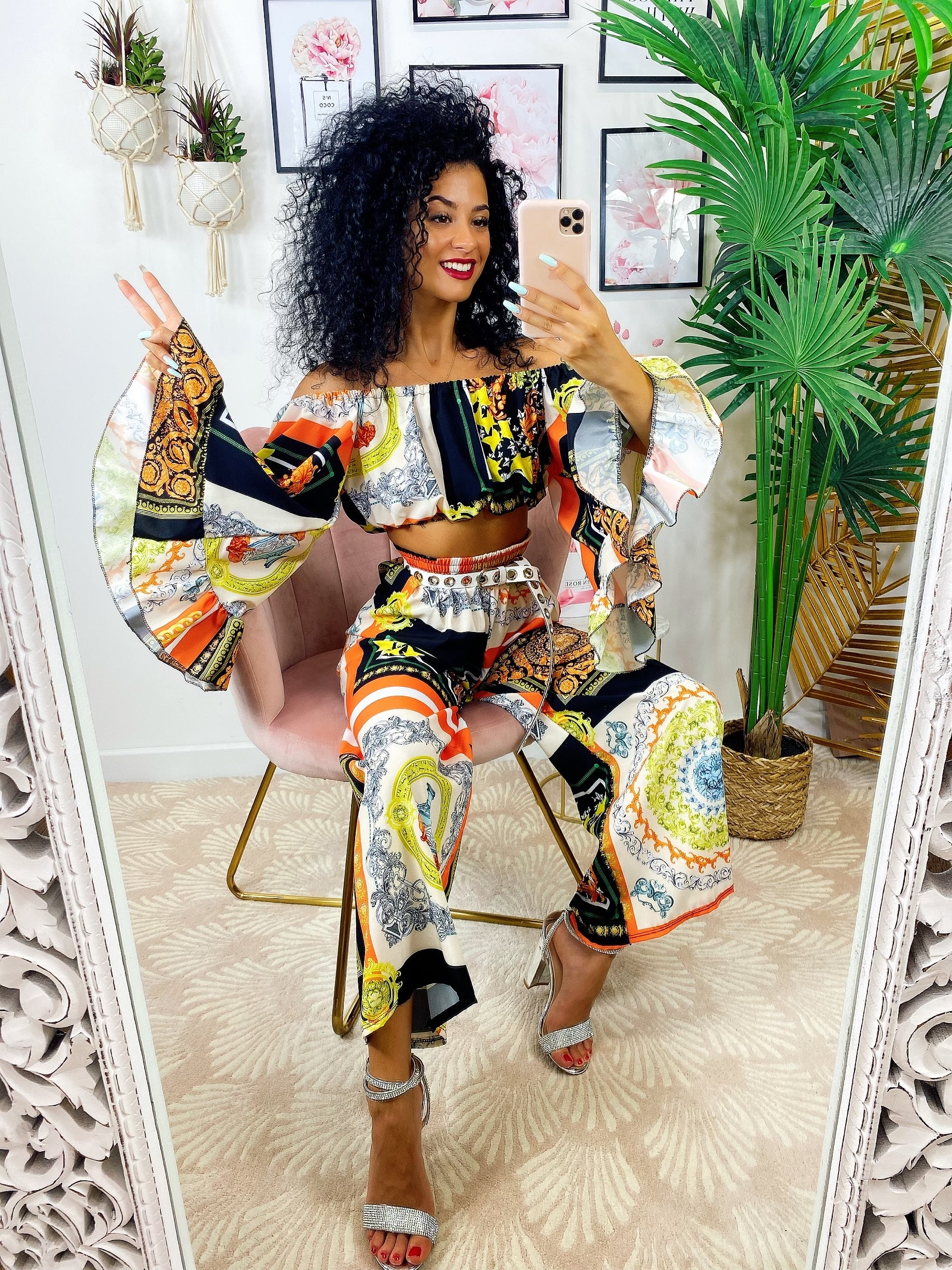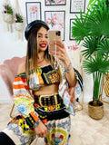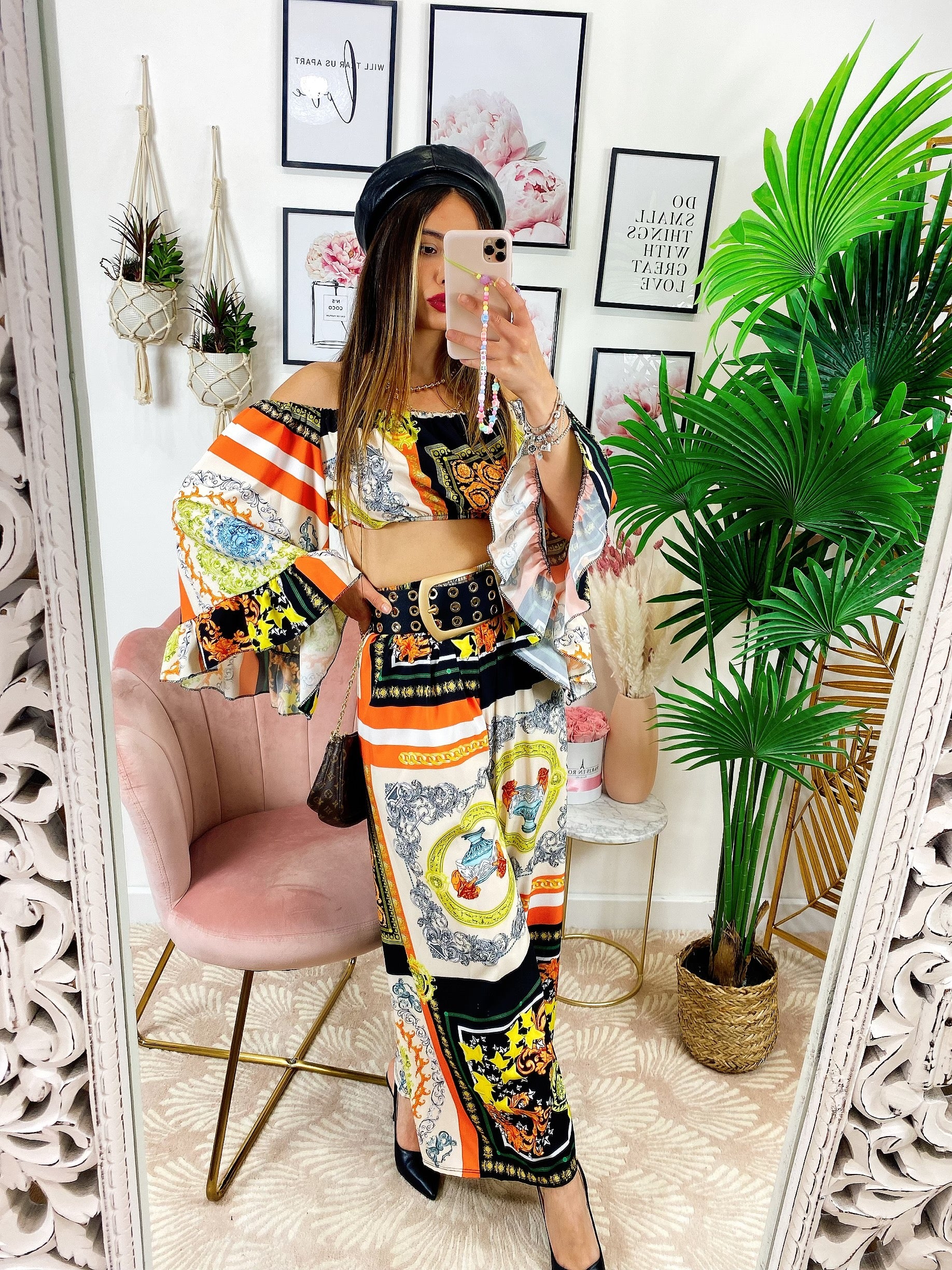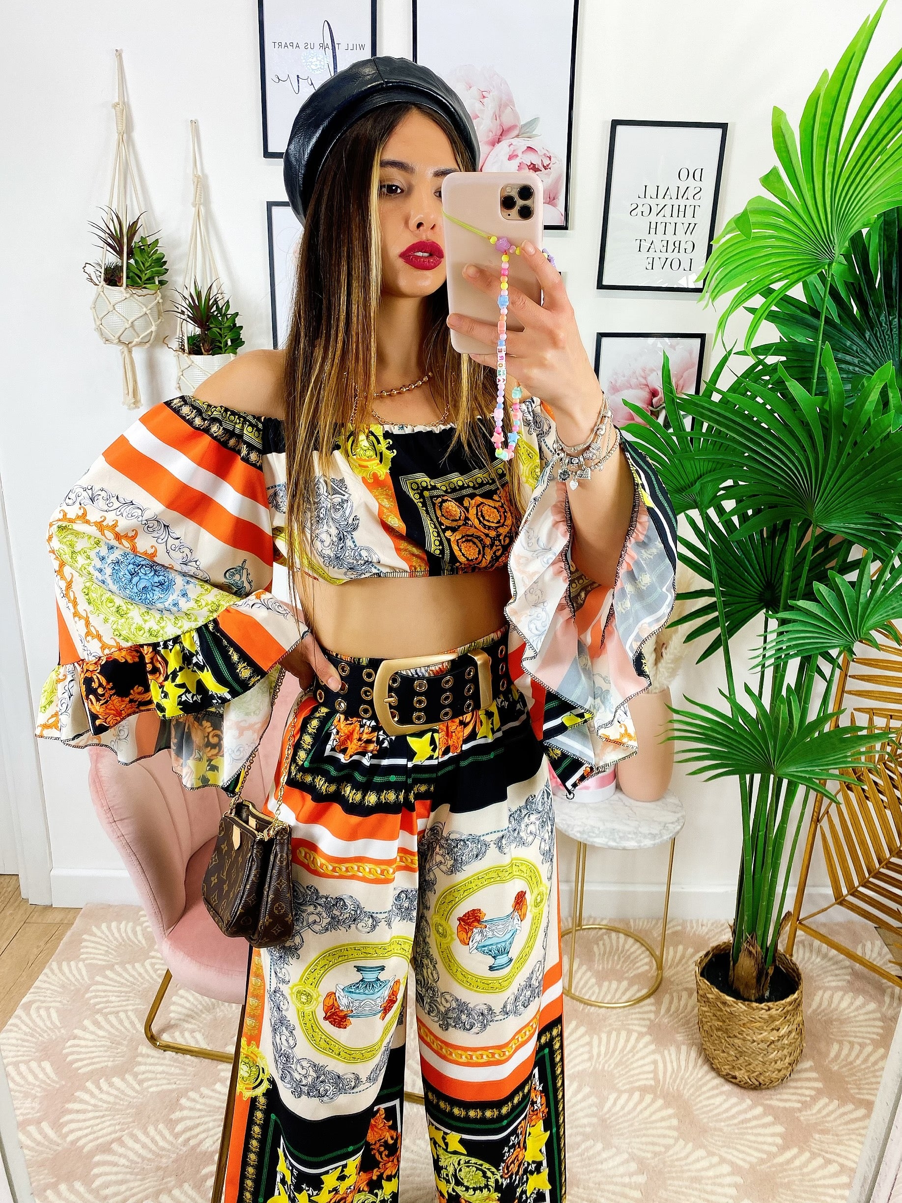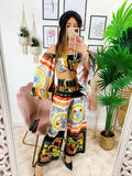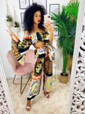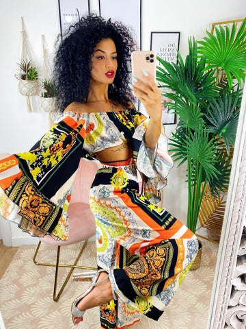 Completo stampa etnica Composto da pantalone a zampa con elastico in vita e top scollo a barchetta manica larga.