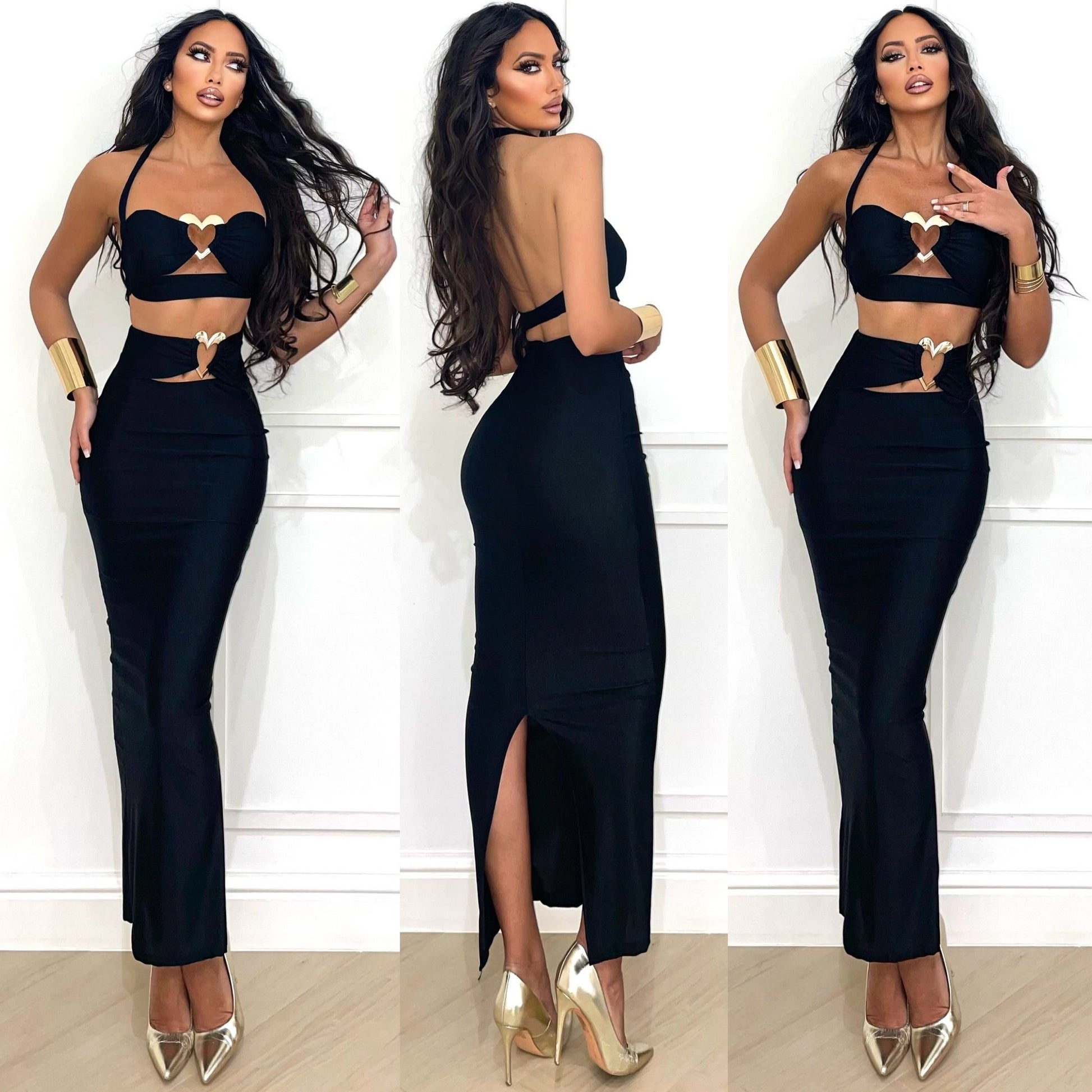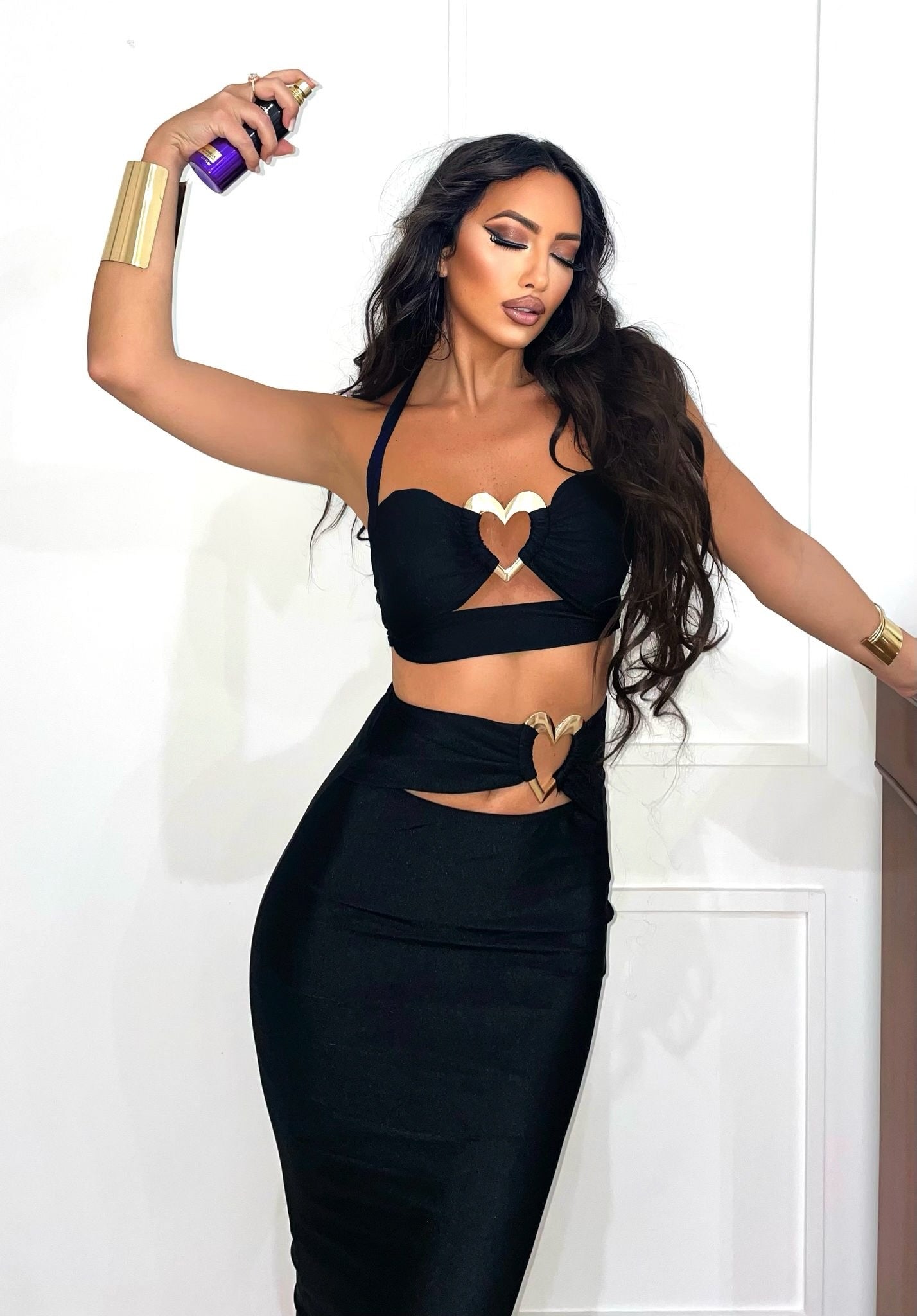 Completo in lycra due pezzi composto da top con cuore e coppe e gonna con cuore dettaglio oro