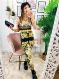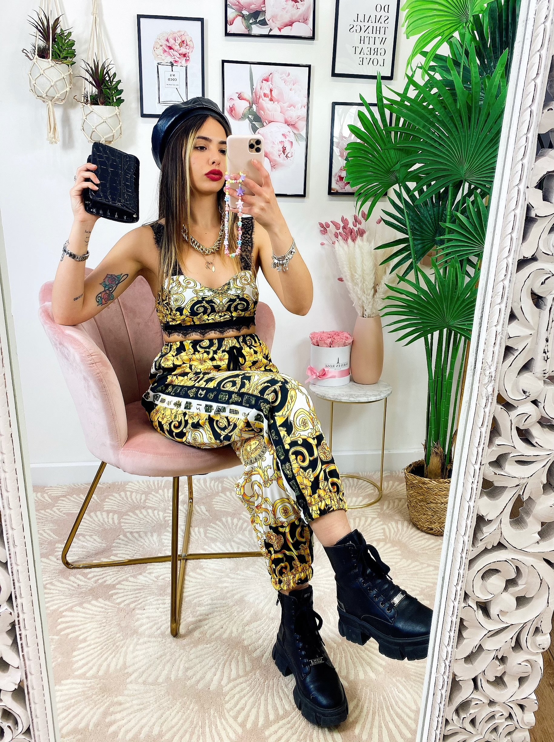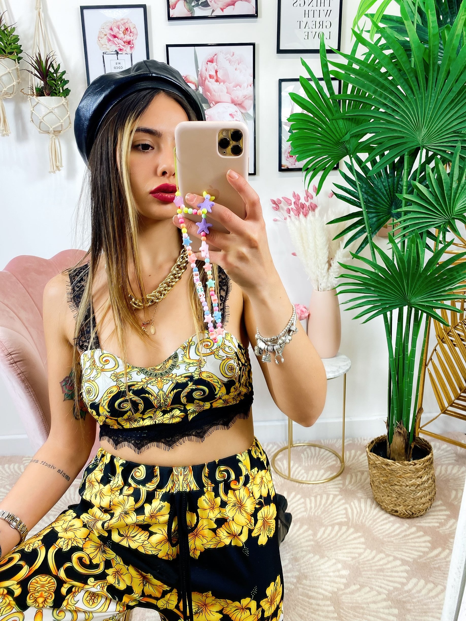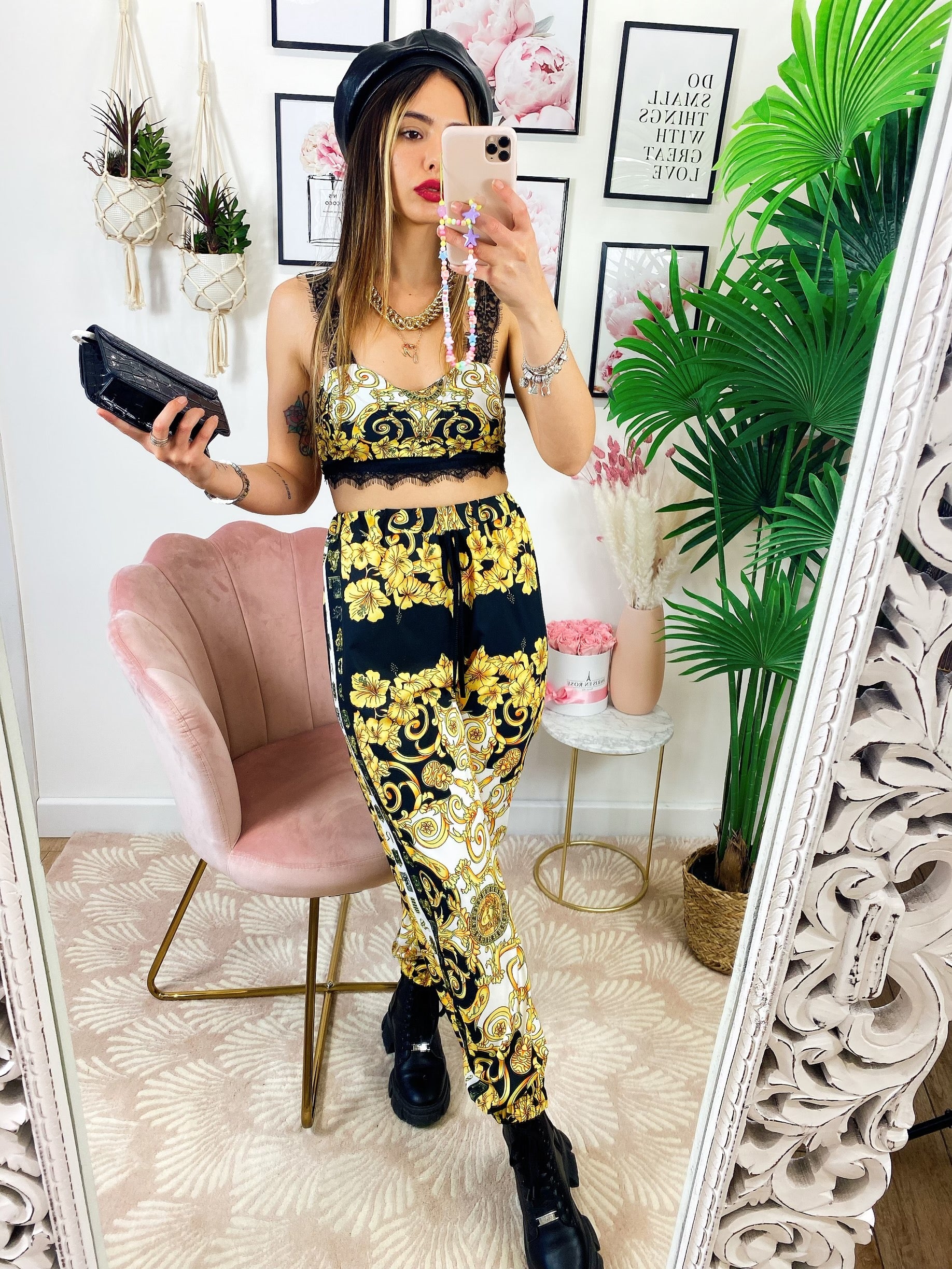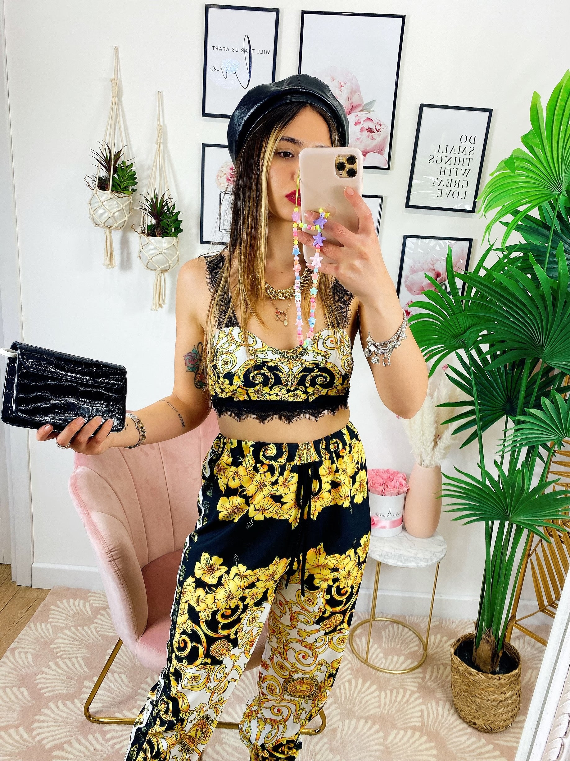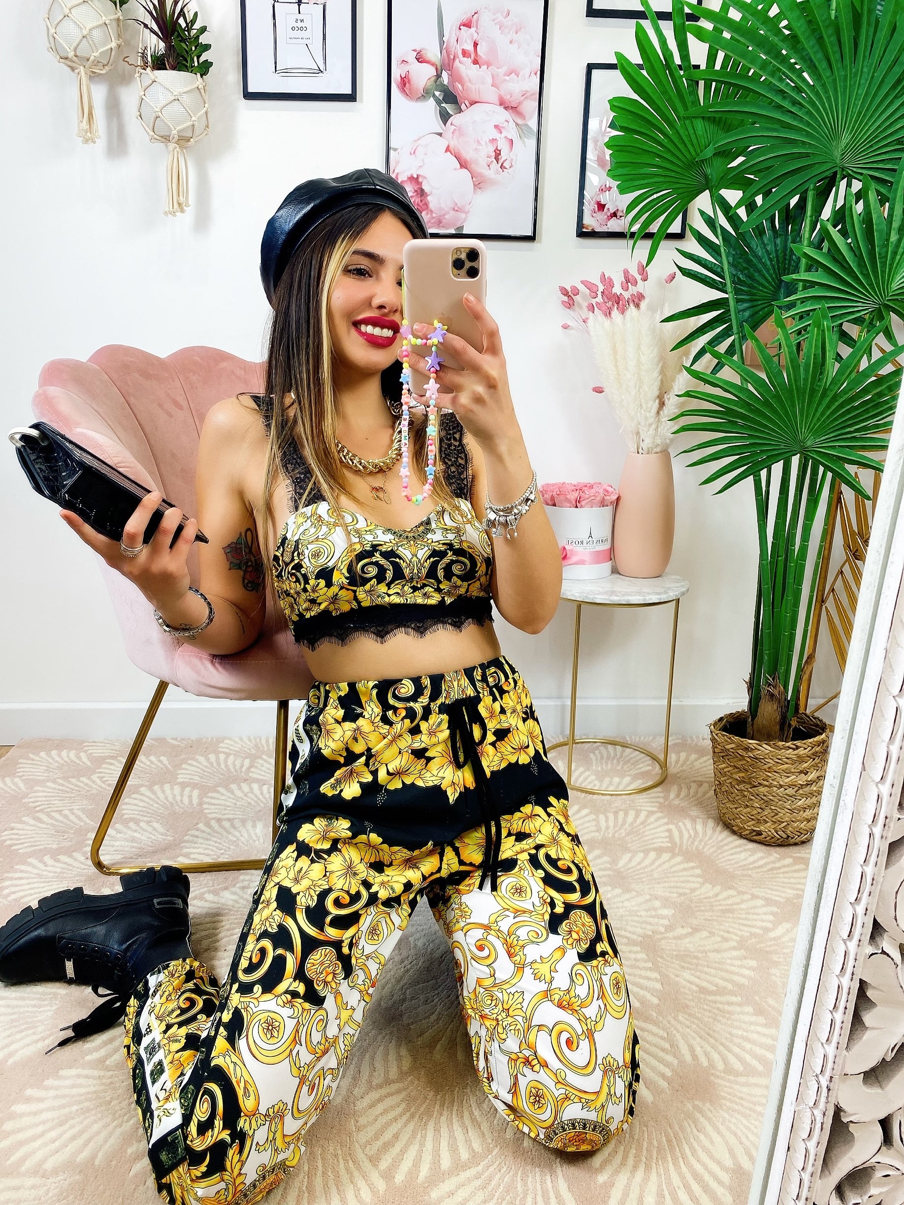 Completo stampa etnica Composto da pantalone a zampa con elastico in vita e top scollo con dettagli in pizzo.