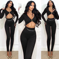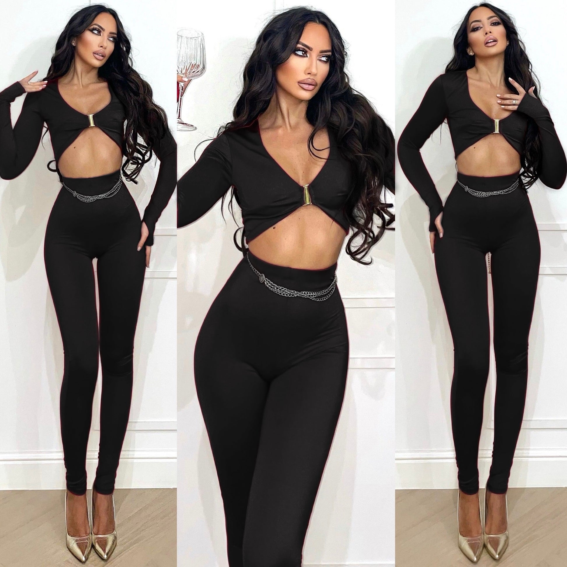 Completo due pezzi in lycra composto da top cromo senza coppe con gancio sul davanti e leggings aderente con arricciatura sulle caviglie