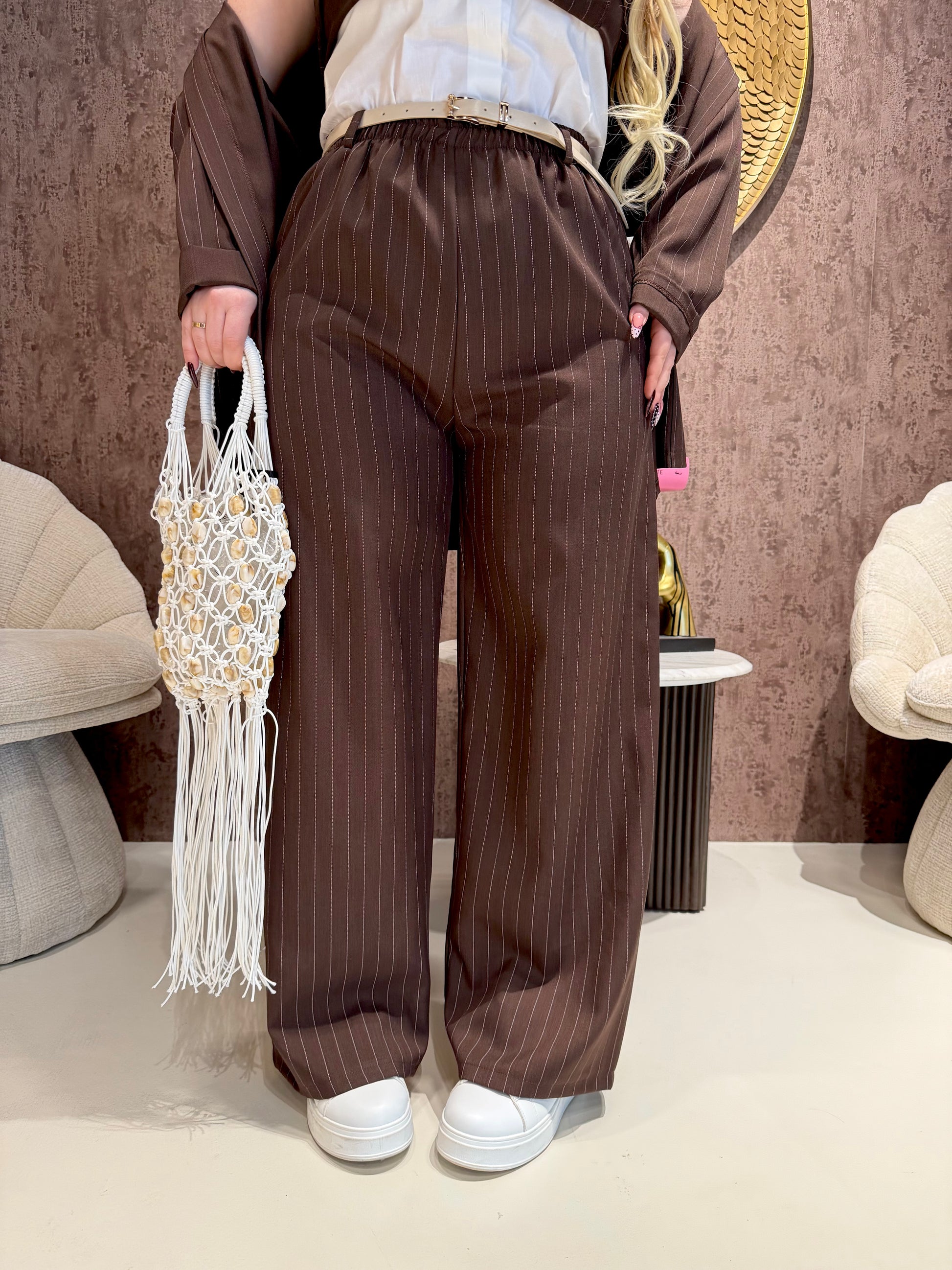Il completo tre pezzi a righe è composto da pantaloni con cintura, gilet con bottoni e giacca, tutti in un elegante tono su tono a righe. Questo ensemble offre un look coordinato e formale, adatto per occasioni professionali e eventi speciali, garantendo una vestibilità confortevole e un'ottima presentazione.