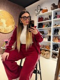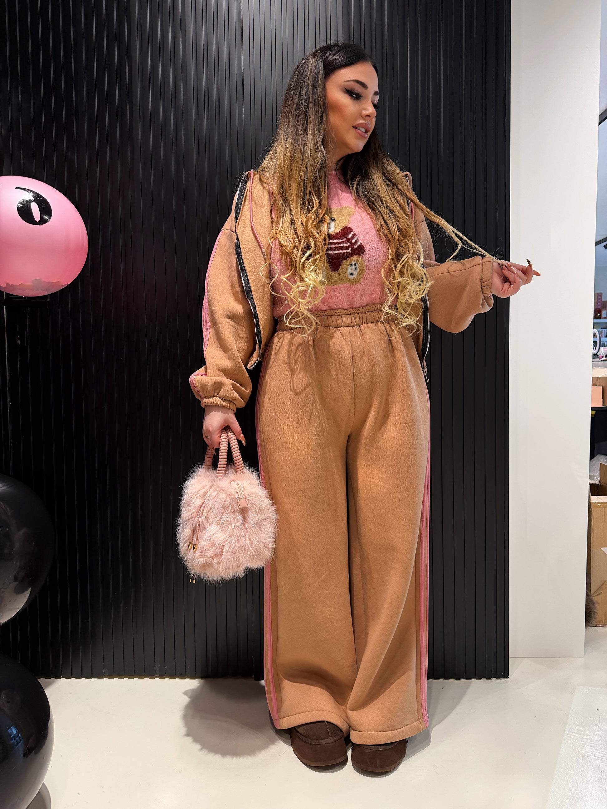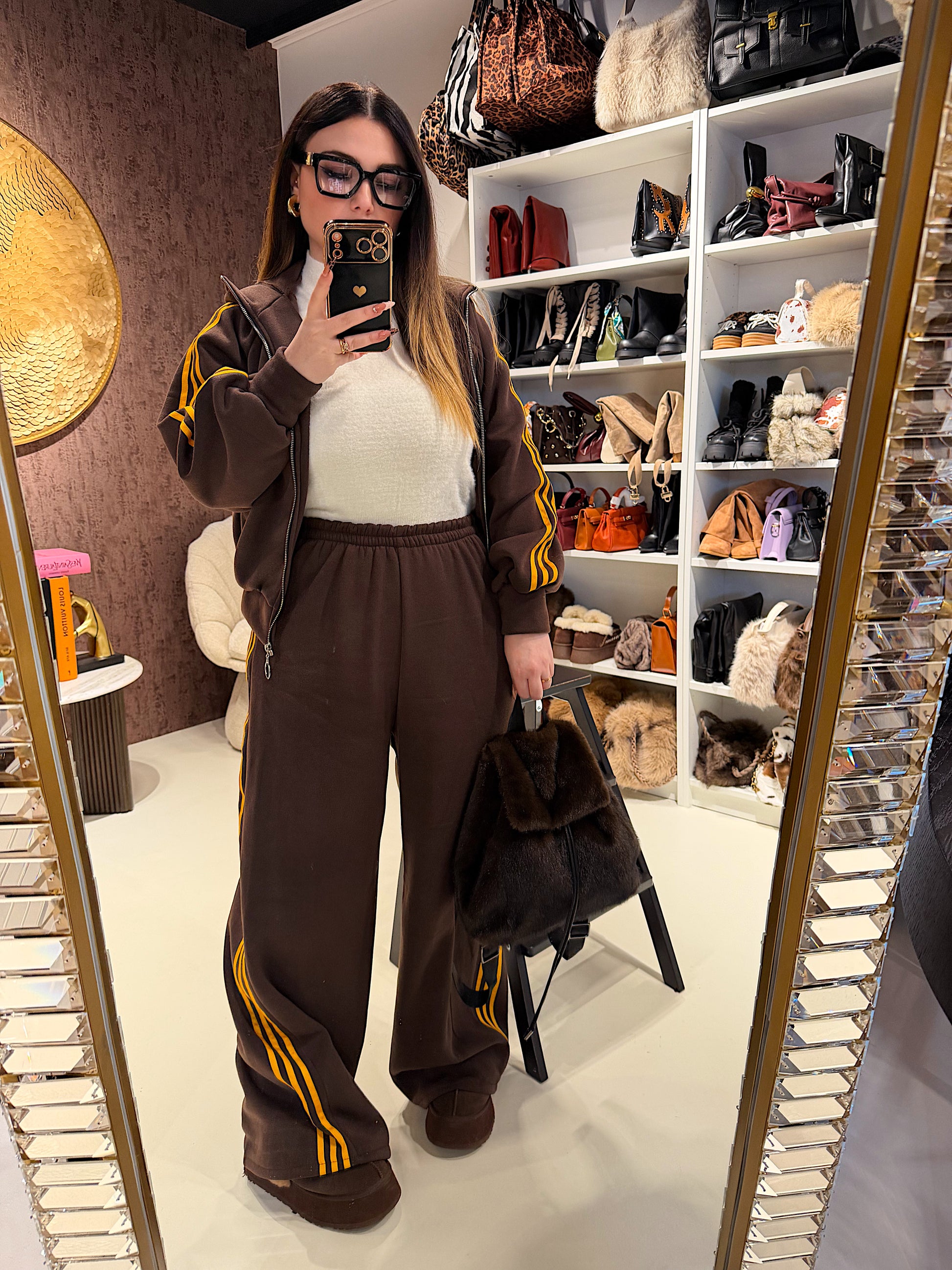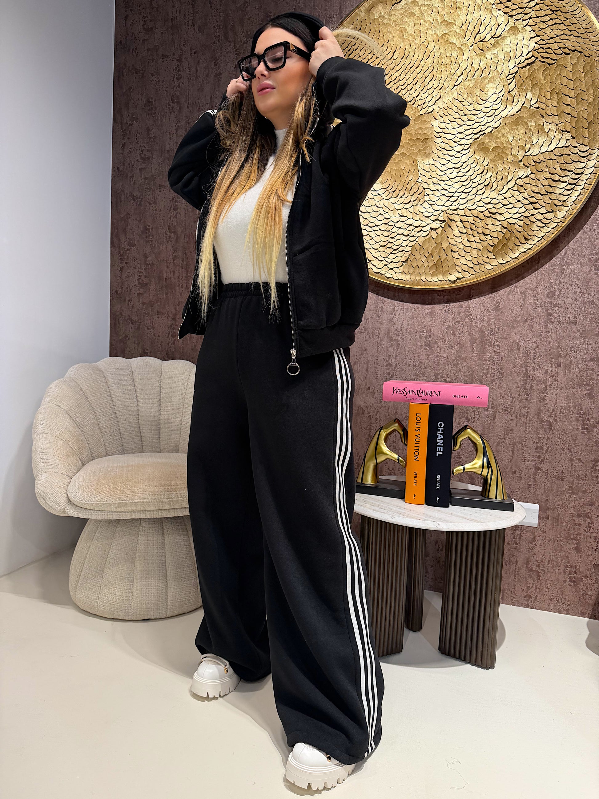 Completo tuta in tessuto felpato super morbido, composto da felpa con zip e cappuccio e pantalone con bande laterali a contrasto.