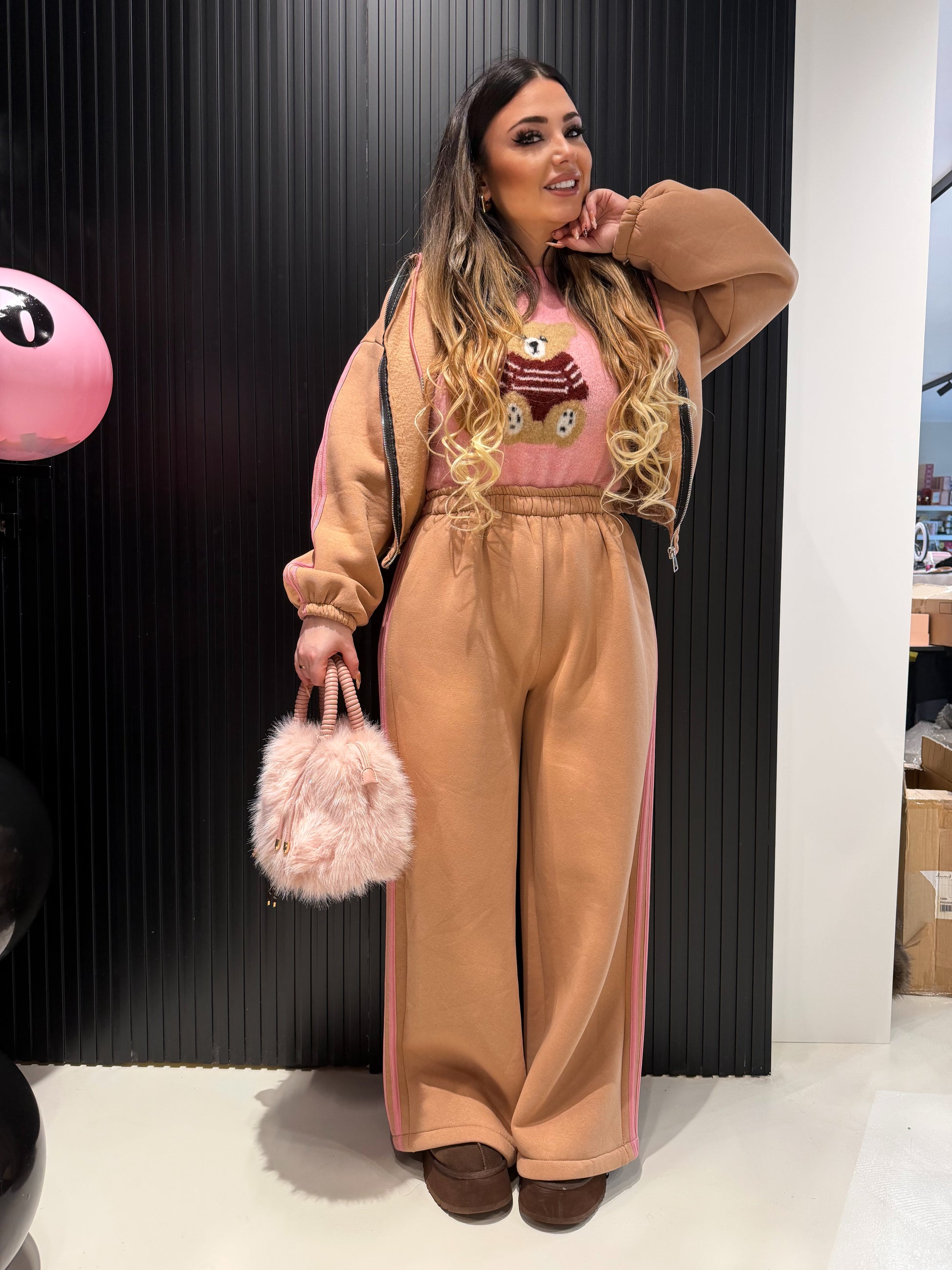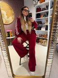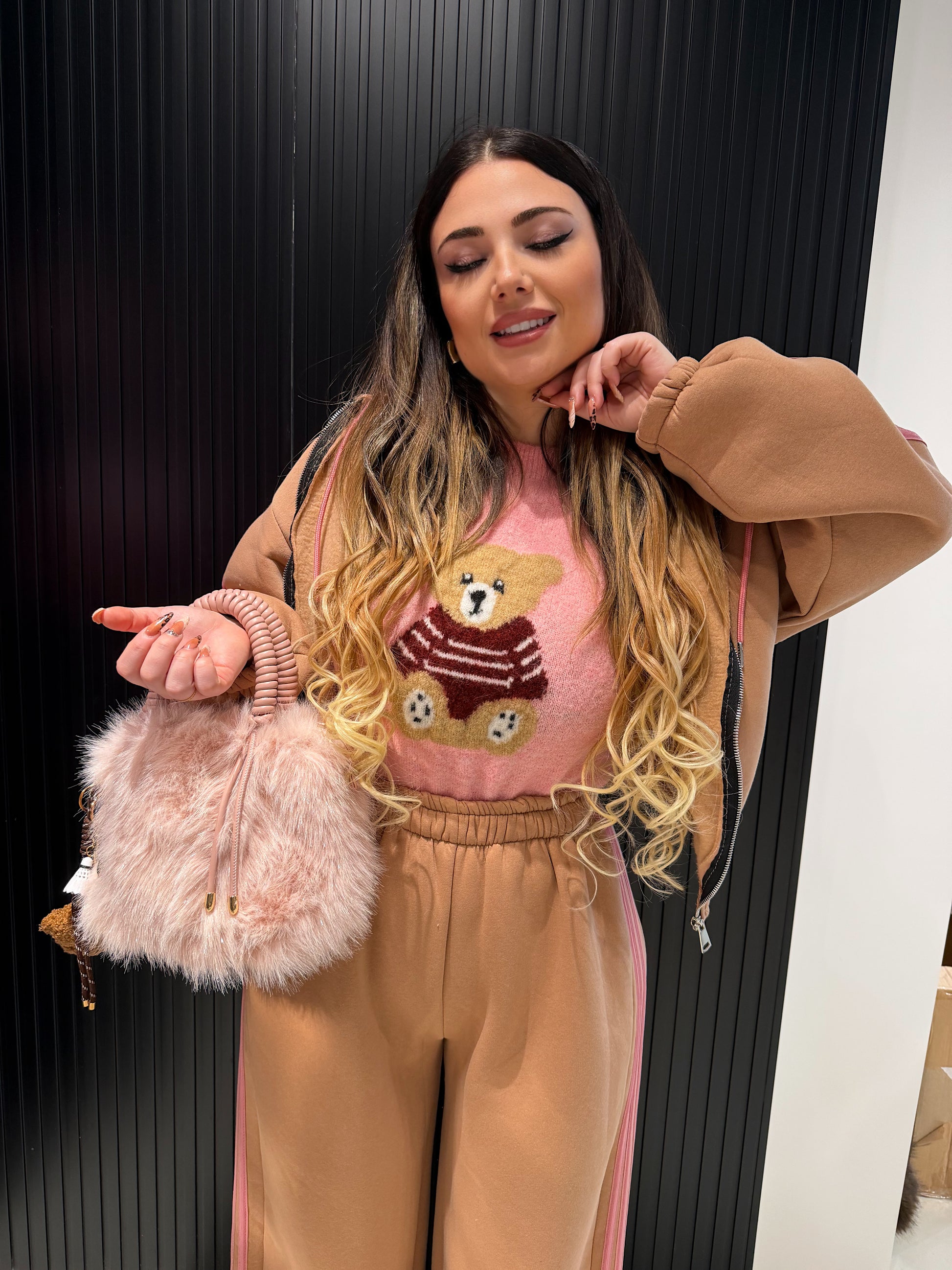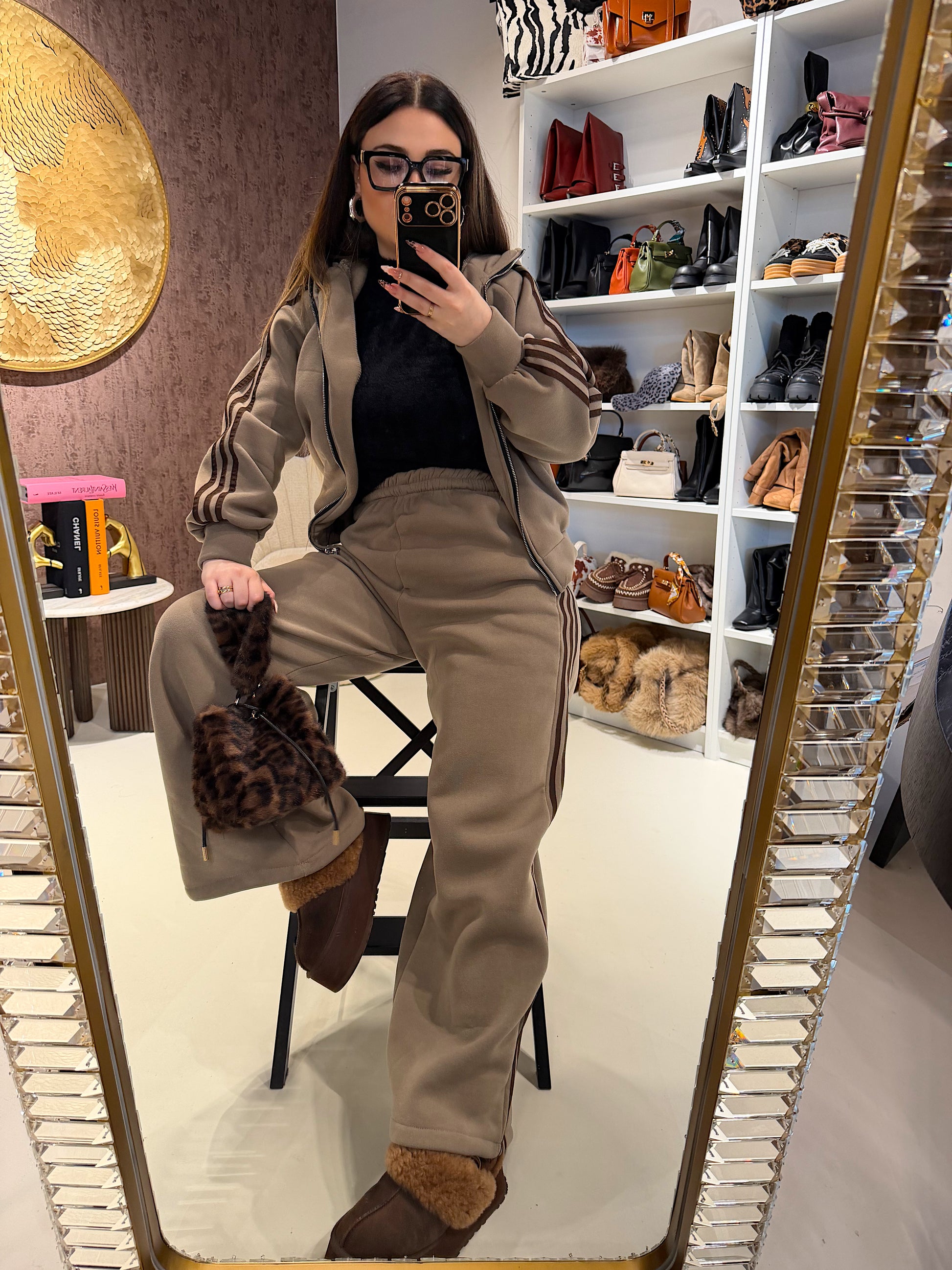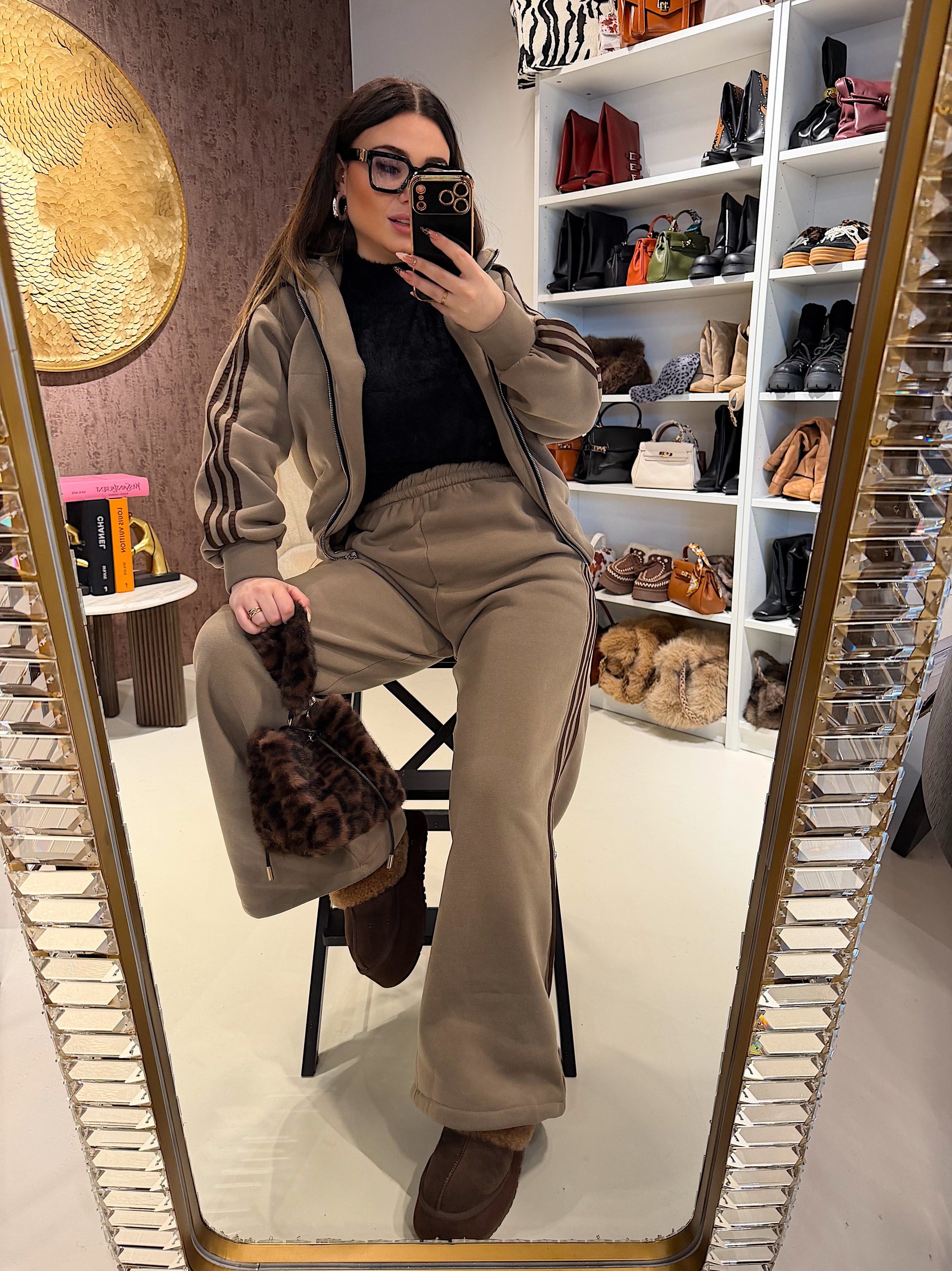 Completo tuta in tessuto felpato super morbido, composto da felpa con zip e cappuccio e pantalone con bande laterali a contrasto.