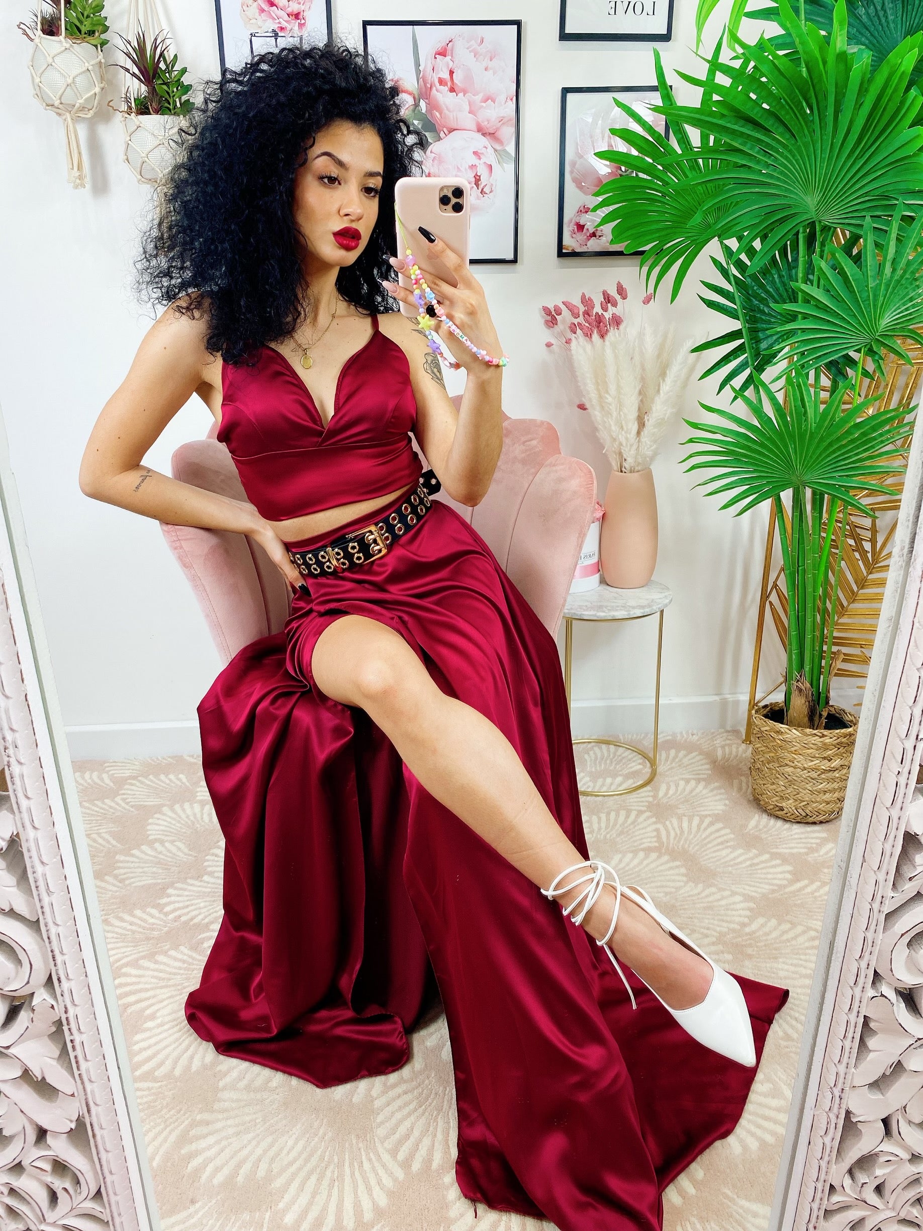 Completo venere in raso con top elasticizzato e gonna con ampio spacco. Ottima qualità