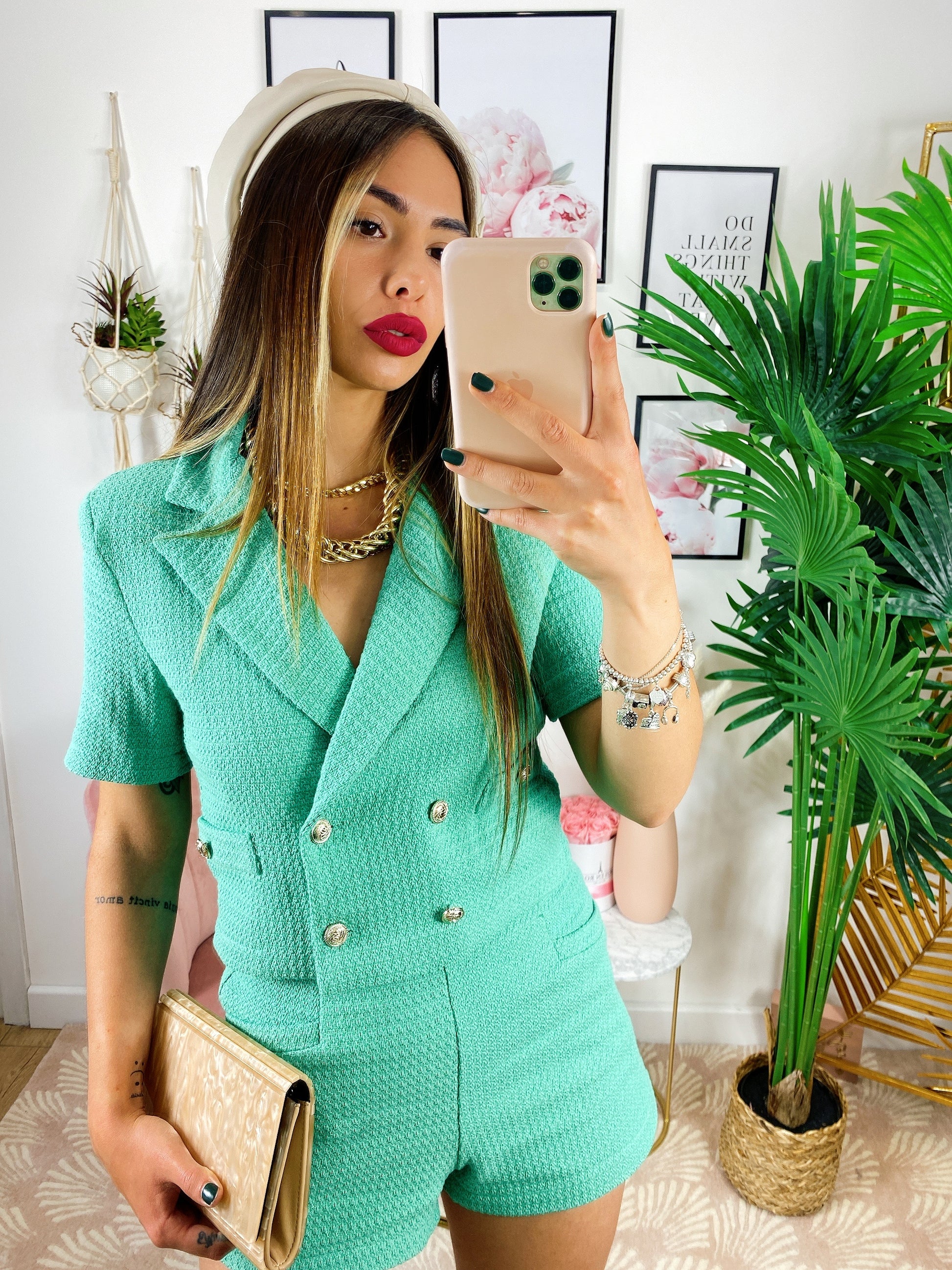 Completo color verde con bottoni oro composta da Short più giacca con tasche leggermente elasticizzato.