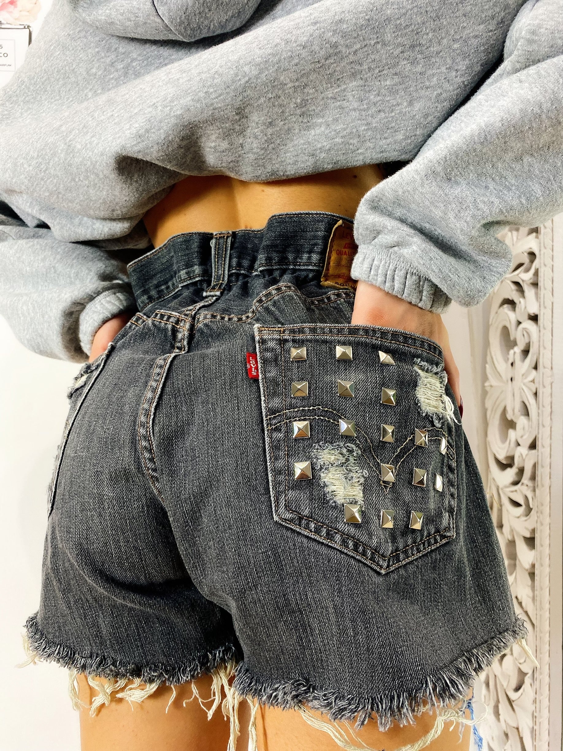 Short Vintage Levi’s alta qualità con strappi. Jeans vintage lavorati a mano Considerati pezzi unici poichè interamente Personalizzati. Lievi differenze rispetto alla foto ne denotano l'unicità e la sua completa lavorazione handmade.