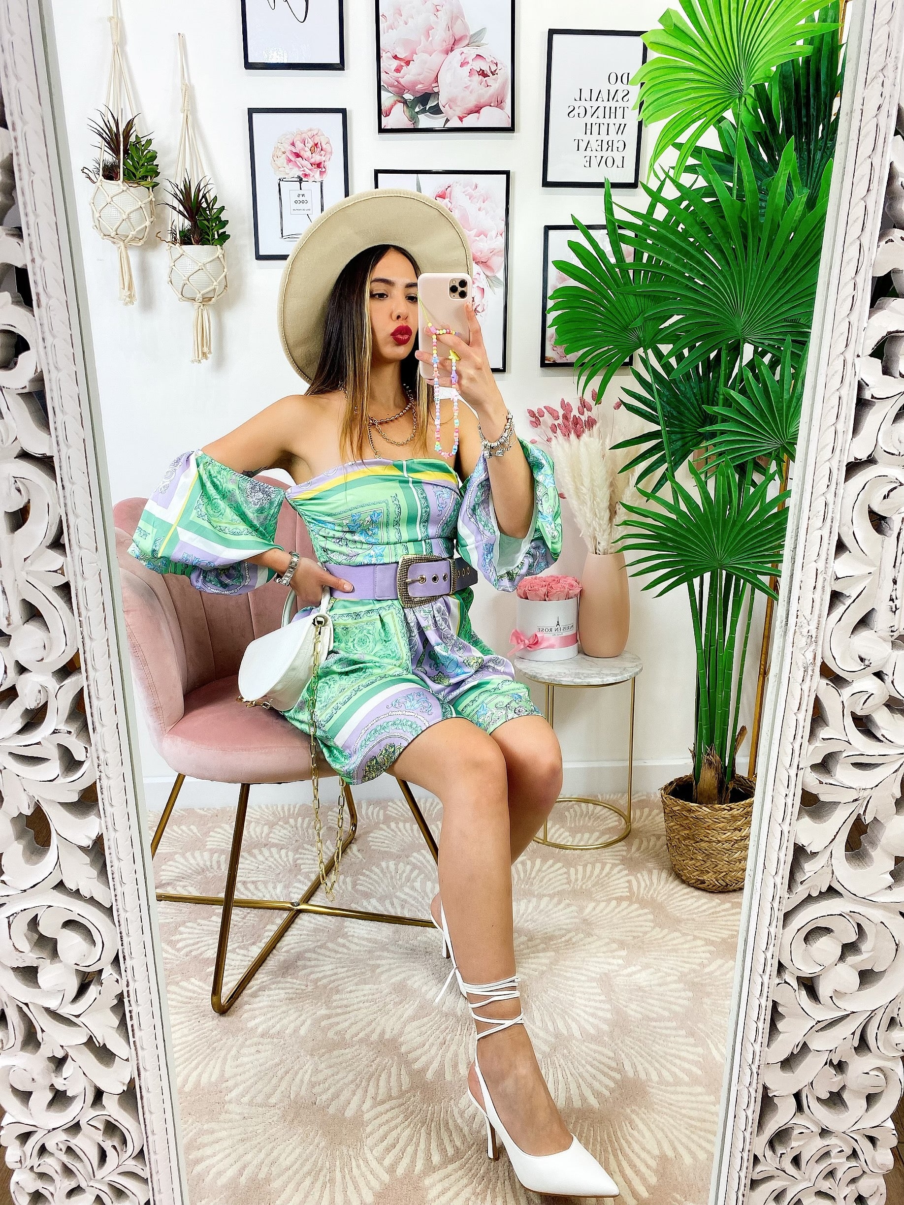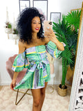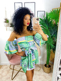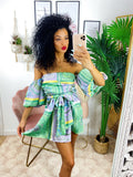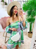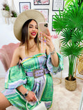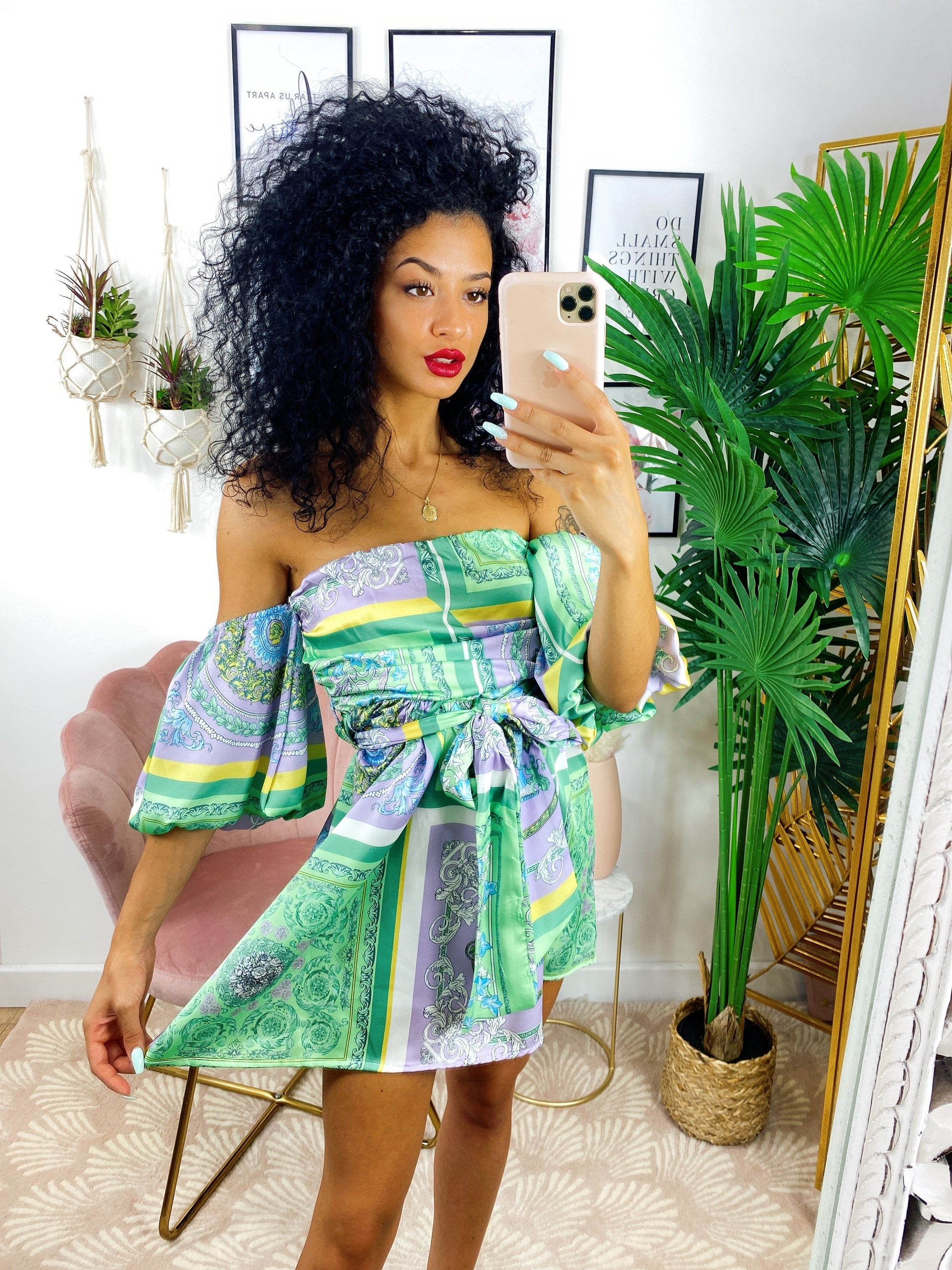 Abito scollo a barchetta stampa etnica Con manica a palloncino e cintura compresa.