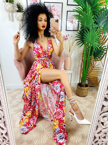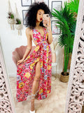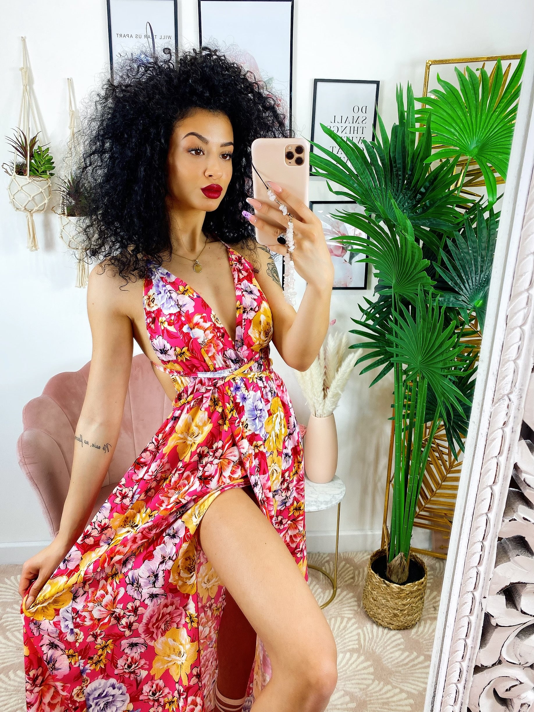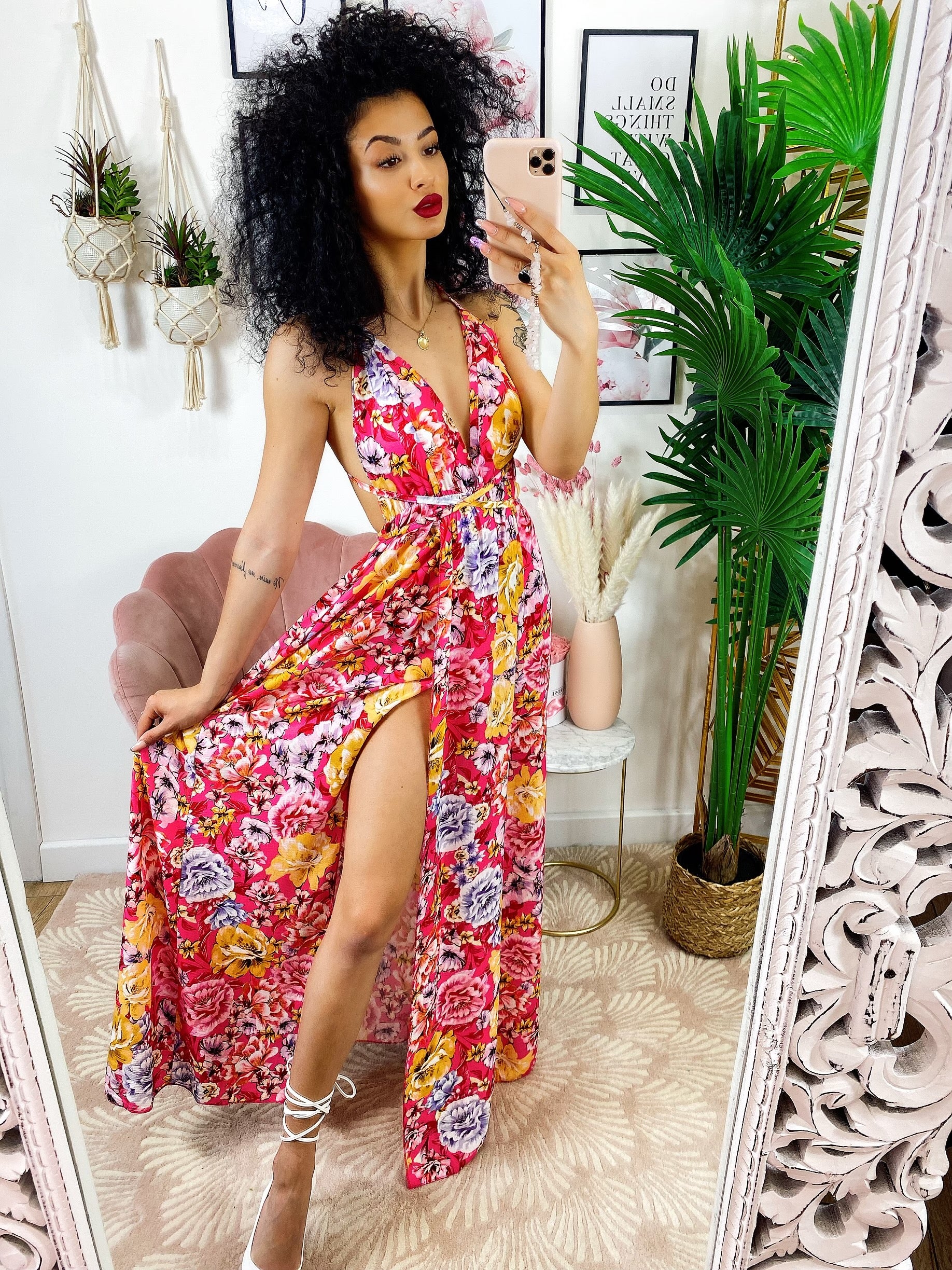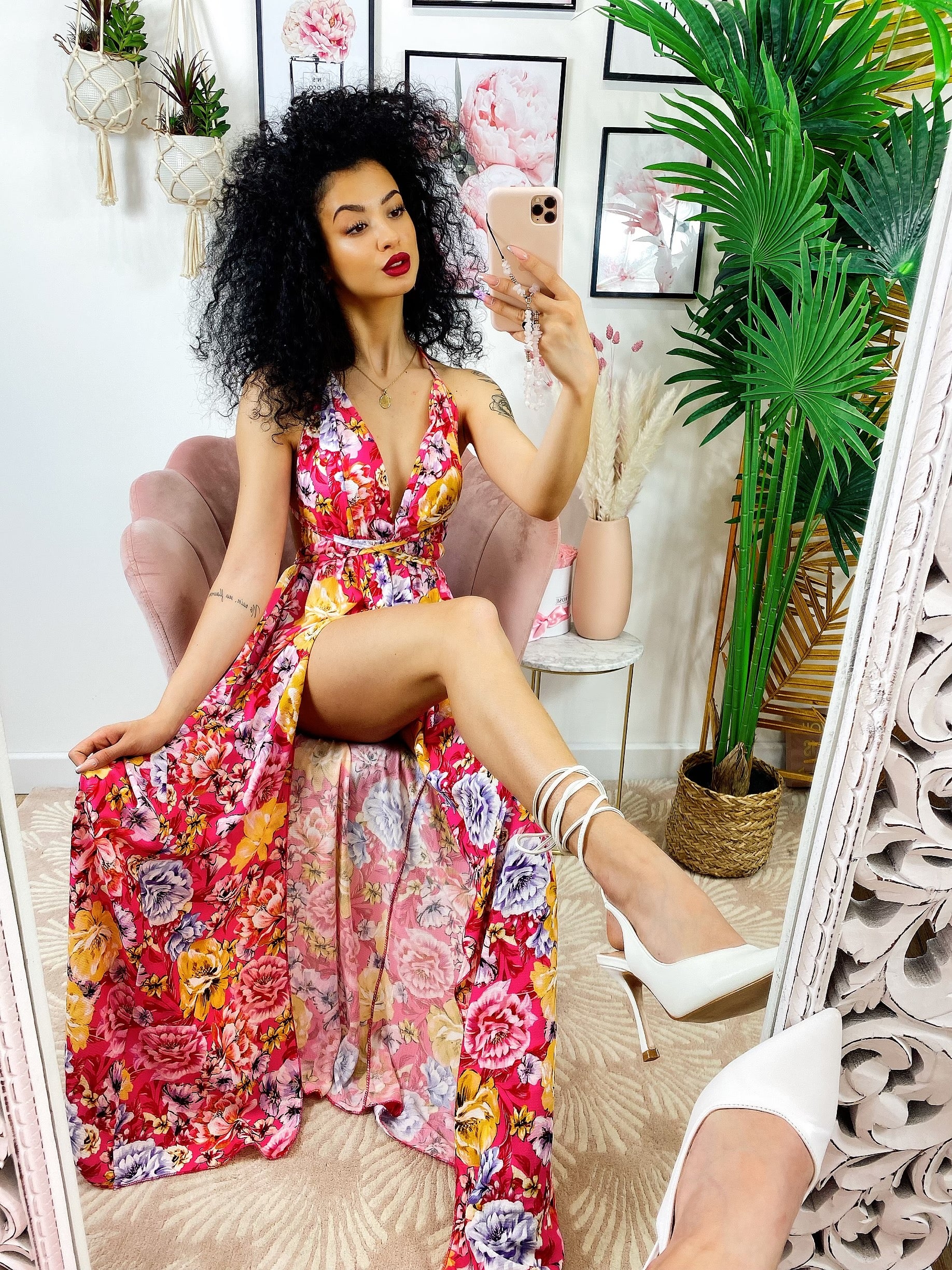 Dress Afrodite, abito lungo con maxi spacco. Con coppe e con possibilità di diverse modalità d'incrocio: a X dietro la schiena o solo al collo. In raso.