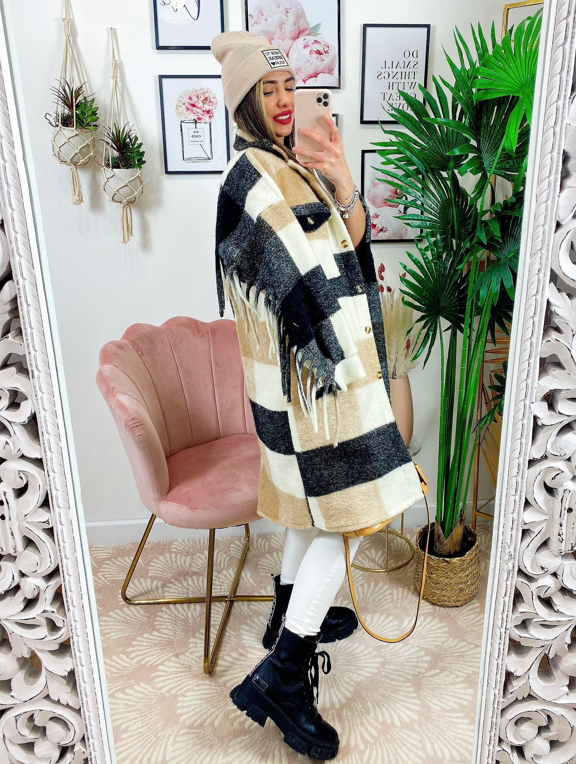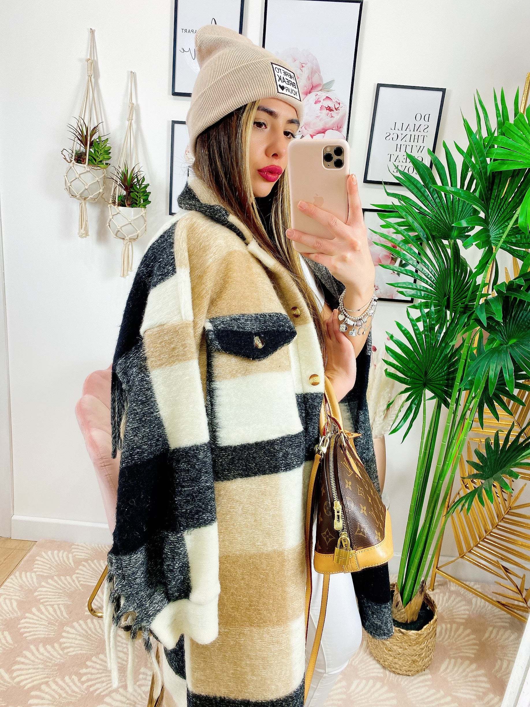 Giacca a quadri Beige nero lunga con frange