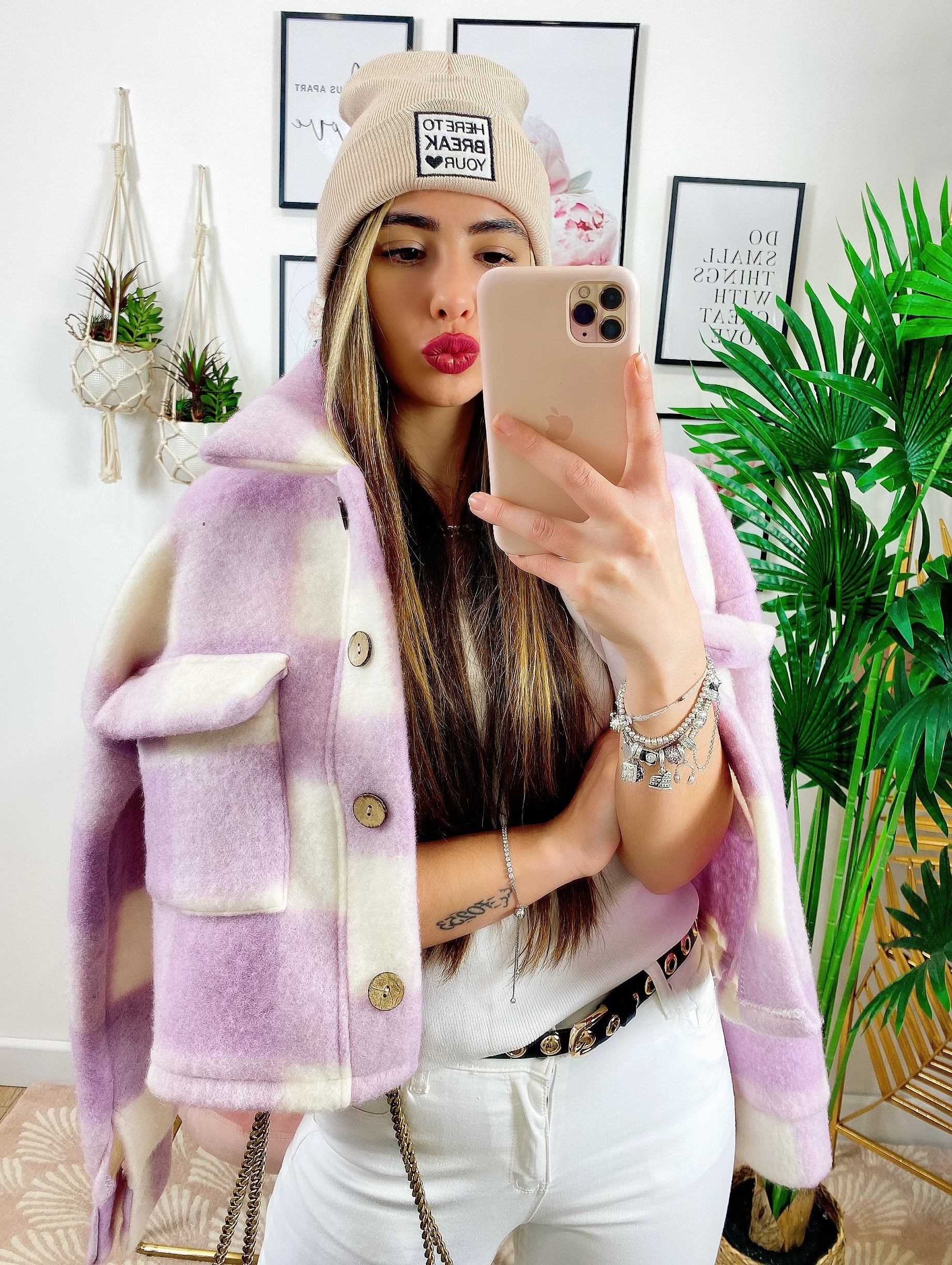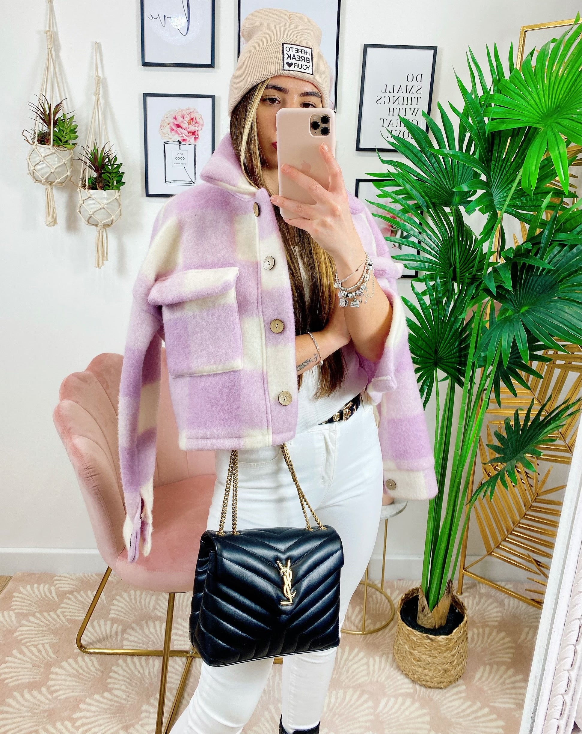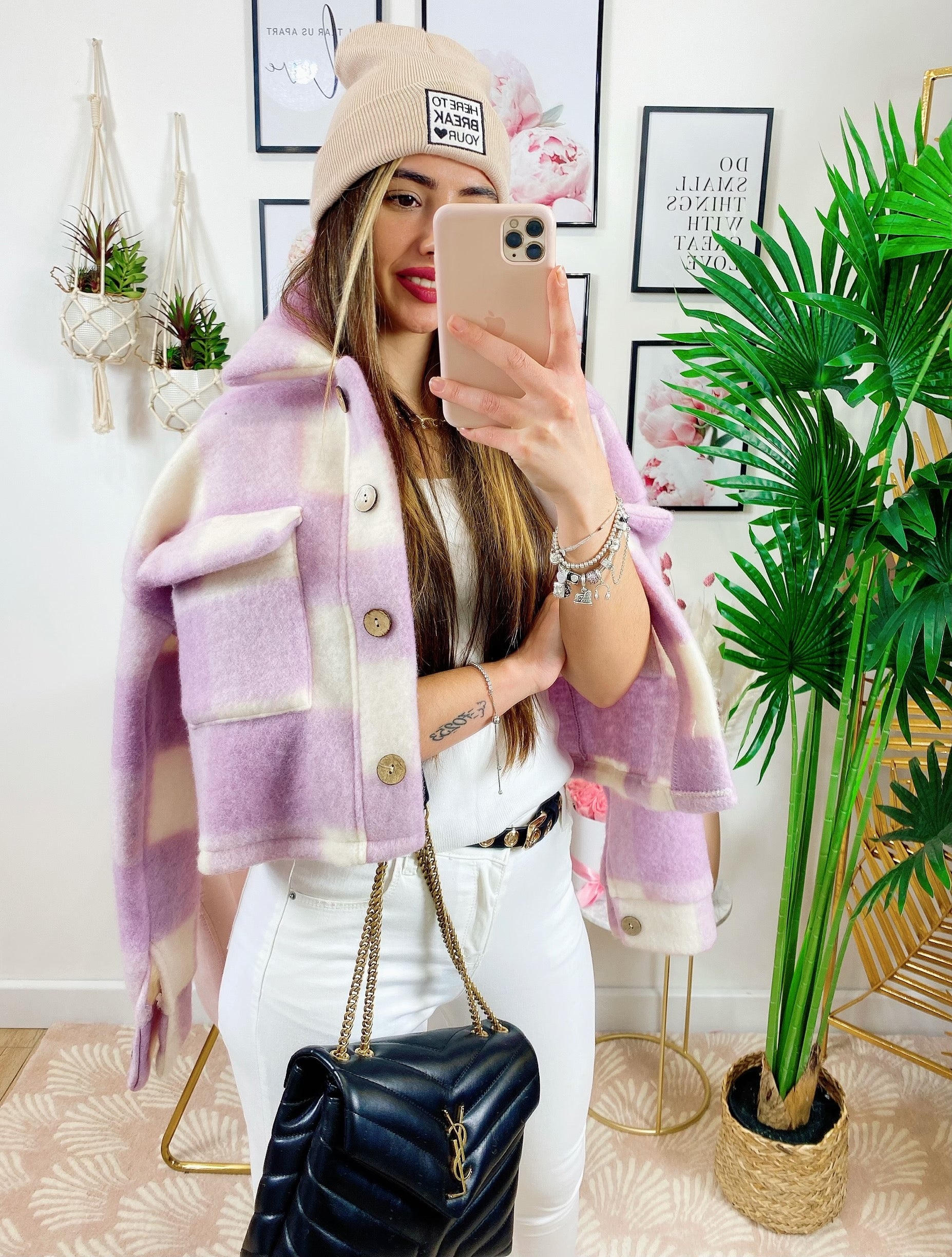 Giacca a quadri lilla corta Con bottoni e tasche davanti.